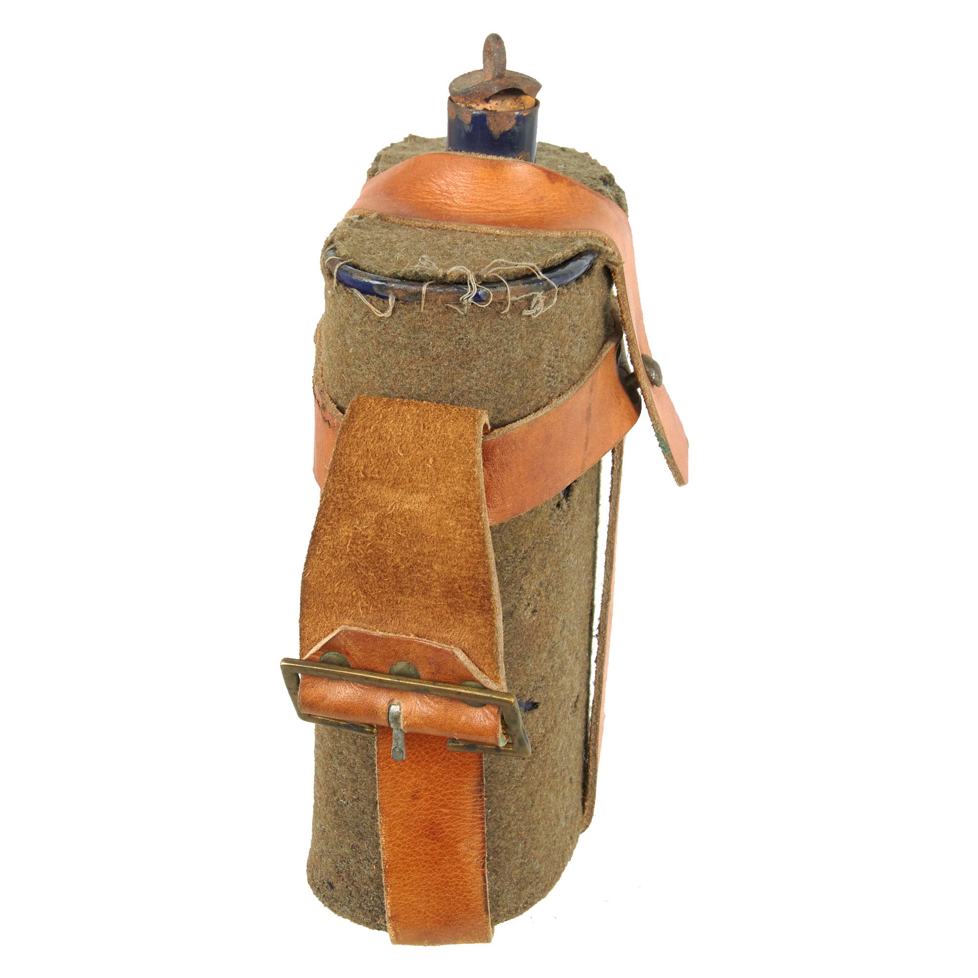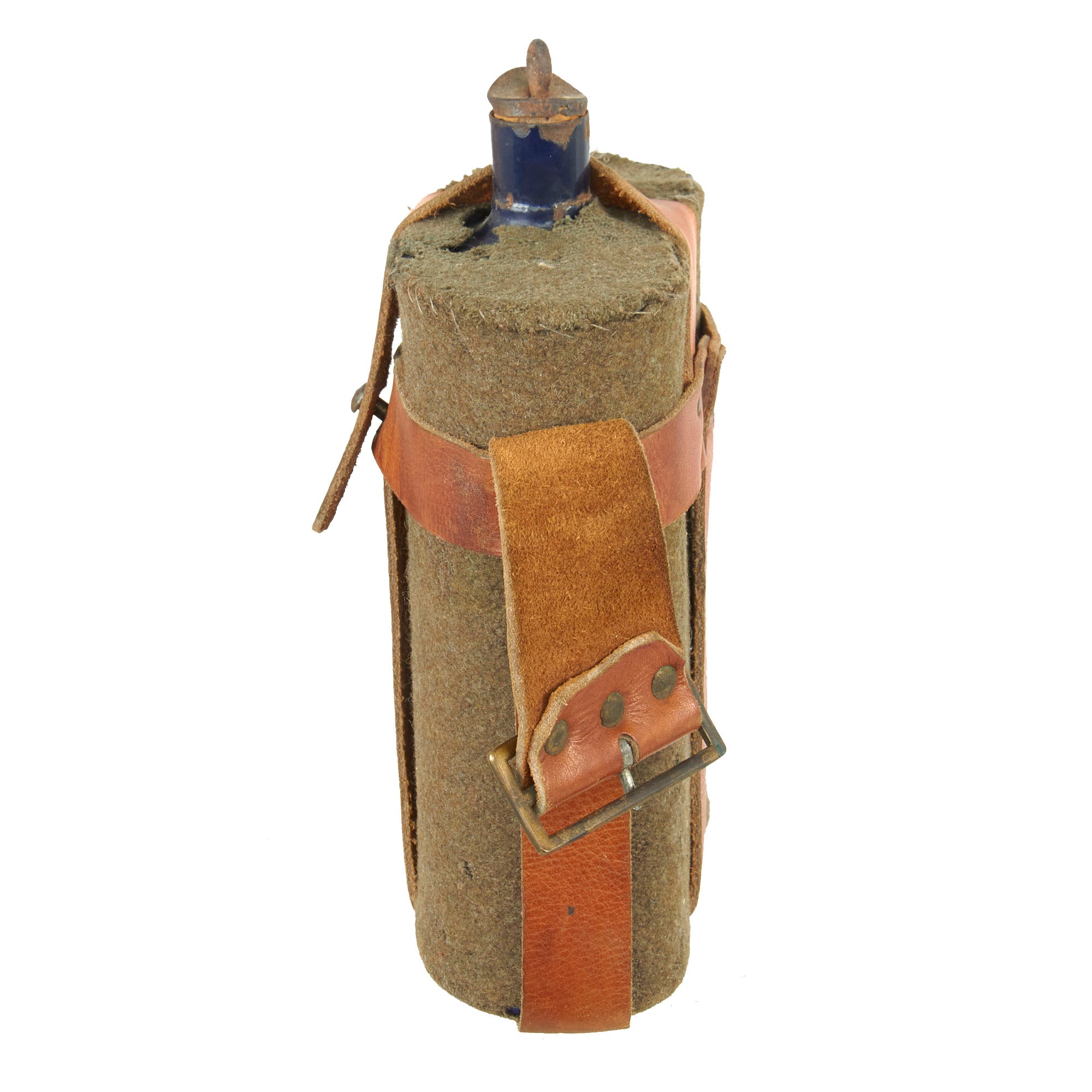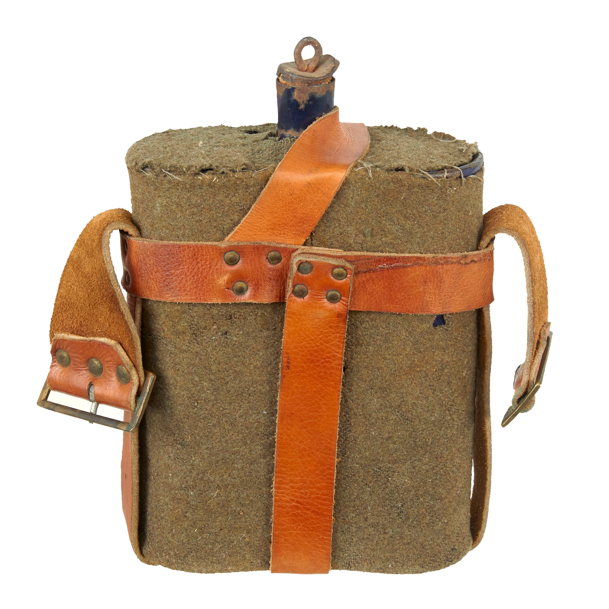 Original Item: Only One Available. This is a wonderful example of a service-used First World War Australian P-1915 Canteen, complete with its harness. There is some moth damage as shown, with the top of the cover appearing very weak.