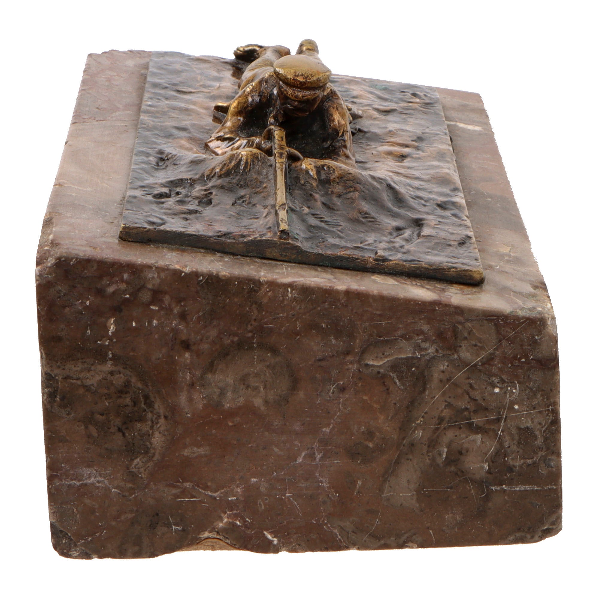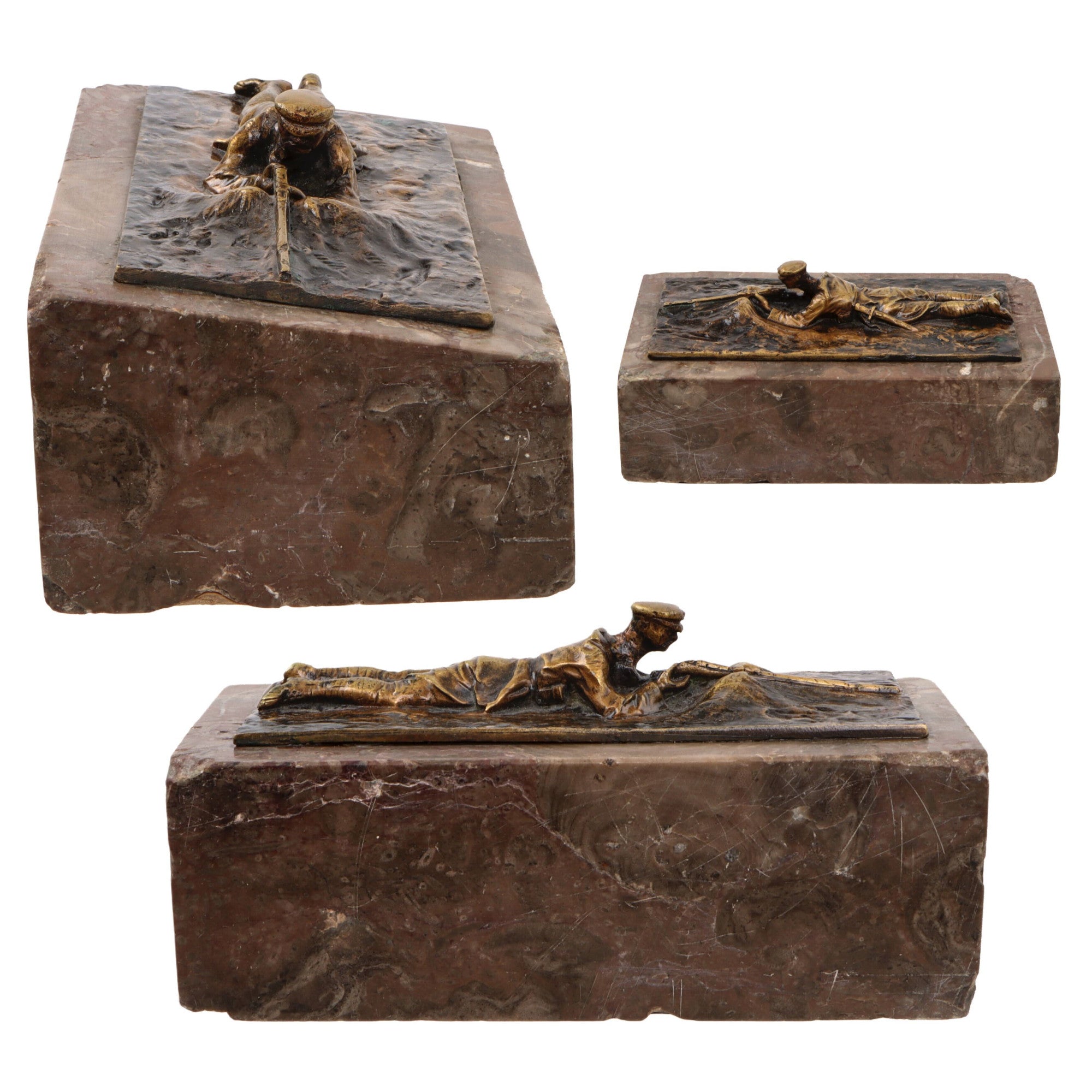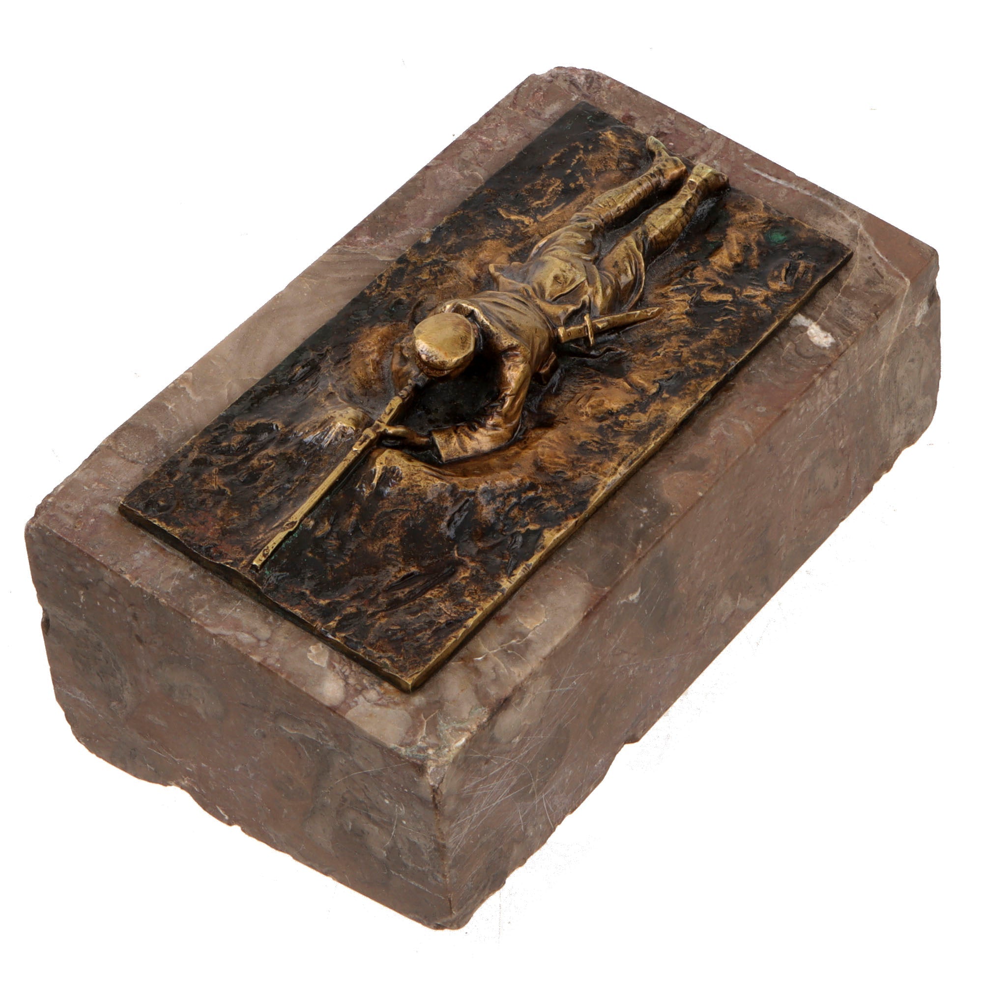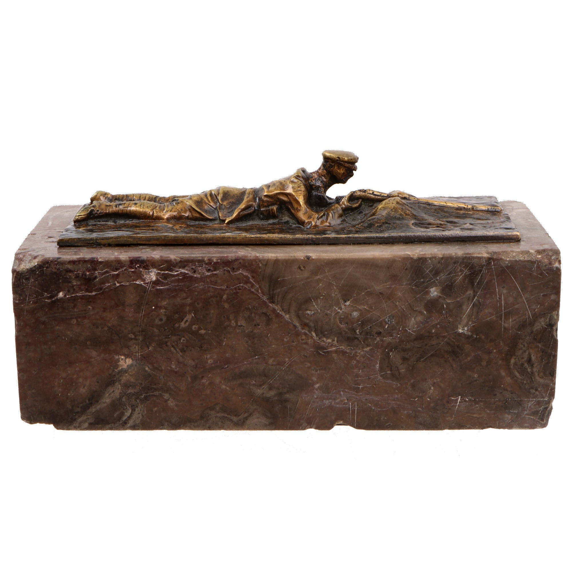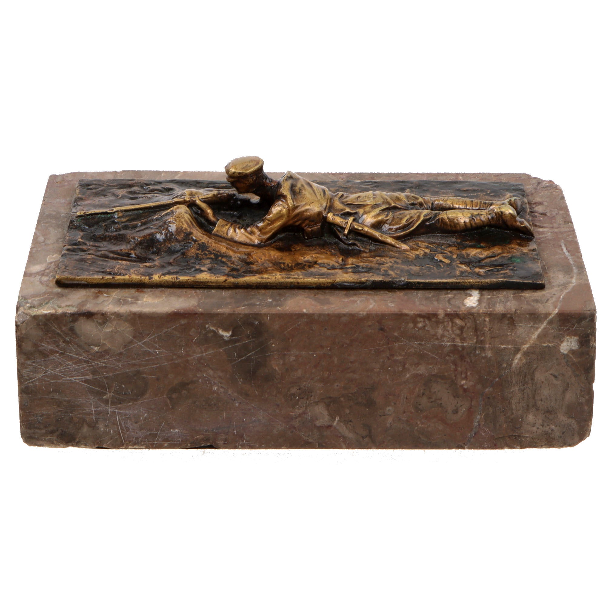 Original Item. Only One Available. This is a very interesting bronze statue which we believe to be depicting an Austro-Hungarian soldier. This is because we found a very similar example that had the soldier wearing a different piece of headgear, that being a forage cap, but the bayonet on his side is nearly identical, so we believe that this is an Austro-Hungarian piece, but we cannot say this for certain. Interestingly, the marble base is carved at an angle, so the soldier sits atop it rather slanted. The piece altogether measures 4 ½ x 8 x 2 ⅞”.