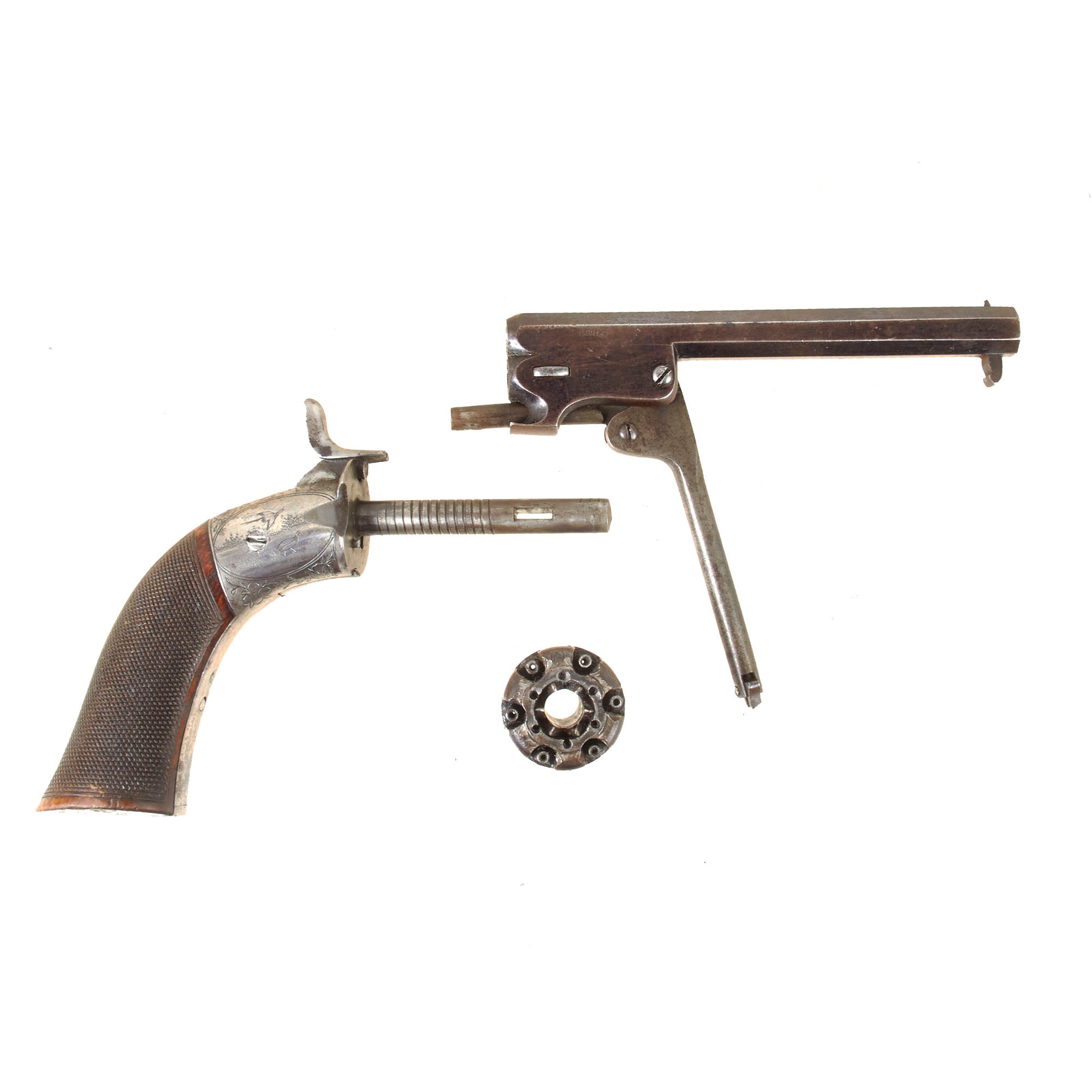 Original Item: Only One Available. This exceptionally fine Belgian percussion revolver represents a rare and early “transition” model, bridging the gap between pepperbox designs and fully developed Colt-style revolvers. Manufactured in Liège by Toussaint Joseph Lhoist and signed T. LHOIST BREVETÉ, it reflects the high level of craftsmanship for which Belgian gunmakers were renowned during the 19th century—particularly in their licensed and unlicensed adaptations of American firearms.