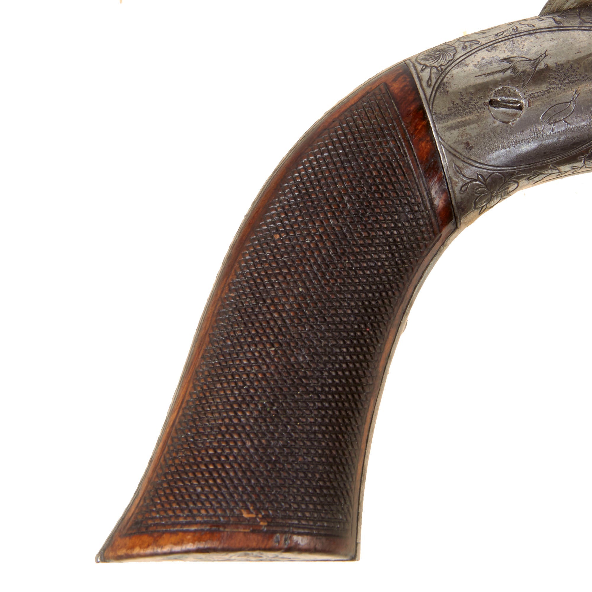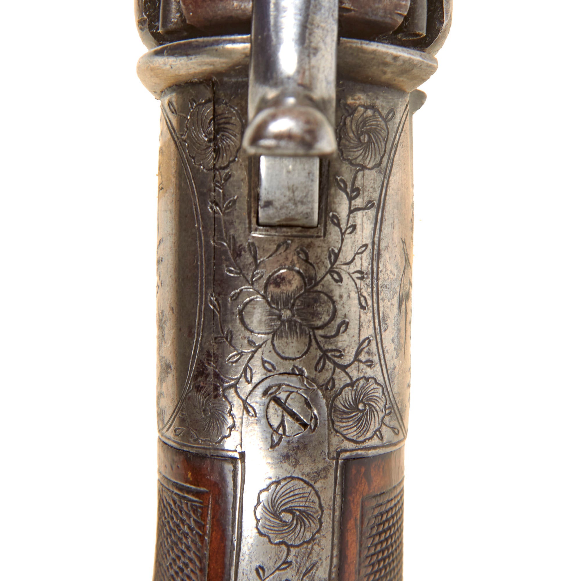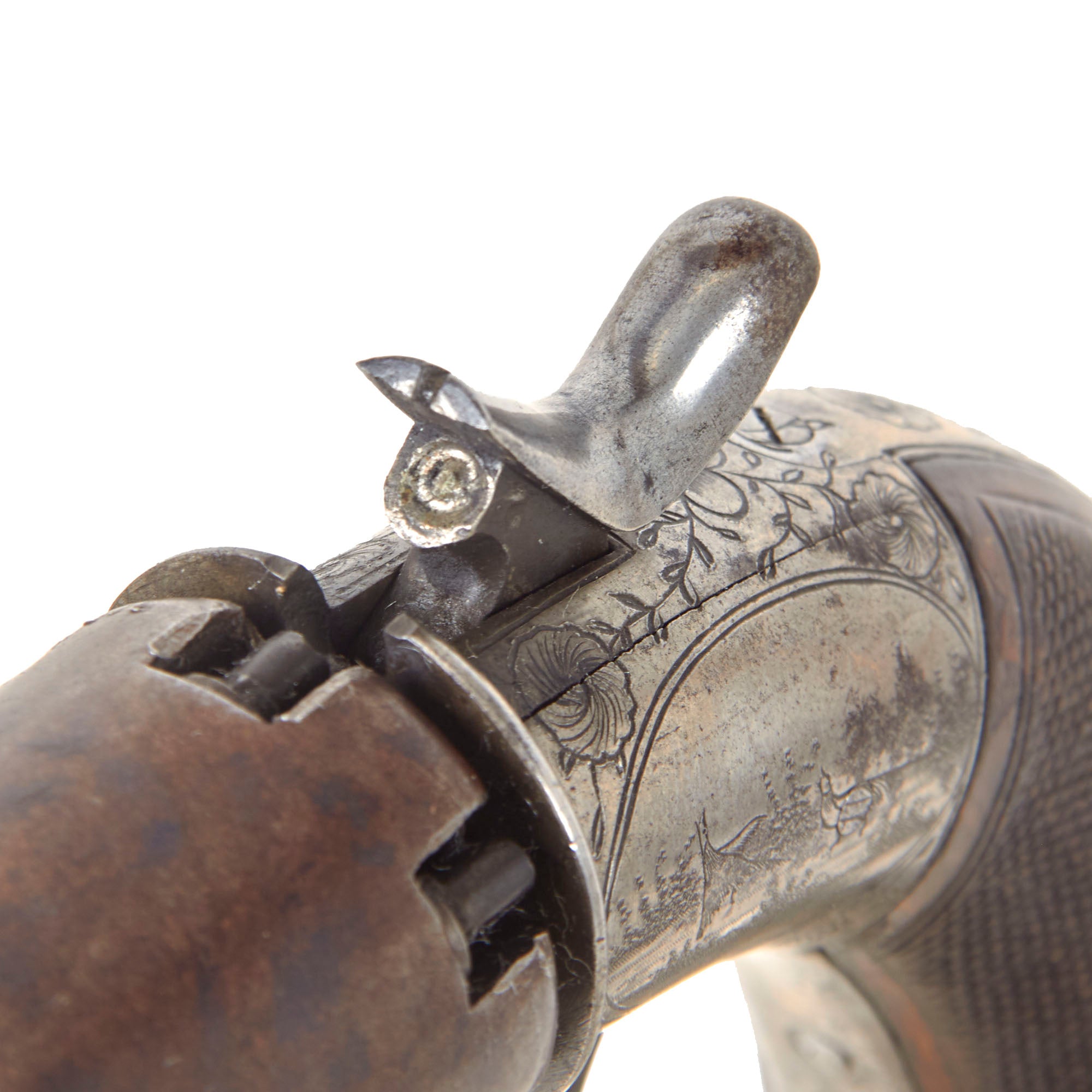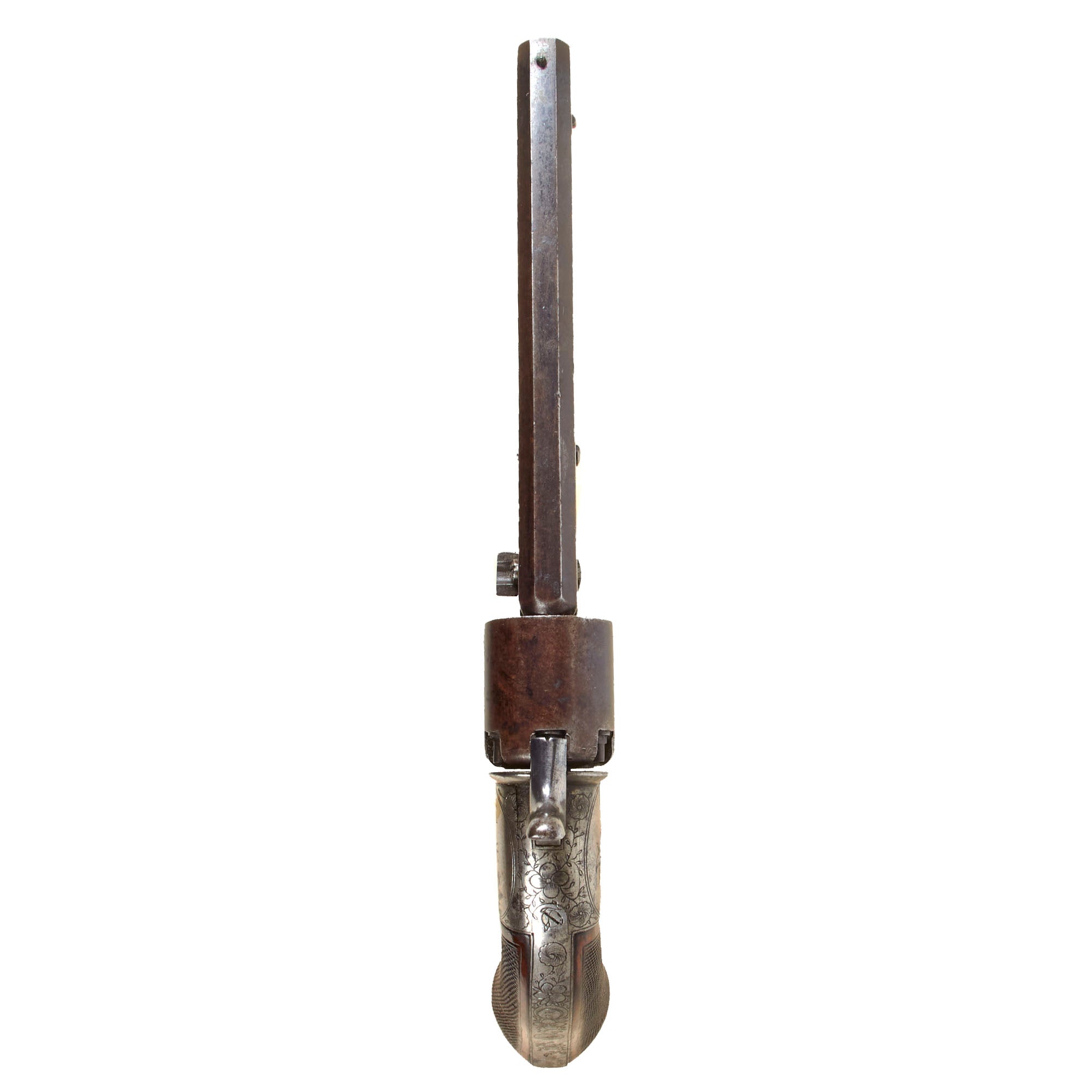 The revolver is .32 caliber and features a hidden folding trigger, a hallmark of discreet, early percussion handguns. It is a percussion revolver with a rotating cylinder mounted on an axis pin, the barrel attached directly to the axis of rotation. Below this axis is an opening that allows the passage of a separate loading rod, used to load each chamber from the front—an important transitional feature in revolver development.