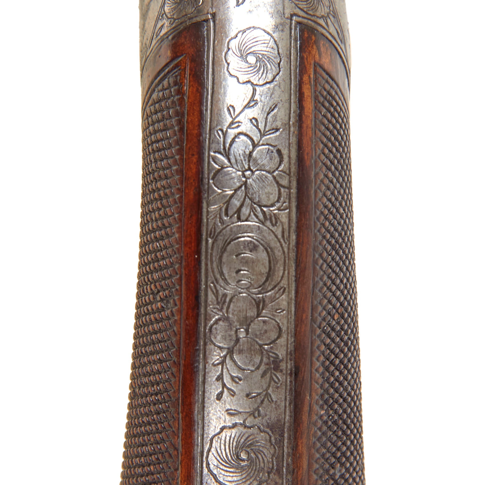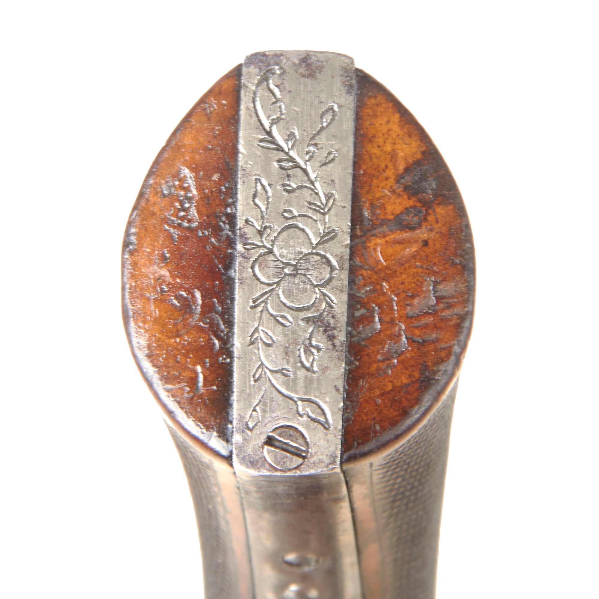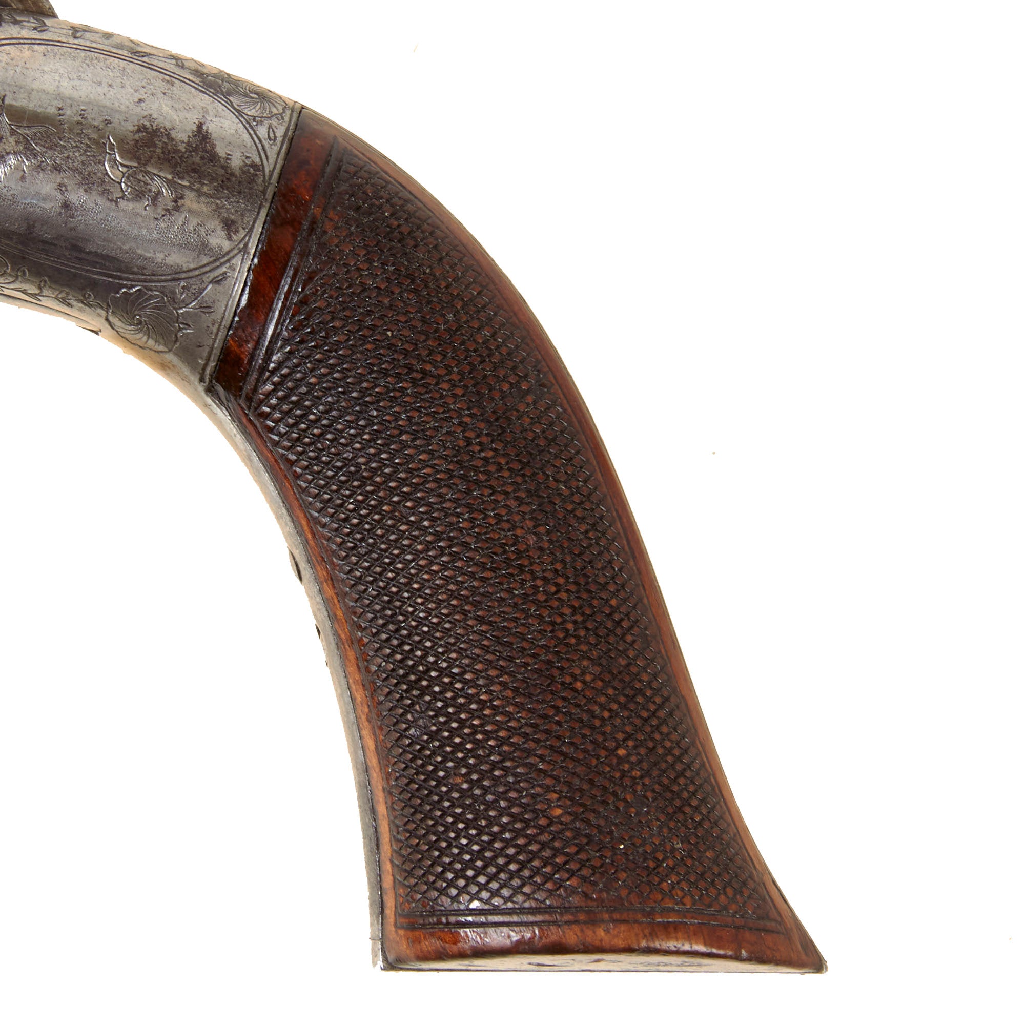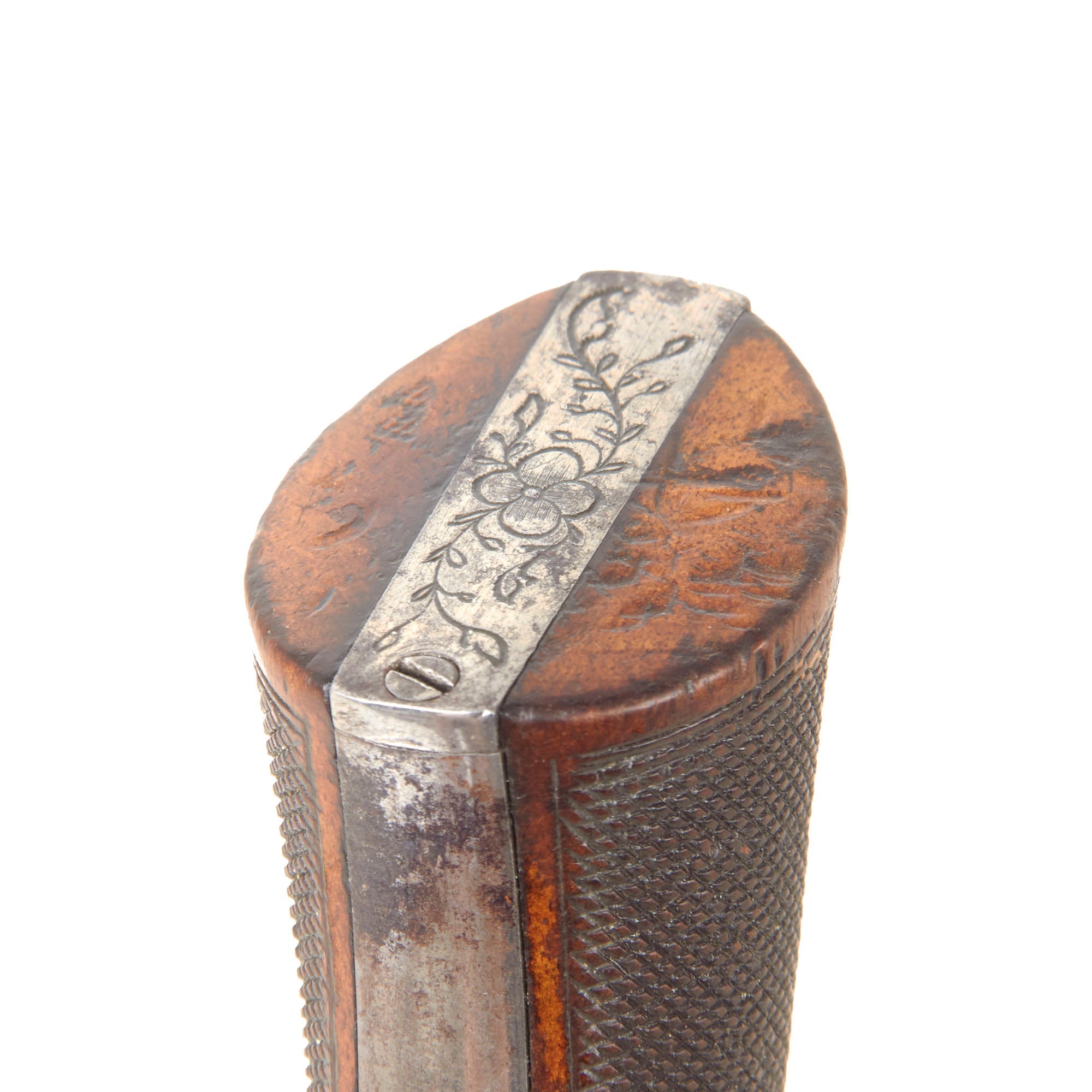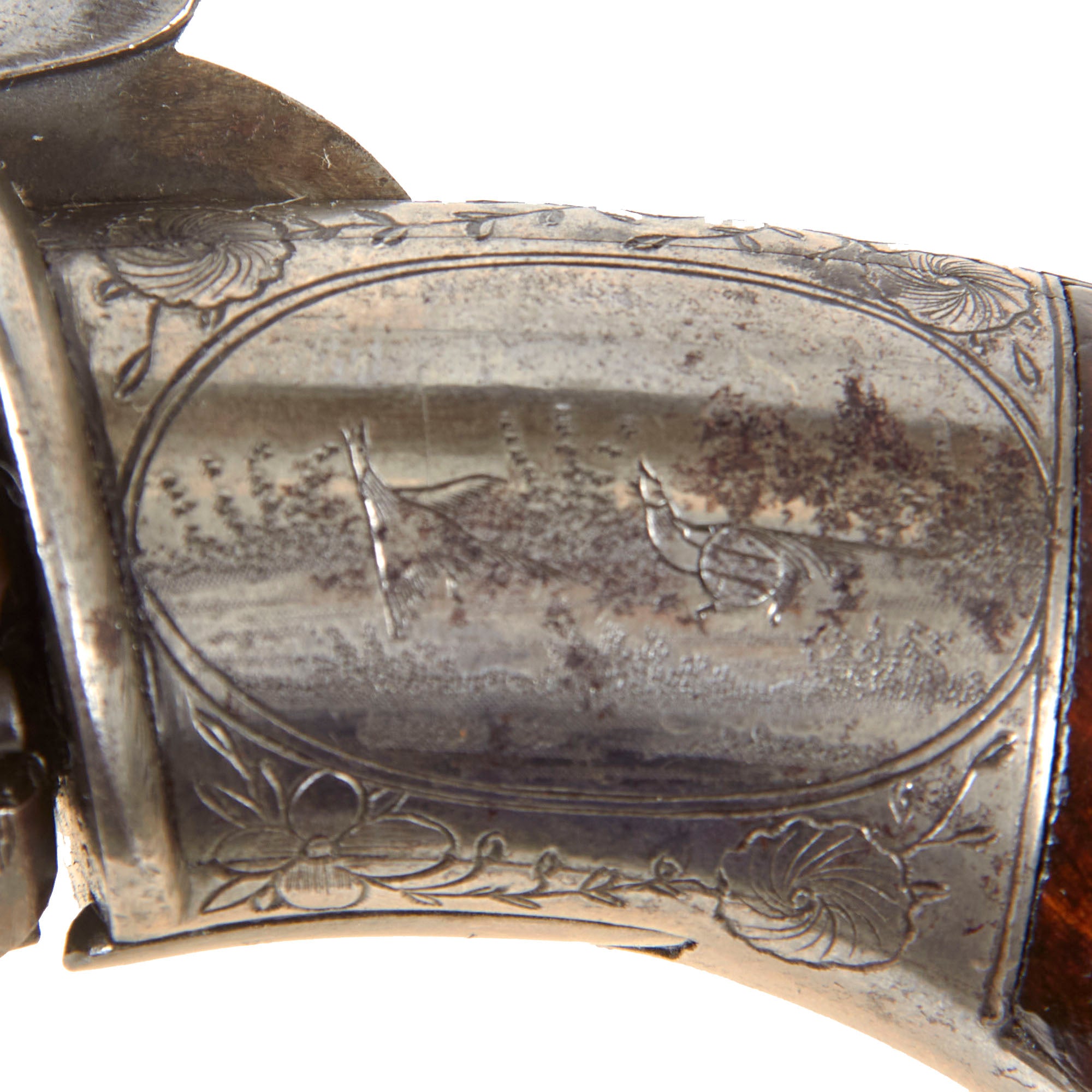 The revolver is .32 caliber and features a hidden folding trigger, a hallmark of discreet, early percussion handguns. It is a percussion revolver with a rotating cylinder mounted on an axis pin, the barrel attached directly to the axis of rotation. Below this axis is an opening that allows the passage of a separate loading rod, used to load each chamber from the front—an important transitional feature in revolver development.