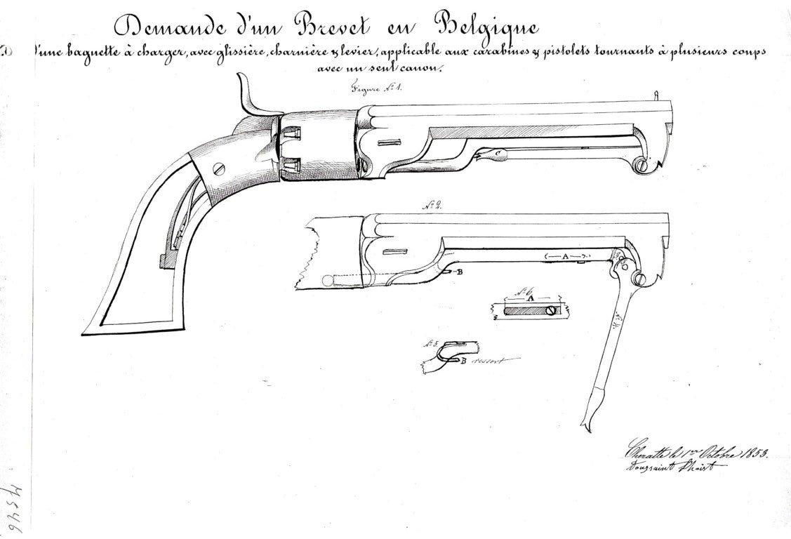 Although Lhoist filed three patents between 1851 and 1853—including designs inspired by Mariette pepperboxes and the Colt 1851—none correspond exactly to this revolver, reinforcing its status as an earlier transitional piece. Notably, Colt officially granted Toussaint Lhoist the right to manufacture firearms under the Colt system, including front-loaded cylinders and loading levers, and Lhoist served as a European representative of the Colt brand.