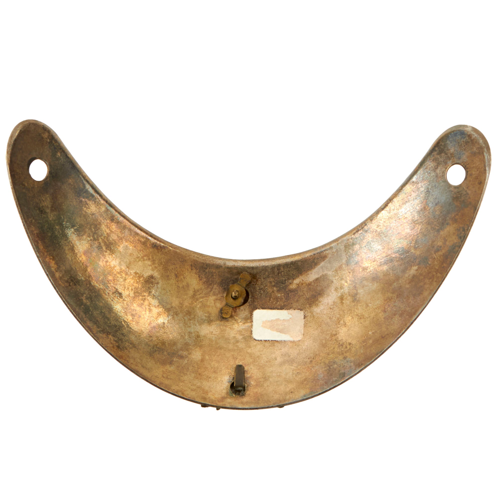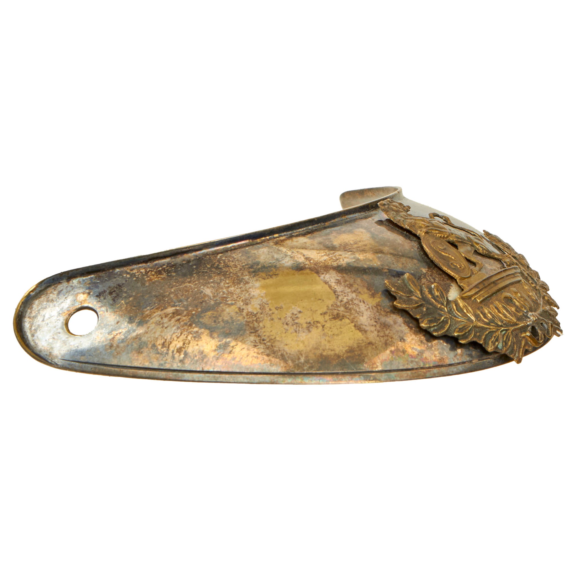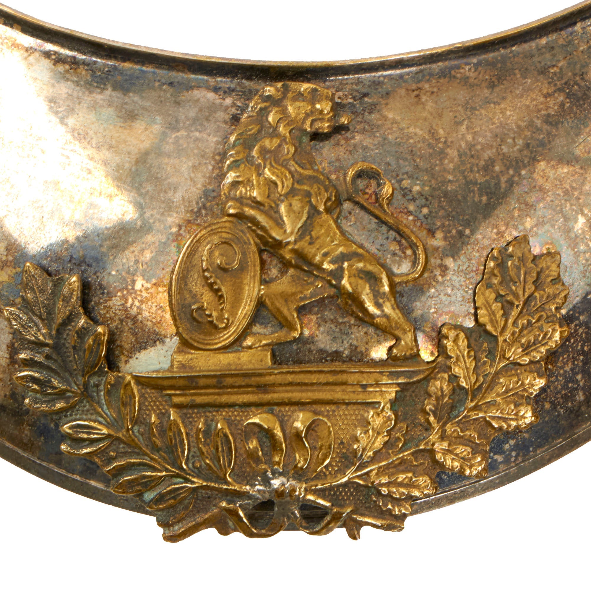 Original Item. Only One Available. This is a very nice silver tray gorget worn by a Belgian officer of infantry, Model of 1831. The gorget measures 5⅝ x 3¾” and is in good condition with a nice tarnished finish.The central motif features the lion of Belgium on an apron with a shield with the initial "L" (Leopold), all placed on an oak branch and a laurel branch. This device is affixed to the gorget by a prong and screw with a piece holding it in place.This is a very gorgeous Belgian gorget, ready for further research and display.