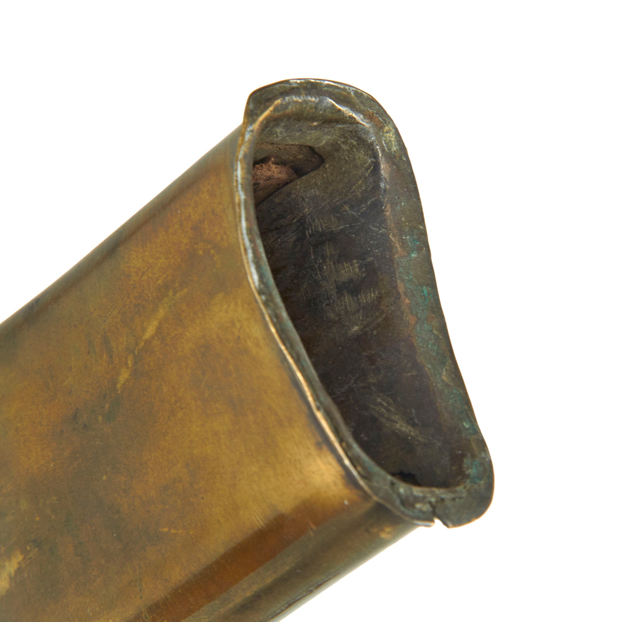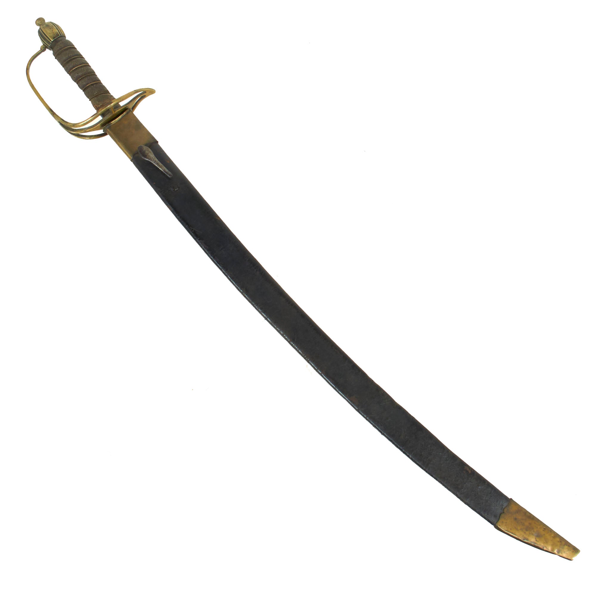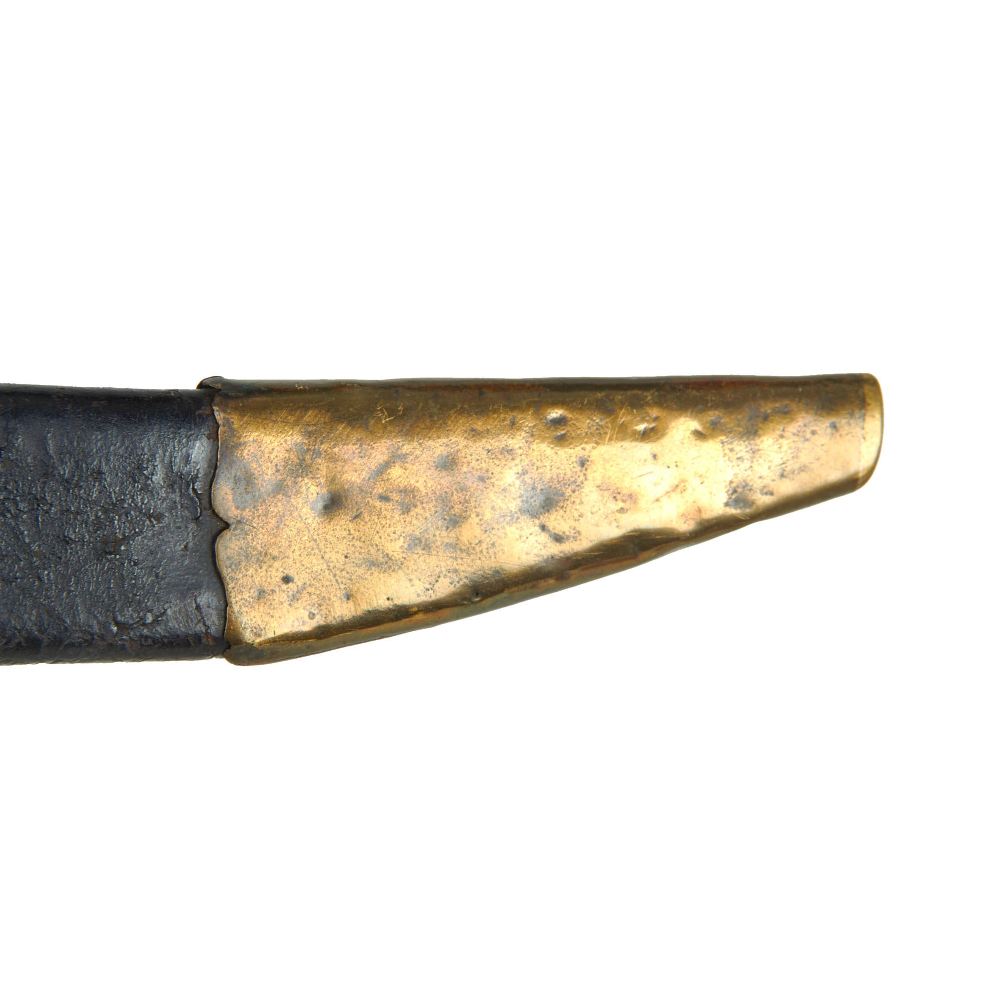 The only thing more difficult to find than this Pattern of saber is its scabbard, which this example retains fully. The 33” long scabbard is in museum-grade condition for its age, a truly phenomenal piece to have been preserved so well. There are some spots of minor material loss & weakness from cracking & crazing, but the stitching on the reverse is almost completely intact. The brass throat & frog button are well-retained with the small bit of the throat sticking out of the leather as is correct. The endmount chape is similarly well-retained without any play or damage.