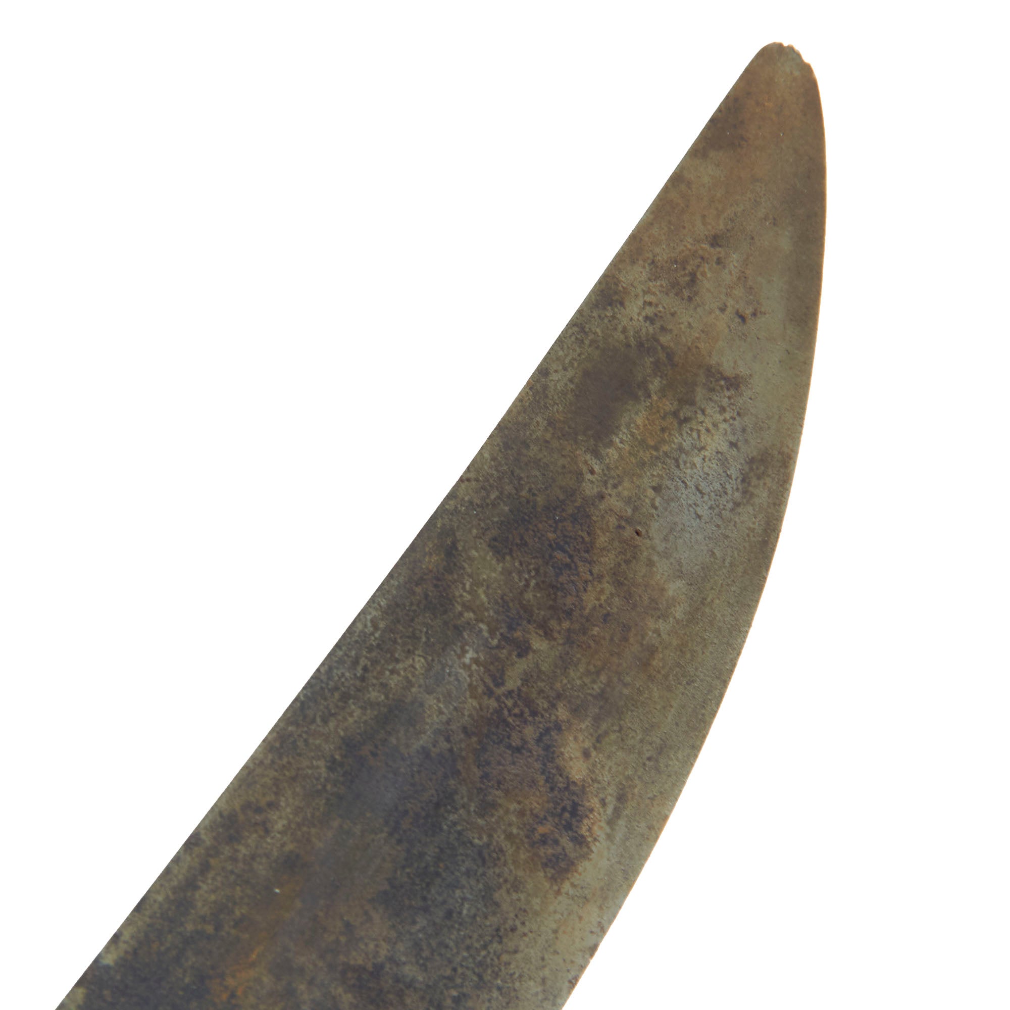 The blade of this tremendous example measures a staggering 33”, with an overall length of 41¼”. There are a couple minor chips in the edge of the blade, with a lovely oxidized patina throughout, with a double fuller along the majority of its length. It appears that the tip of the saber, approximately the final inch, was partially broken off and subsequently restored, almost certainly by Moore himself. The blade is in truly phenomenal condition for its age, and is still tight to the hilt.