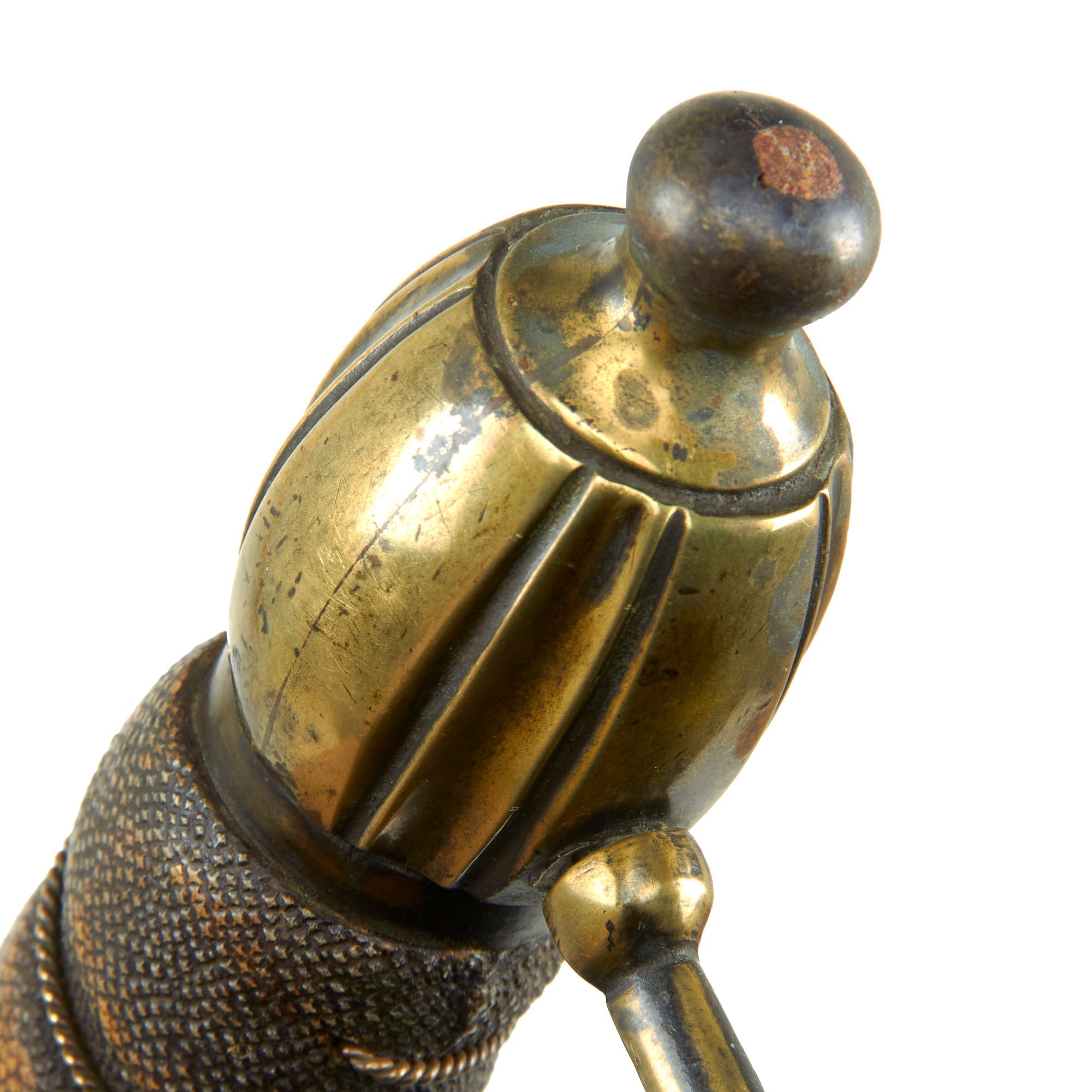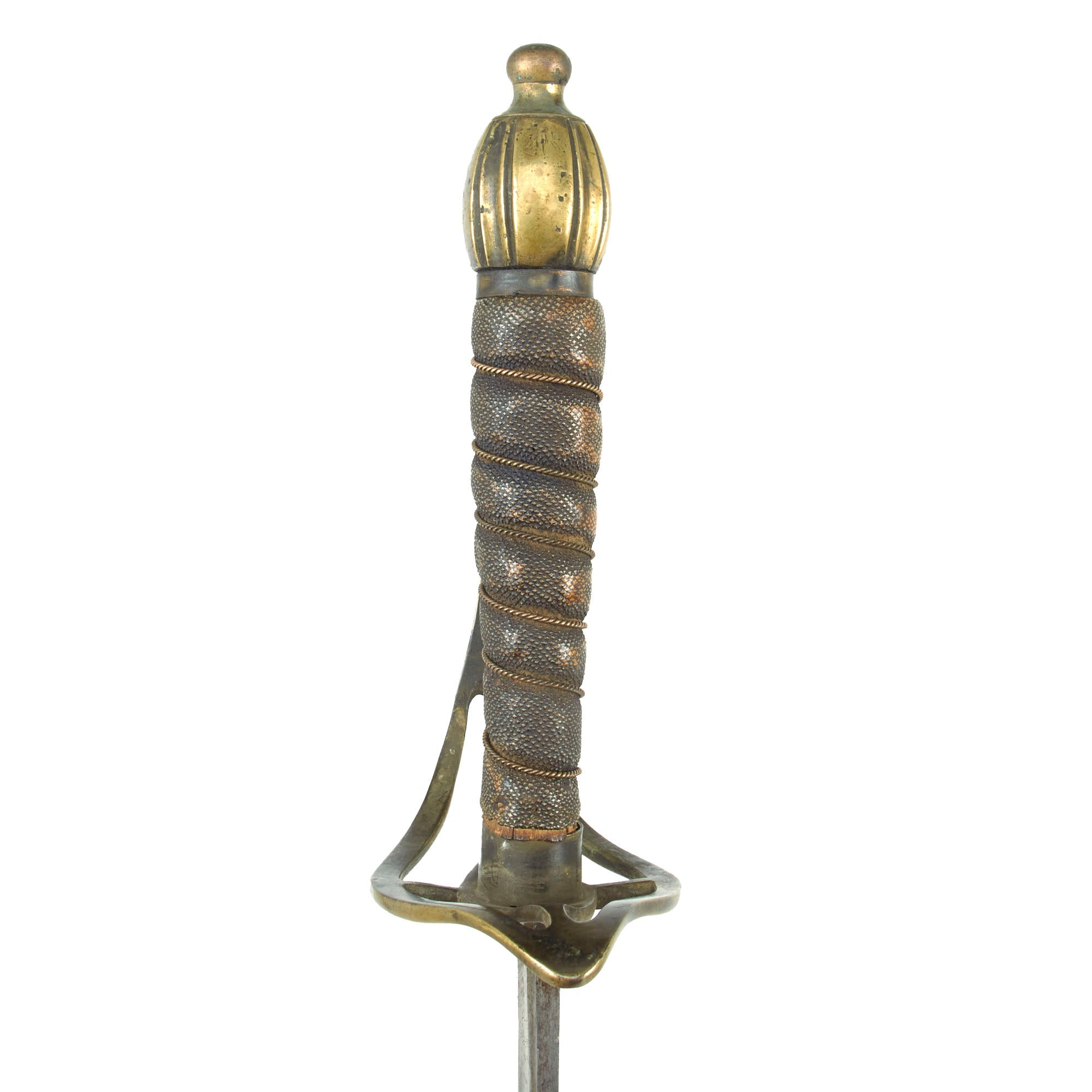 The hilt is absolutely enormous by later standards, measuring 8¼” long on its own. The grip is the original sharkskin-covered wood, wrapped with a single twisted wire, with a patina that truly looks 268 years old. There is some wood showing at the top of the grip, certainly due to the shrinkage of the sharkskin over time. The cast-brass slotted hilt is in fantastic condition with a patina that cannot be replicated. The fluted pommel is in great shape as well, with the cap still retained and without serious denting.