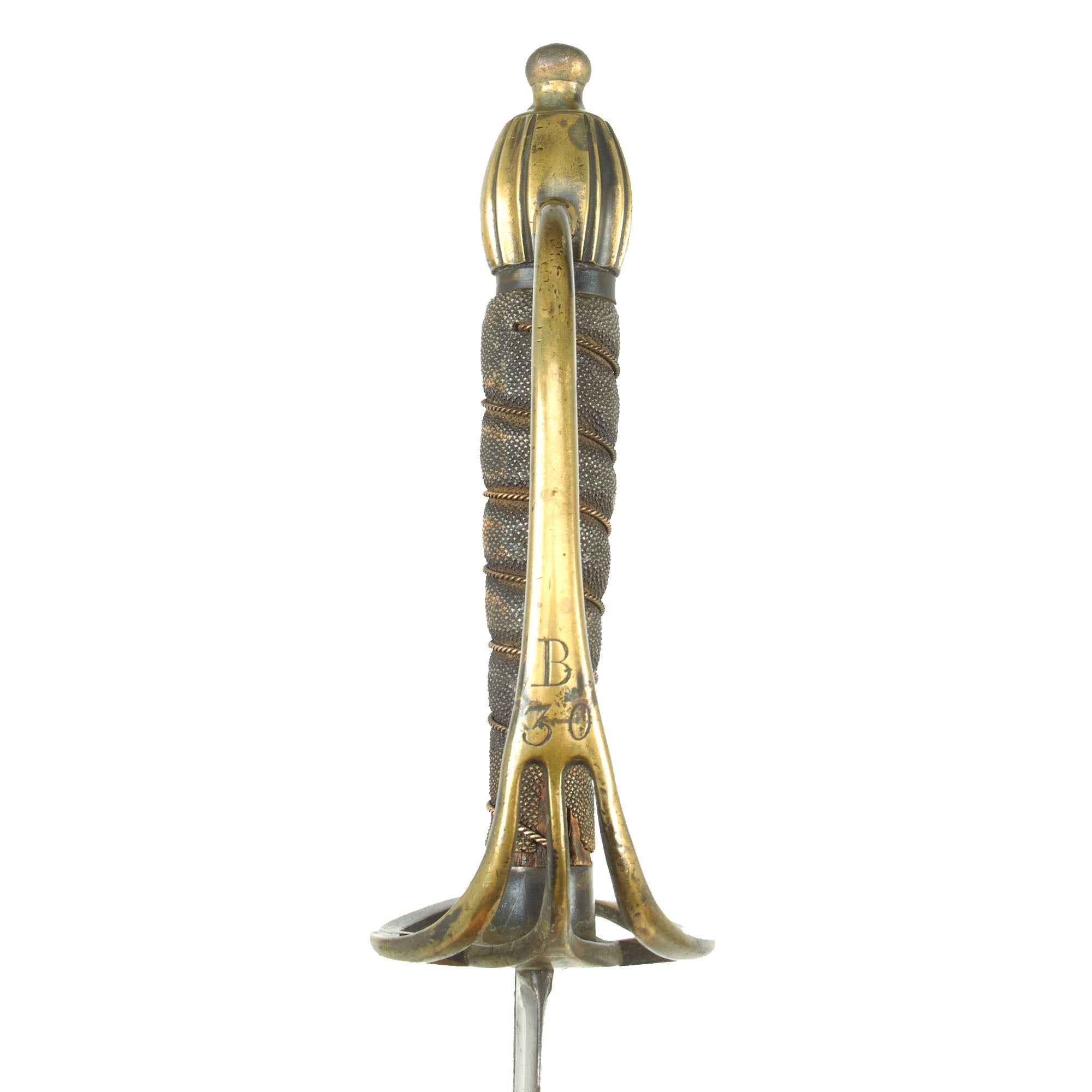 The outer face of the knuckle-bow is engraved with B / 30 issue marks, indicating that it was the 30th sword issued to the B or 2nd troop in a light dragoon regiment. The British Army sent two regiments of light dragoons to serve in North America during the Revolutionary War. The first to arrive was the 17th Light Dragoons, who landed in Boston in 1775, while the city was still under siege by the Continental Army. They received their baptism of fire soon after their arrival when the horsemen volunteered to dismount and take part in the Battle of Bunker Hill. They would remain in America for the next eight years, serving in nearly every major campaign up through the end of hostilities. In October 1776 they were joined by the 16th Light Dragoons. The two regiments fought alongside one another through the campaigns around New York, Pennsylvania, and New Jersey, but unlike their compatriots, the 16th returned to Britain in 1779.