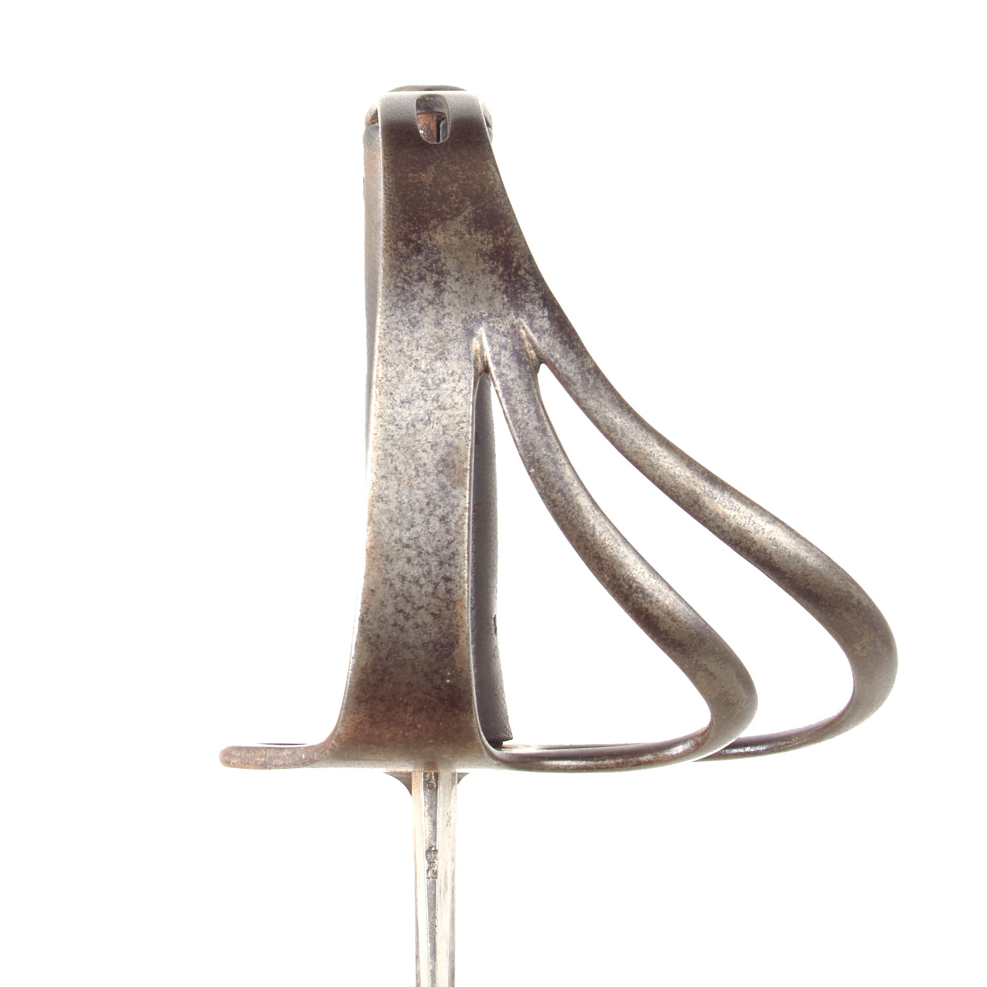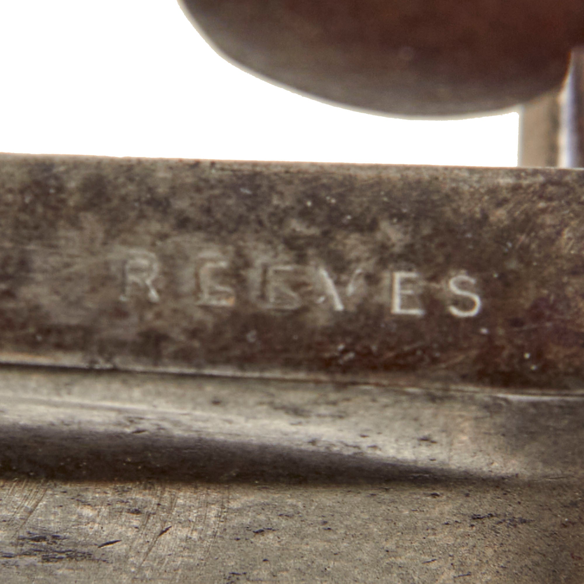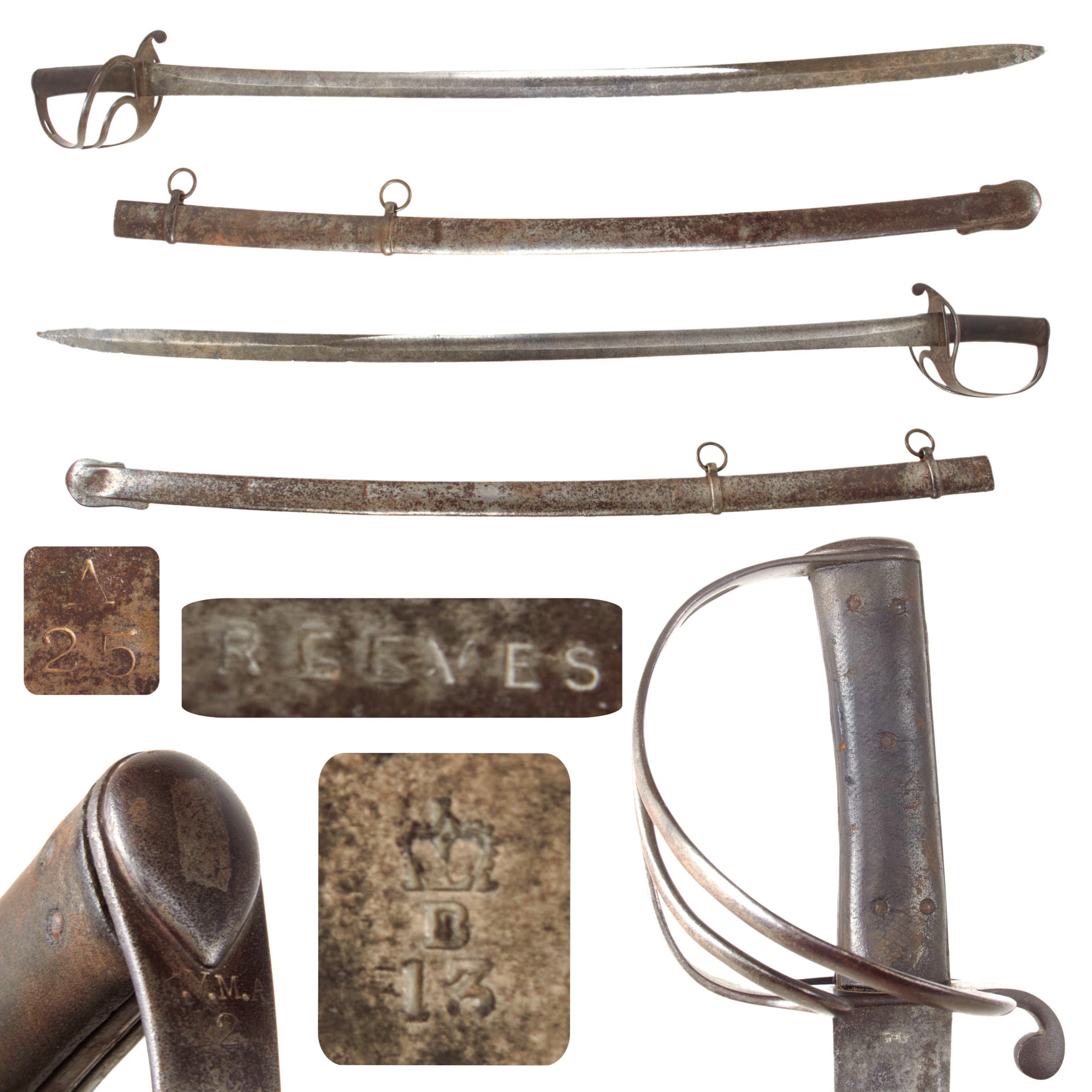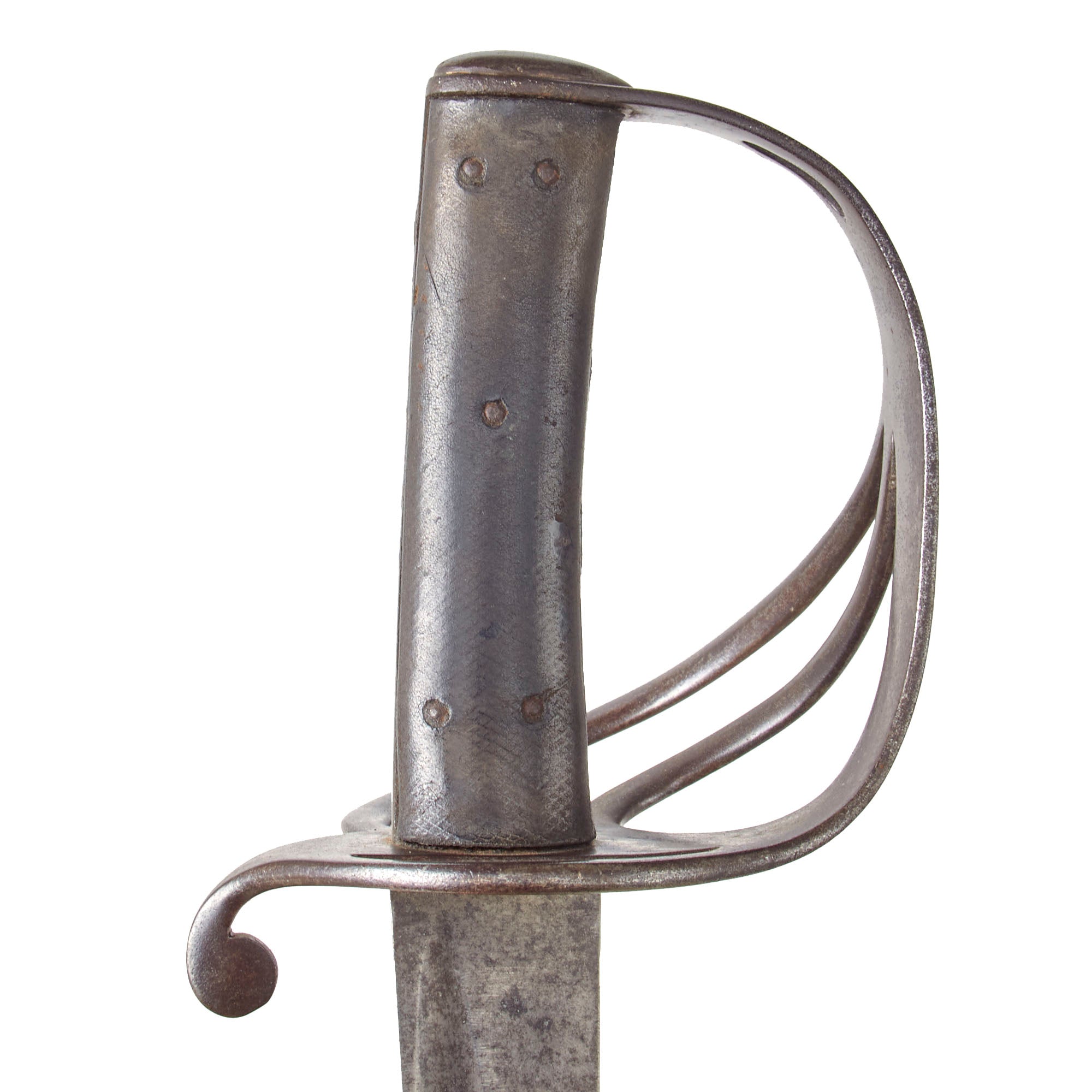 The saber has a 35 ½” curved blade, with the ricasso bearing an Birmingham RSAF inspector's mark numbered 13 and Birmingham anchor. The spine is stamped REEVES denoting Charles Reeves, the progenitor of the Patent Solid Hilt, a wide tang set between thick slabs of pressed, checkered leather which would become the standard grip for British swords produced in the latter half of the 18th century. This example features one such grip.