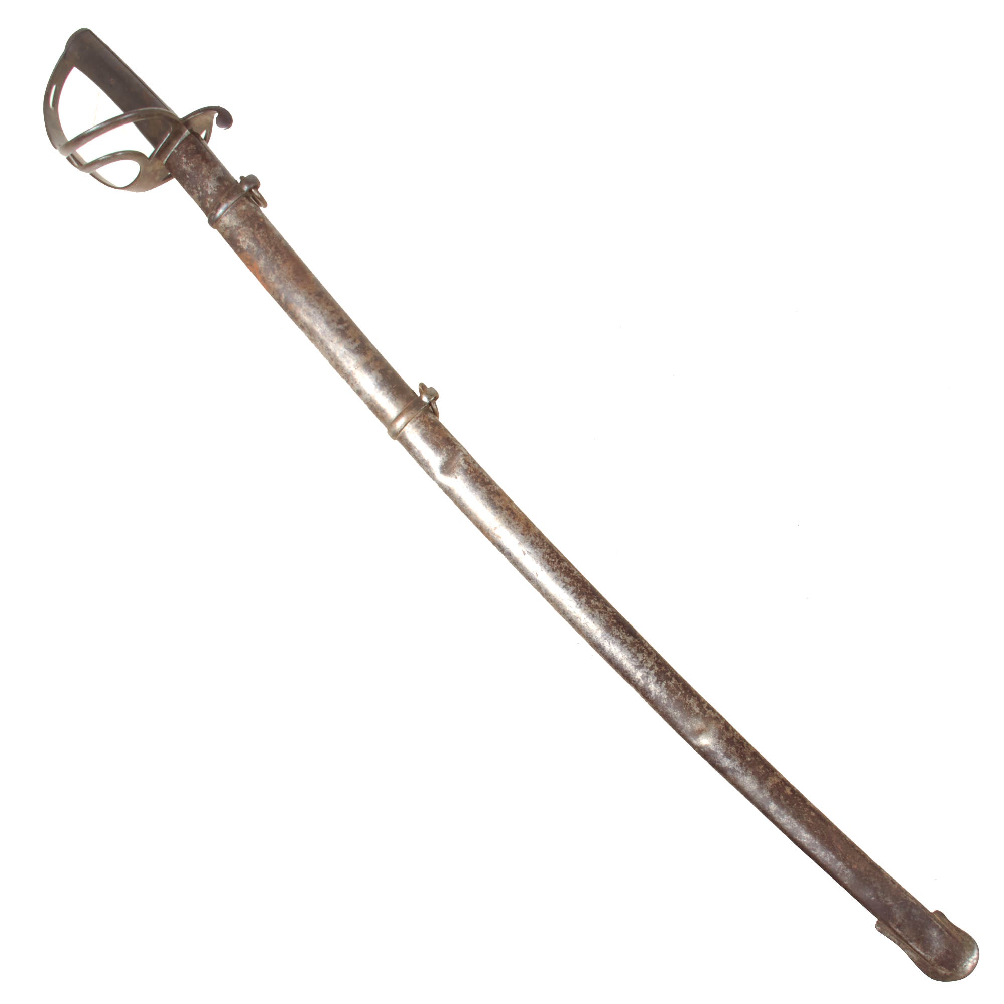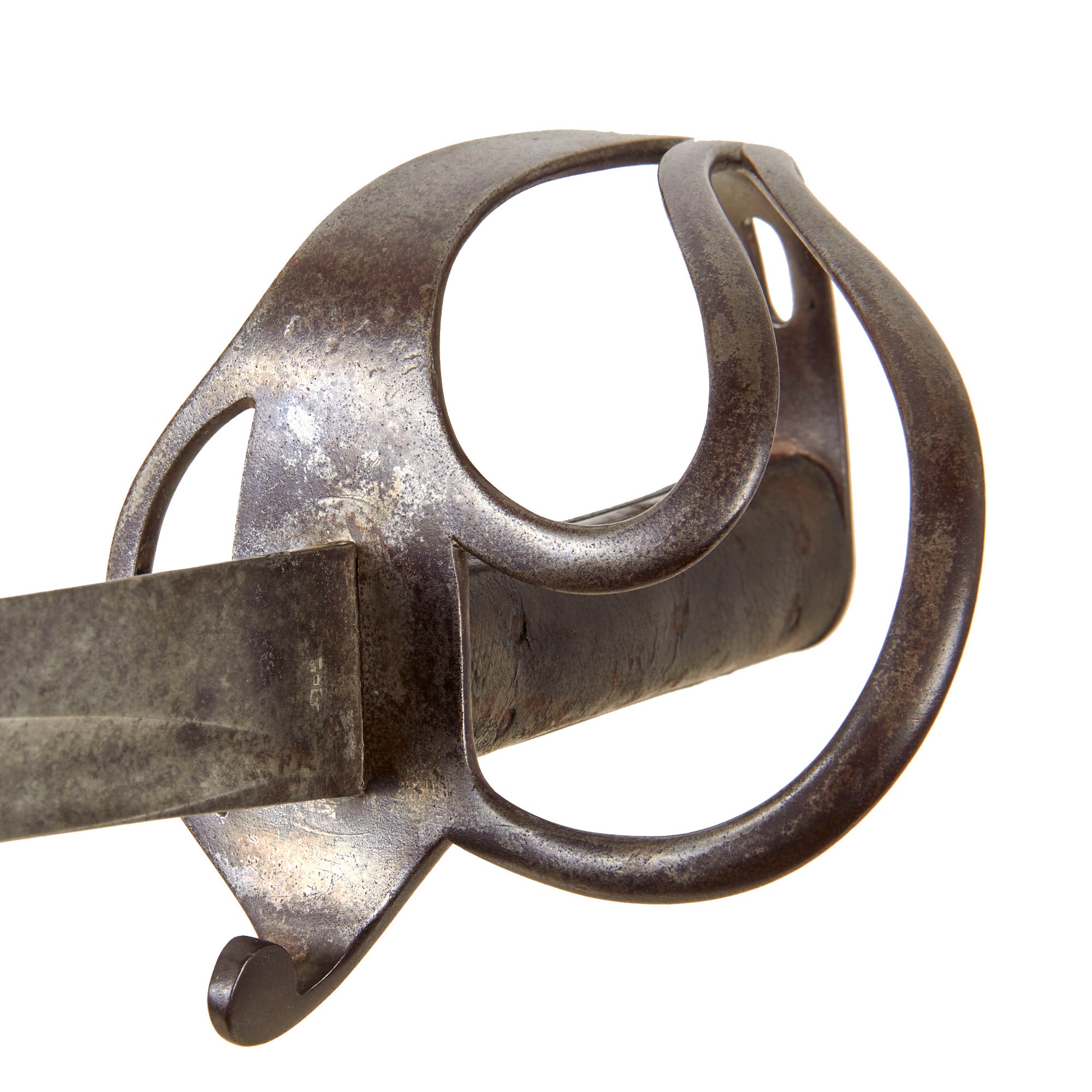 Though the checkered pattern is worn, all of the original leather to the grip is present. The darkly patinated blade exhibits signs of battlefield wear, including a folded point, and the guard presents a dark patina. The overall length of the saber is roughly 41⅜”.