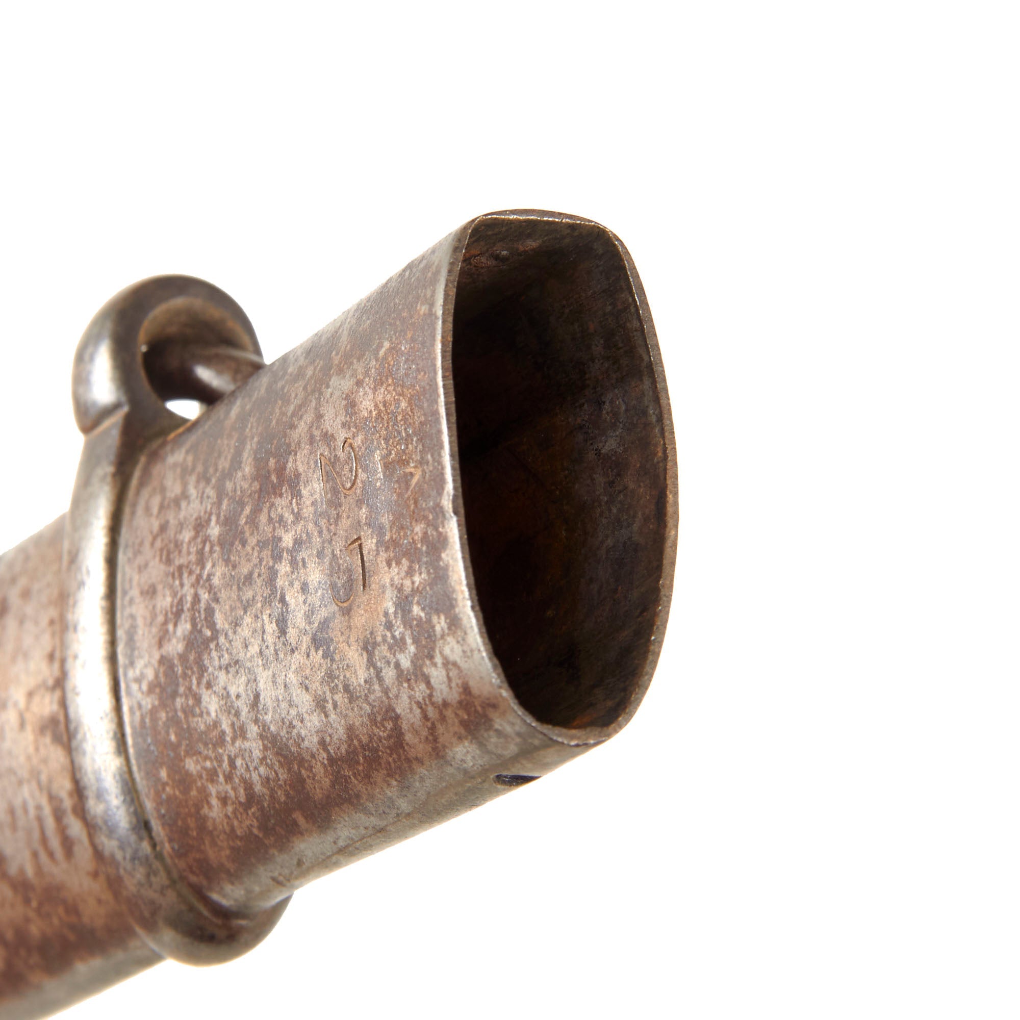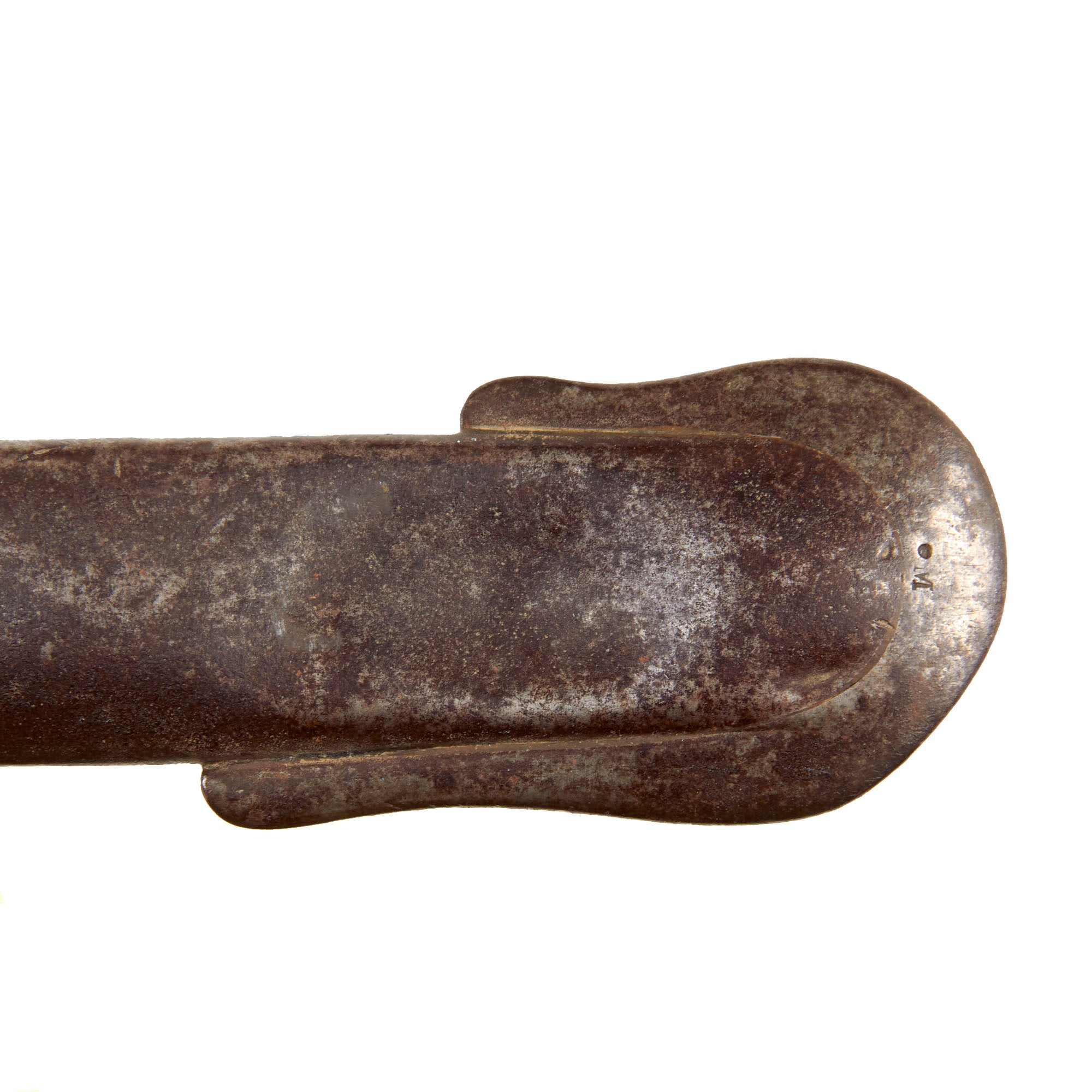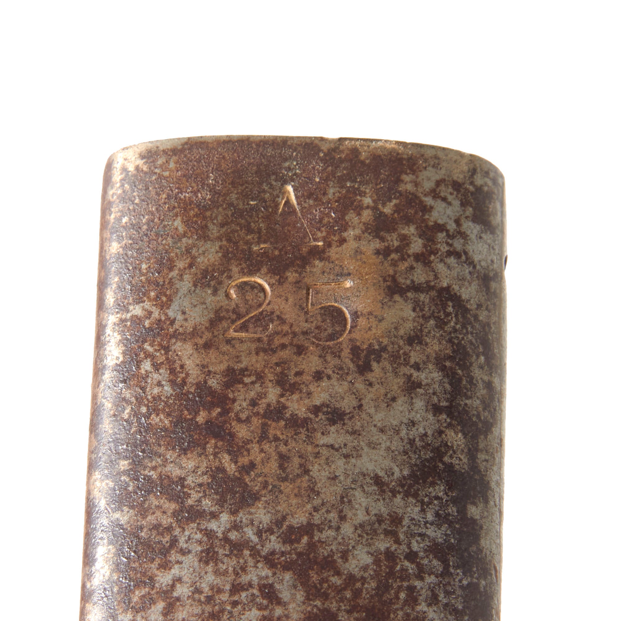 The scabbard retains both suspension rings but appears to be missing the throat piece, with holes to both sides where it would’ve been attached. The only marking we could find is a stamped A / 25 at the throat. The scabbard is 35 ¾” long and has some denting as shown.