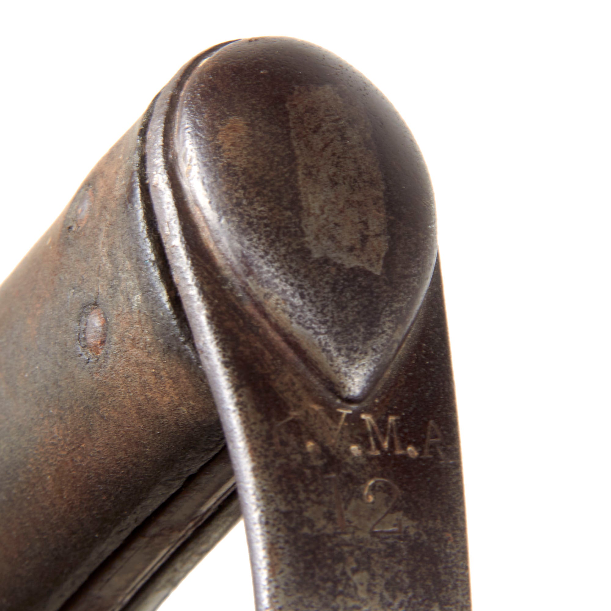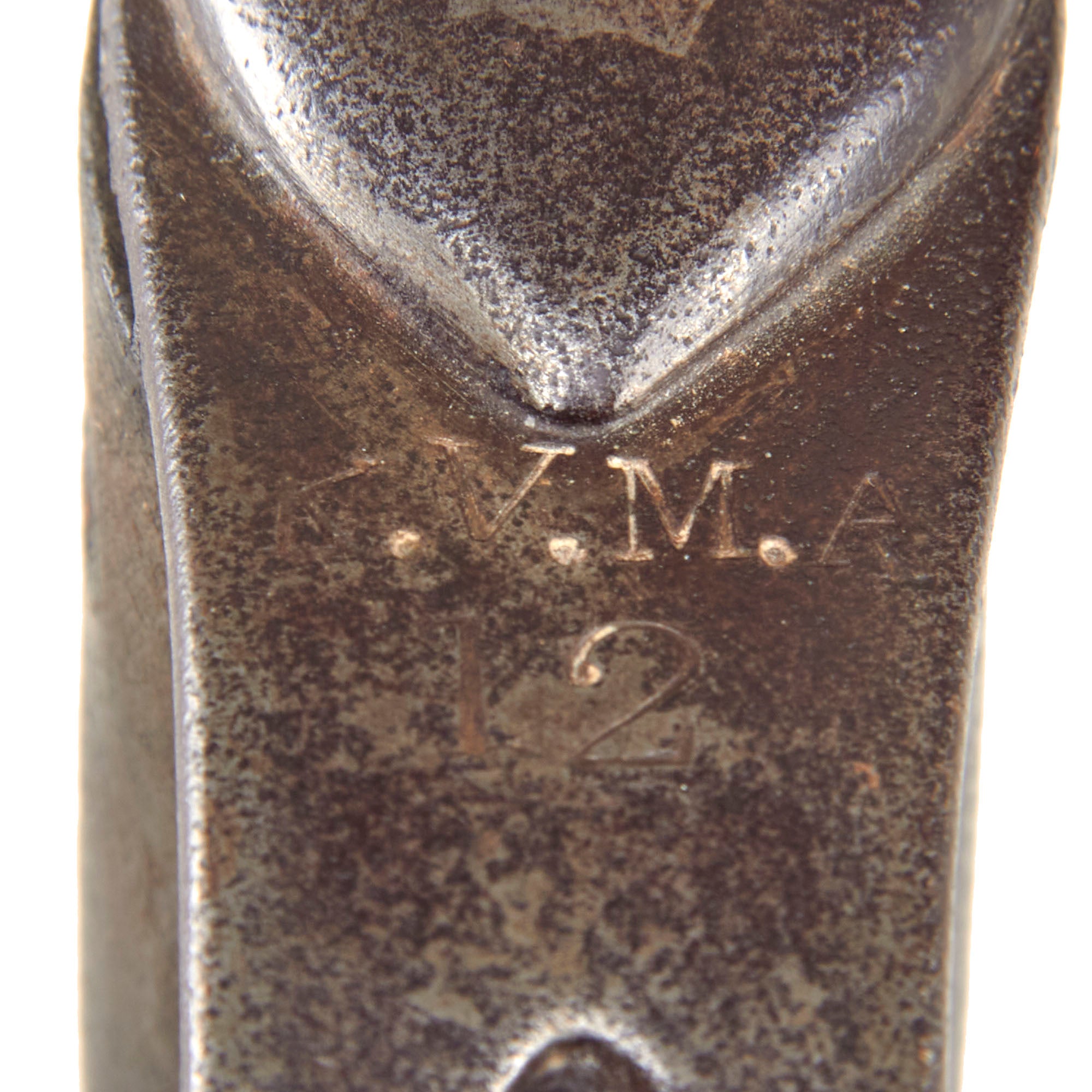 "K.V.M.A. / 12," appearing just below the tear-shaped pommel, is, ostensibly, an abbreviation for the Kingston Volunteer Militia Artillery. Little is known of this Canadian artillery battery other than that it was formed in 1855 as a result of the Crimean War which led to fewer British regulars in British North America. The Canadian Legislature passed the Militia Act of 1855, which authorized a volunteer militia of up to 5,000, including batteries of artillery, equipped and trained at government expense. A handful of other examples bearing the same abbreviation are known, all of them, peculiarly, p1853 sabers intended for cavalrymen.