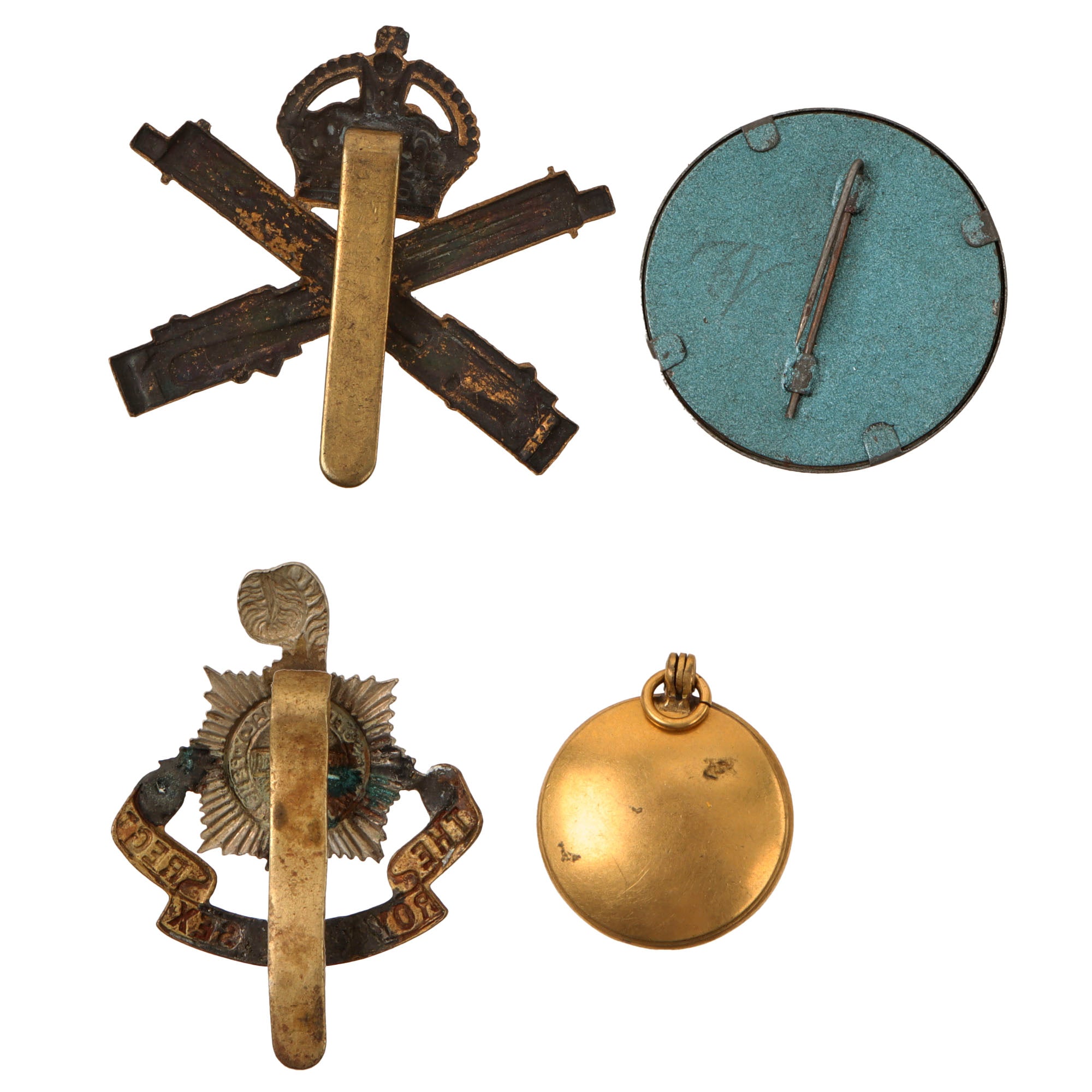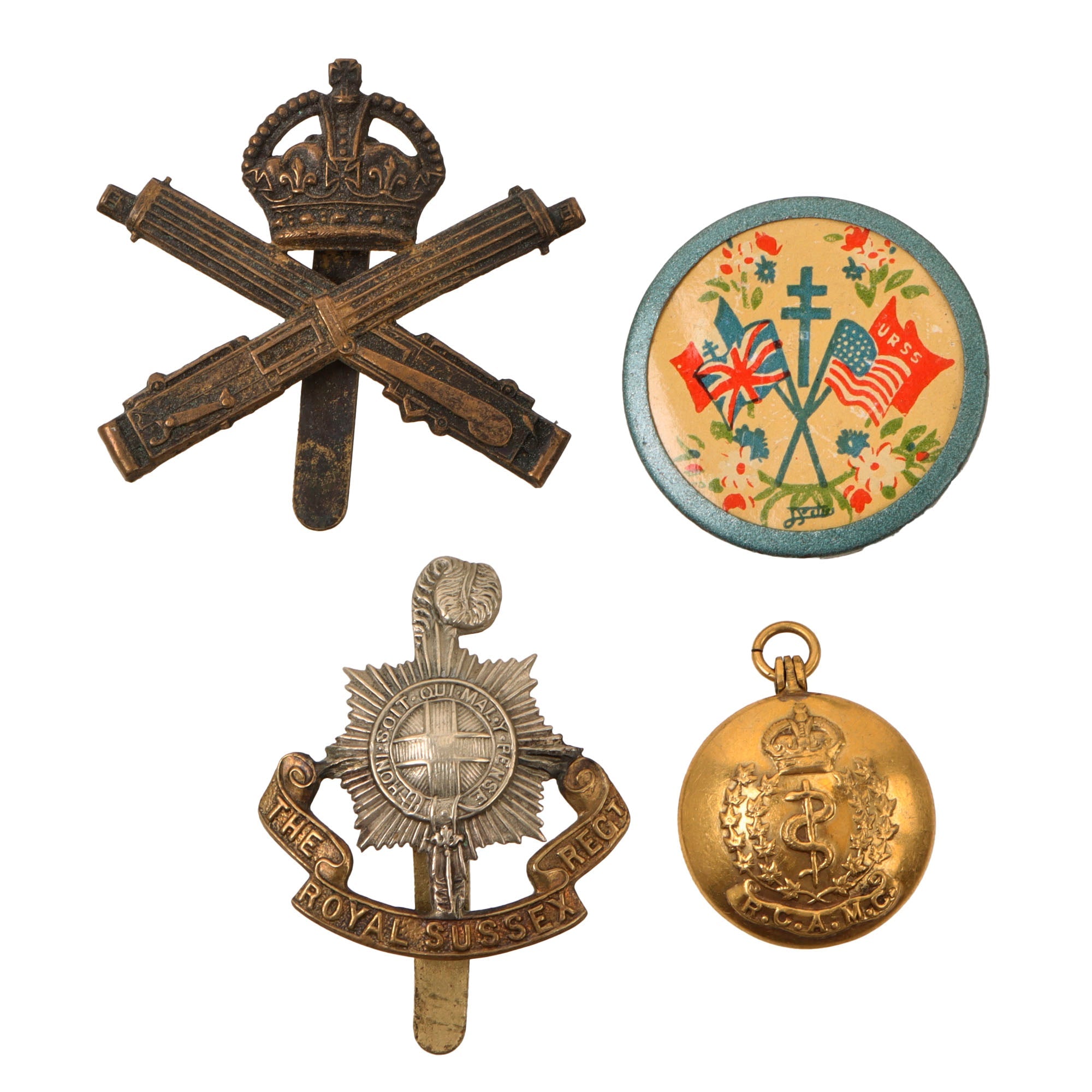 - Hat badges for the Royal Sussex Regiment and the Machine Gun Corps.