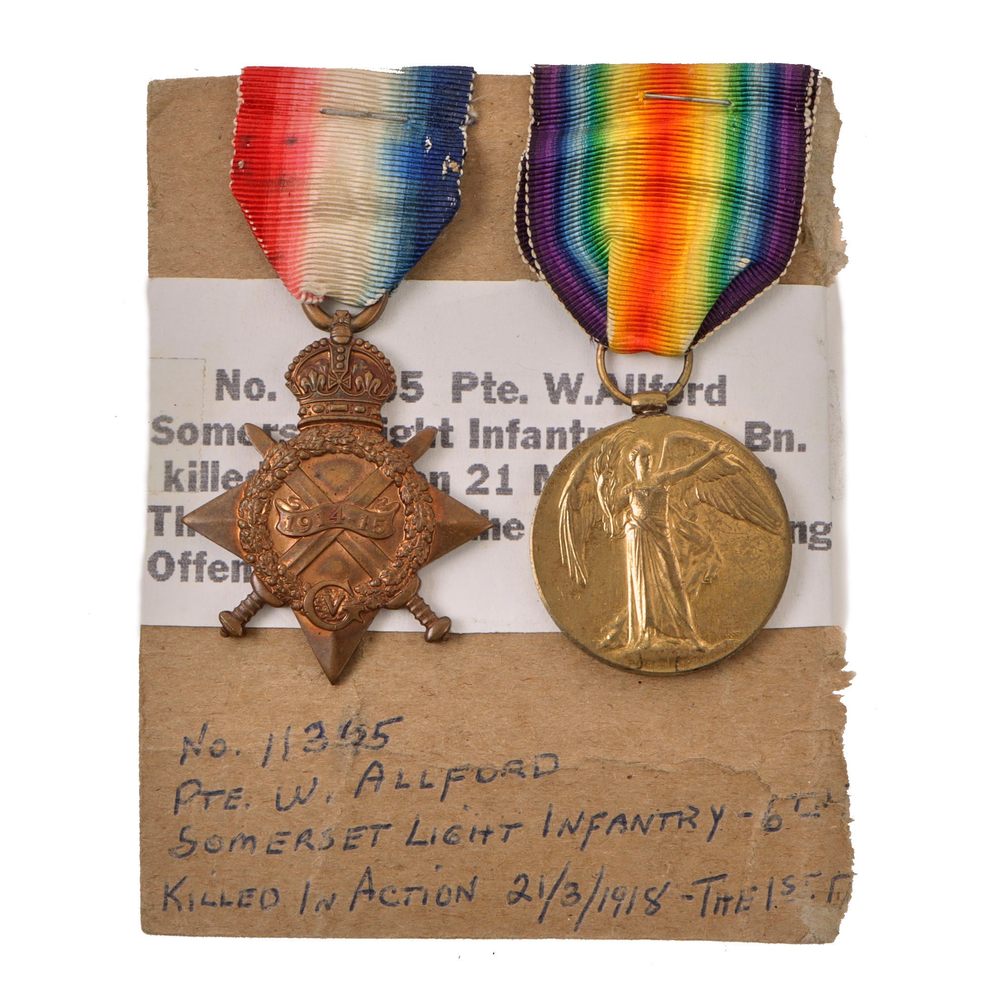 - 1914-15 Star and WWI Victory Medal to William Allford, Nr. 11365, 6th Battalion, Somerset Light Infantry. He was presumed dead on March 21st, 1918, but his body was never recovered. The medals are stapled to a small display card. He was killed on the first day of the German Spring Offensive.