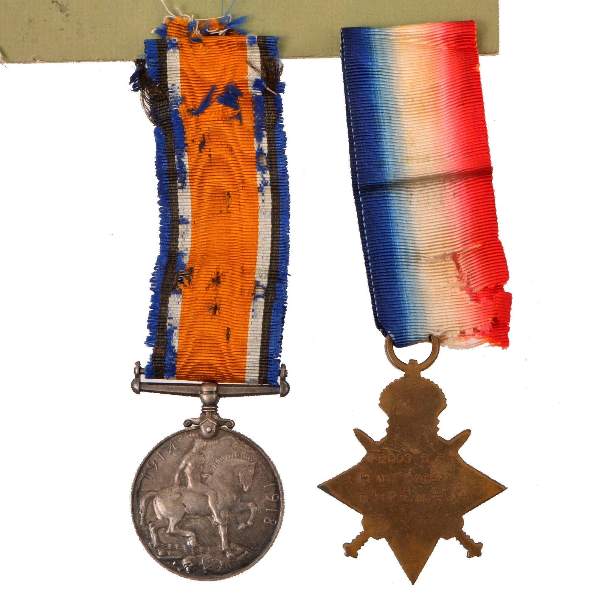 - 1914-15 Star and British War Medal to Leading Dock Hand Hugh McDade, Royal Naval Reserve. The ribbon of the British War Medal is heavily tattered and no longer properly stapled to the card.