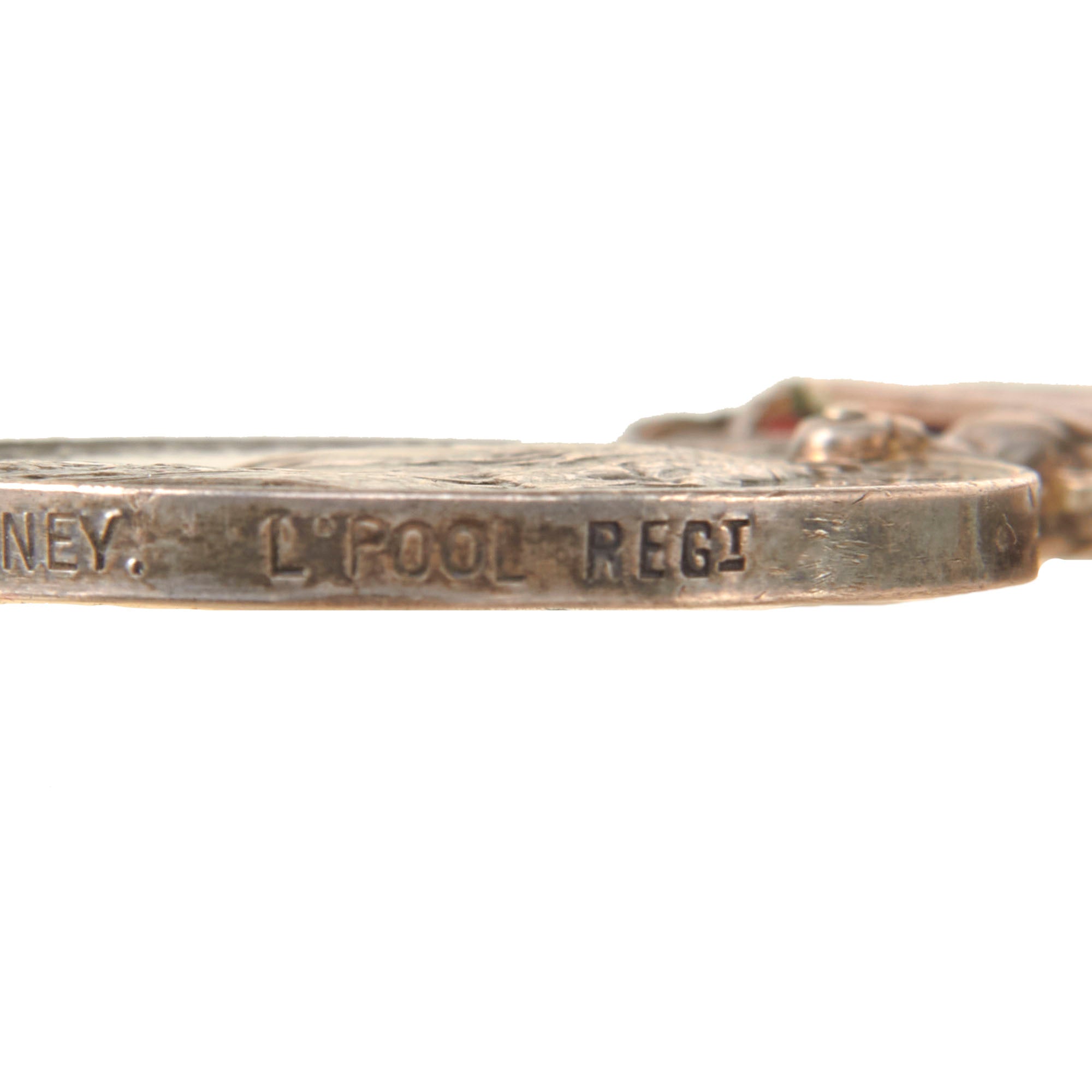 The wooden case is carved to the front with a horse badge for the Liverpool Regiment with his regimental number in the scroll, 6346. The top corners has 01 and 02, the years he served there. The latch still works fine but is a bit loose. The case measures 3 ½ x 4 ⅞ x 1 ¼”. There is a space cut to perfectly fit his medal.