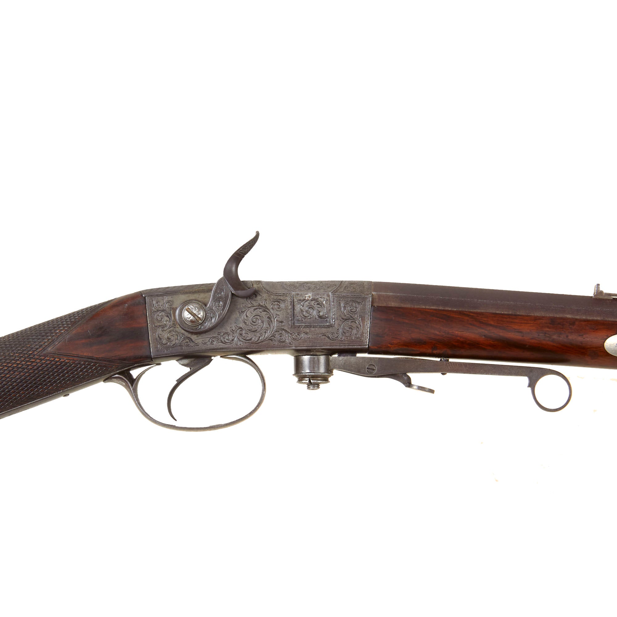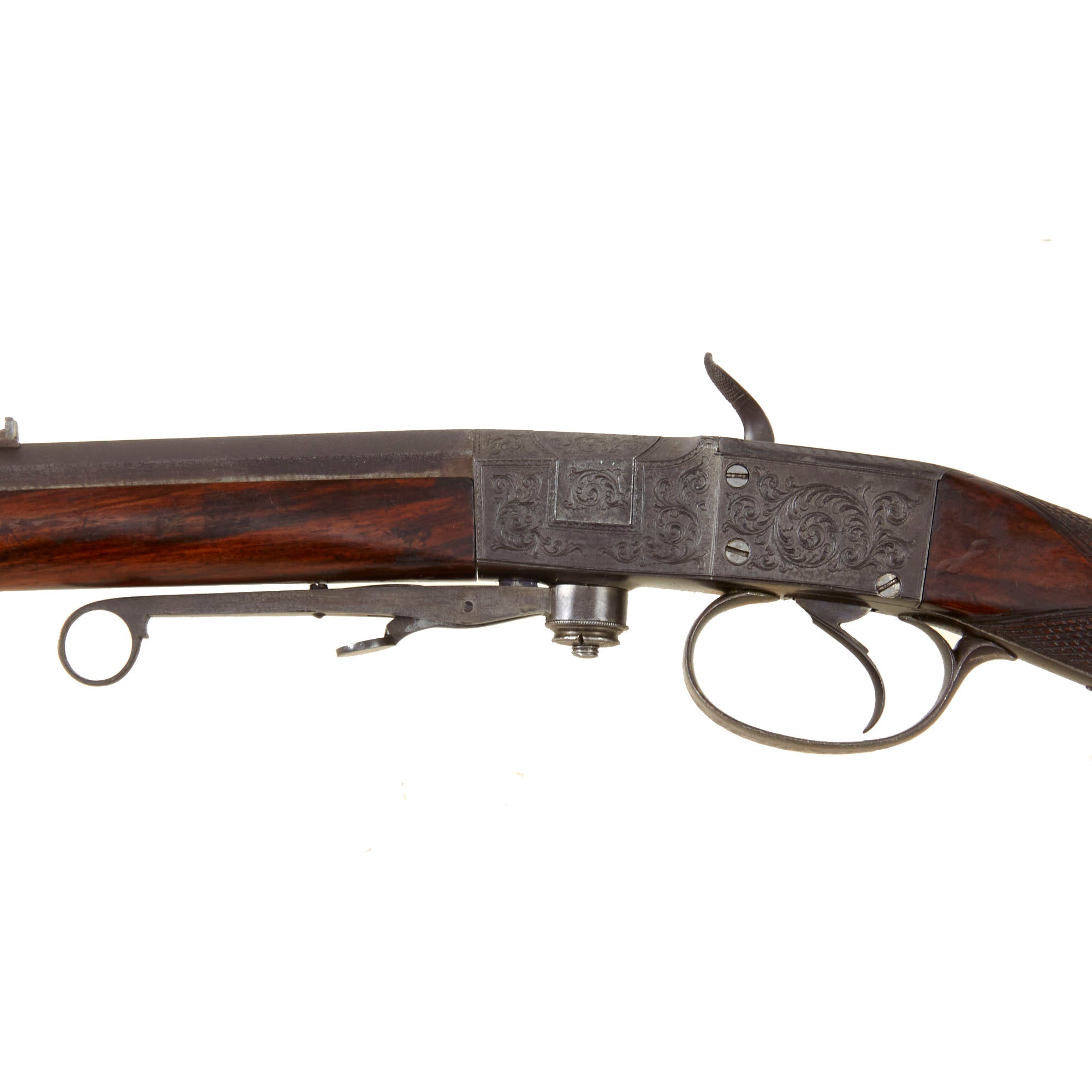Original Item: Only One Available. Here we have a very interesting Victorian Era British Sporting rifle, which utilizes a "rotating breech" system of a configuration that we have not really seen before. It features a "box lock" type action with a hammer on the right side, however this is just used to cock the gun, as there is a firing pin inside of the action. There is a lever under the fore stock with a latch, which when swung out to the side, rotates the breech block sideways, for loading, though we are not sure exactly what type of cartridge would be used, as there is not much room for any type of rim on the cartridge. It would also not have a very large powder load at all unless this is the type of system where the bullet would be rammed in from the front. Definitely a very interesting gun!