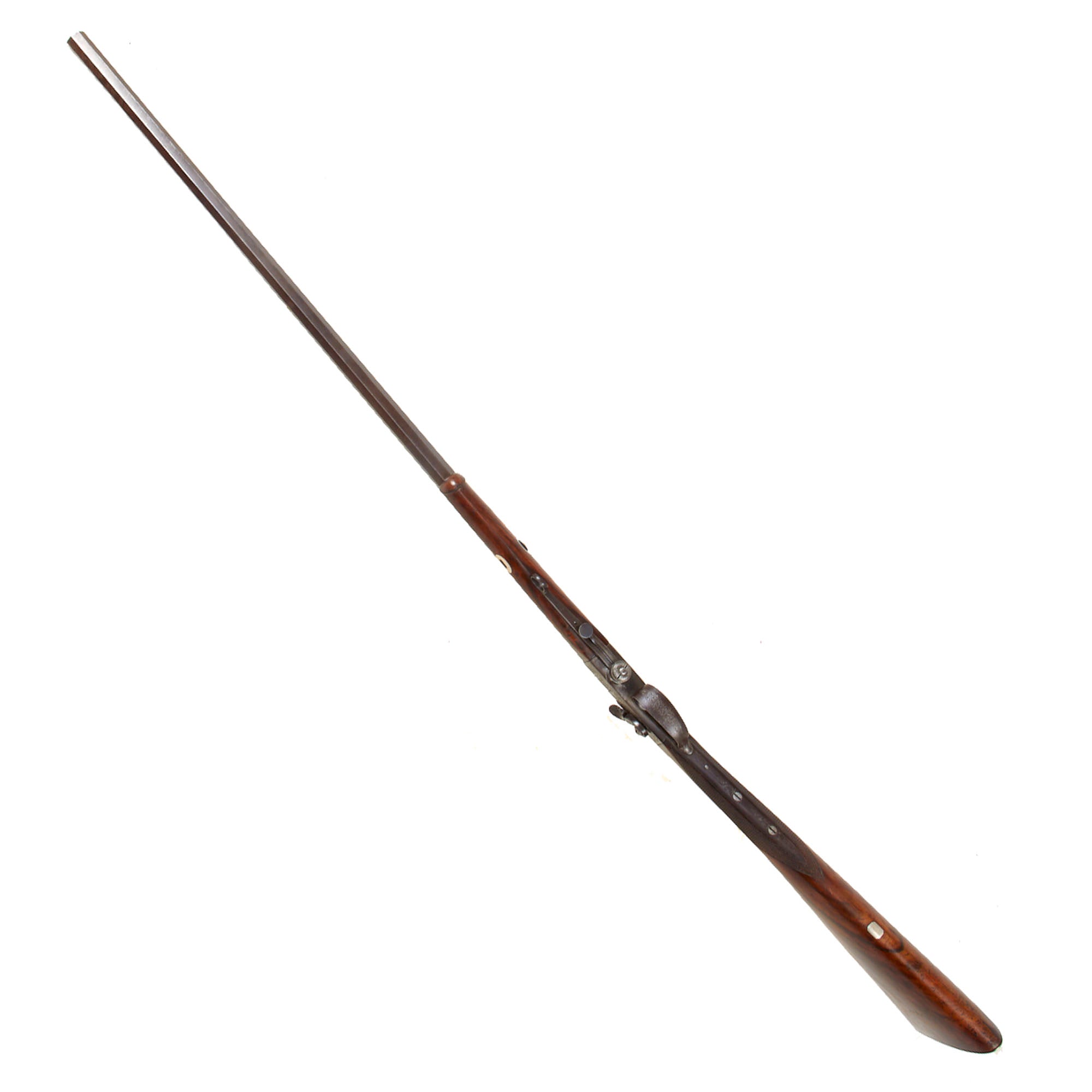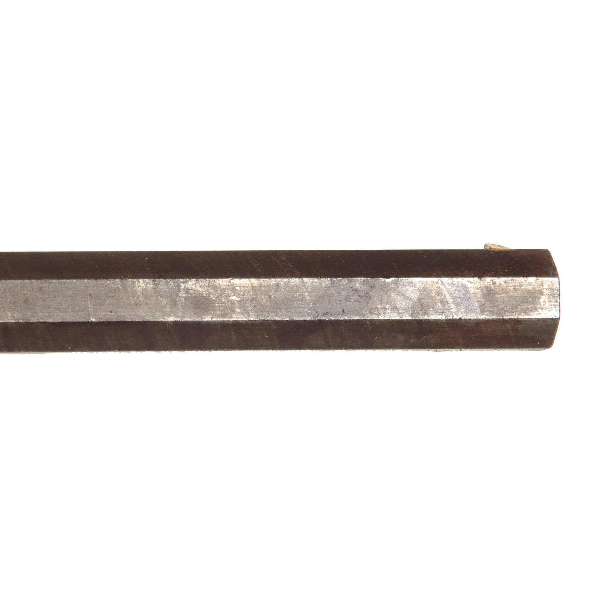The gun has a 29 1/2 inch long octagonal barrel with a bore of approximately .40", and measures 47 inches in overall length. It definitely looks to be a sporting or perhaps target gun, and is not fitted with any type of sling attachment points. The barrel is definitely spiral forged, which means that the barrel was forged using twisted pieces of metal, clearly visible when the fore stock is removed. Many gun barrels of the 19th century were made from nails, stubs, chains, and even horseshoes, as the wear and use of these items resulted in superior barrels when they were forged and twisted.