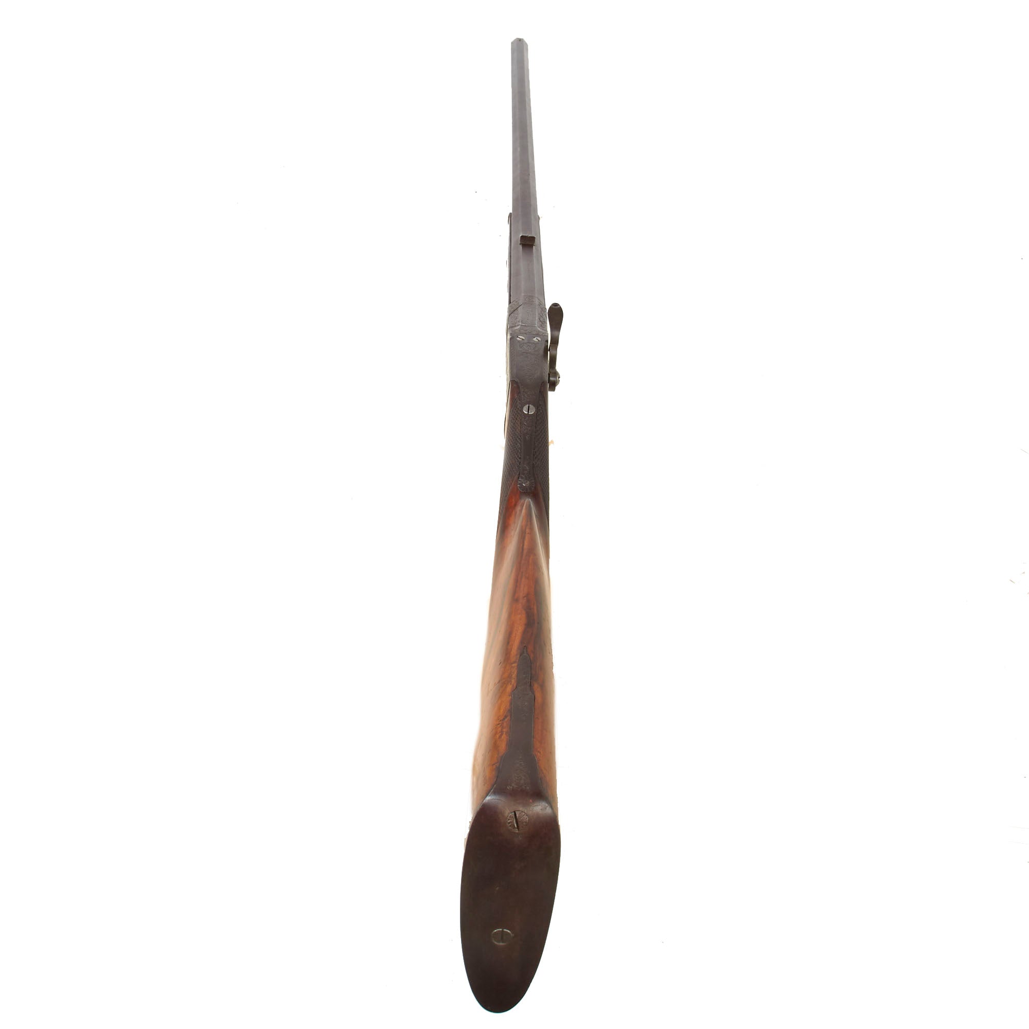 The rifle shows an extremely high level of artistry, with the action fully engraved on all sides, and the stock wood being lovely curly walnut. The top of the barrel is marked: