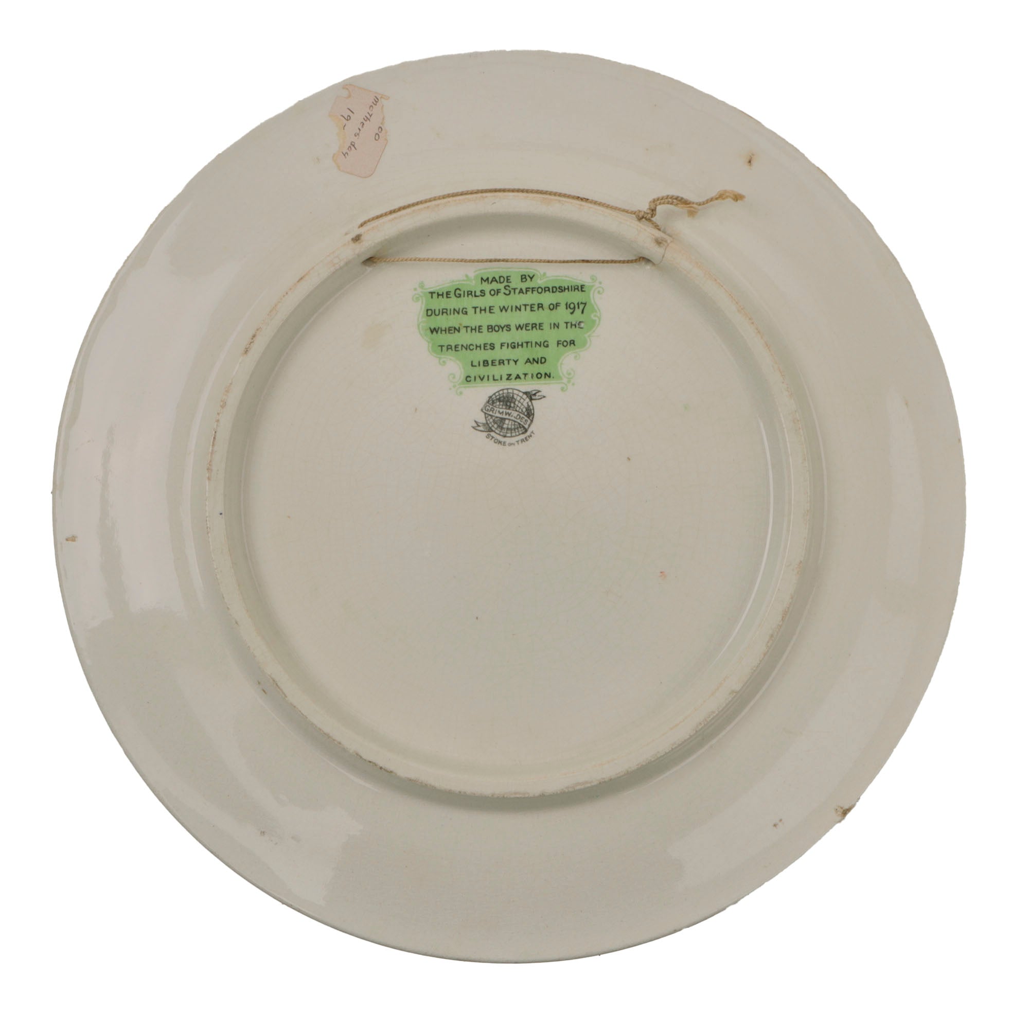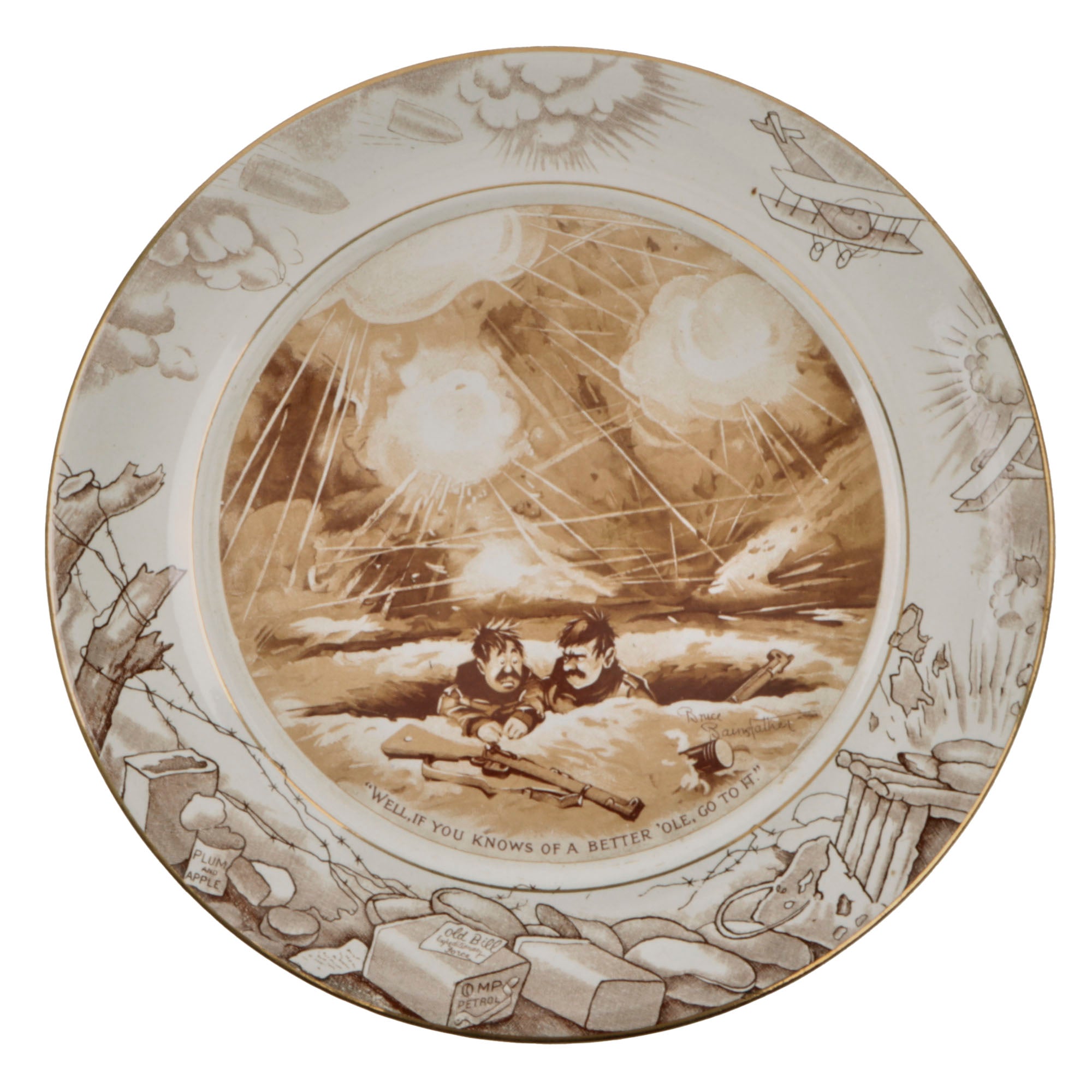 The second plate depicts two boys tinkering with an unexploded artillery shell, the first saying “Give it a good ‘ard un Bert, you can generally ‘ear ‘em fizzing a bit first if they are a-goin to explode”. It measures 10” in diameter and has a great maker’s mark reading: