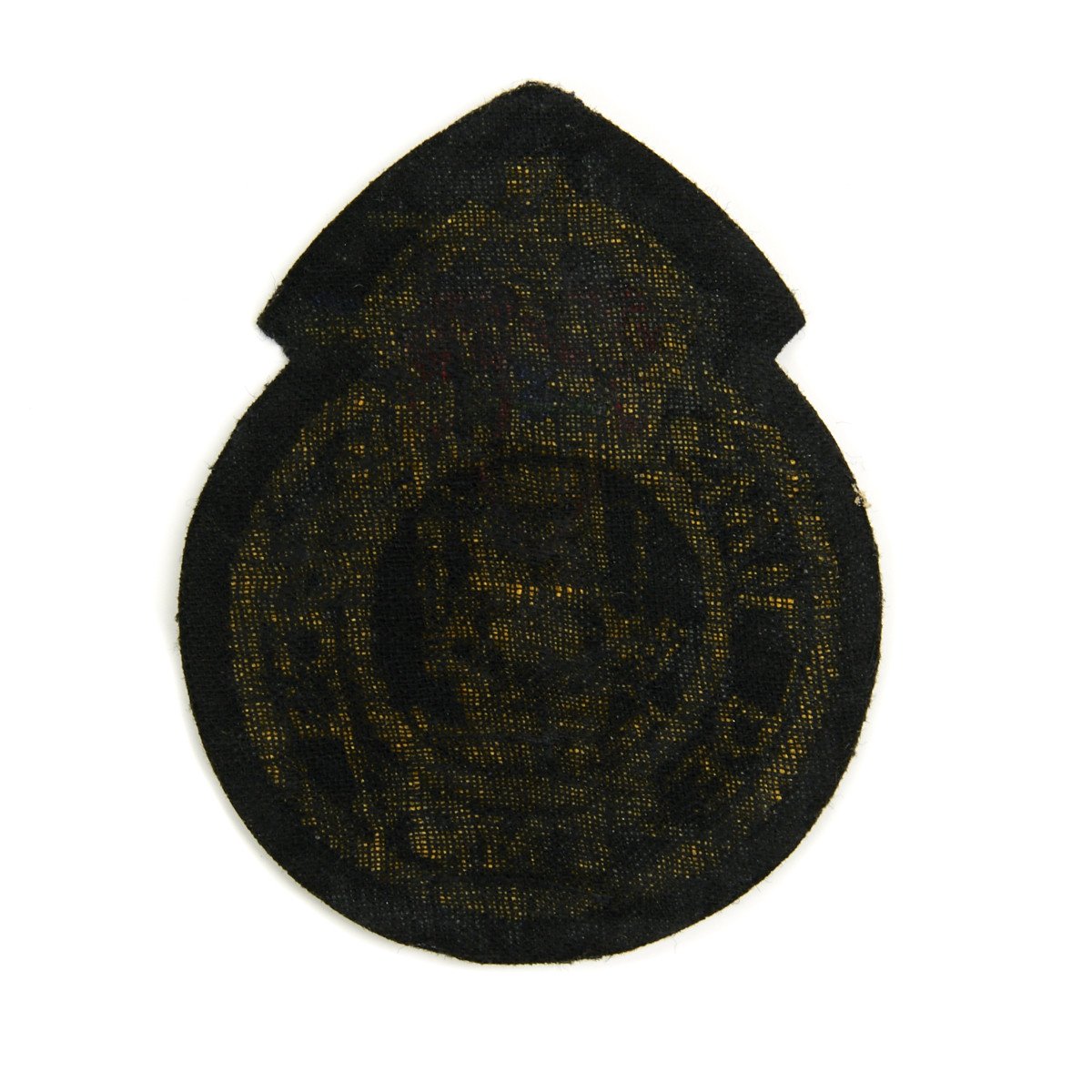 These embroidered cloth Civil Defense Corp. badges show a face-on view of a gold rampant lion holding sword and scepter surmounted by Royal Crown in red and gold with navy background. At 4" across this Badge is an impressive as well as historically significant.