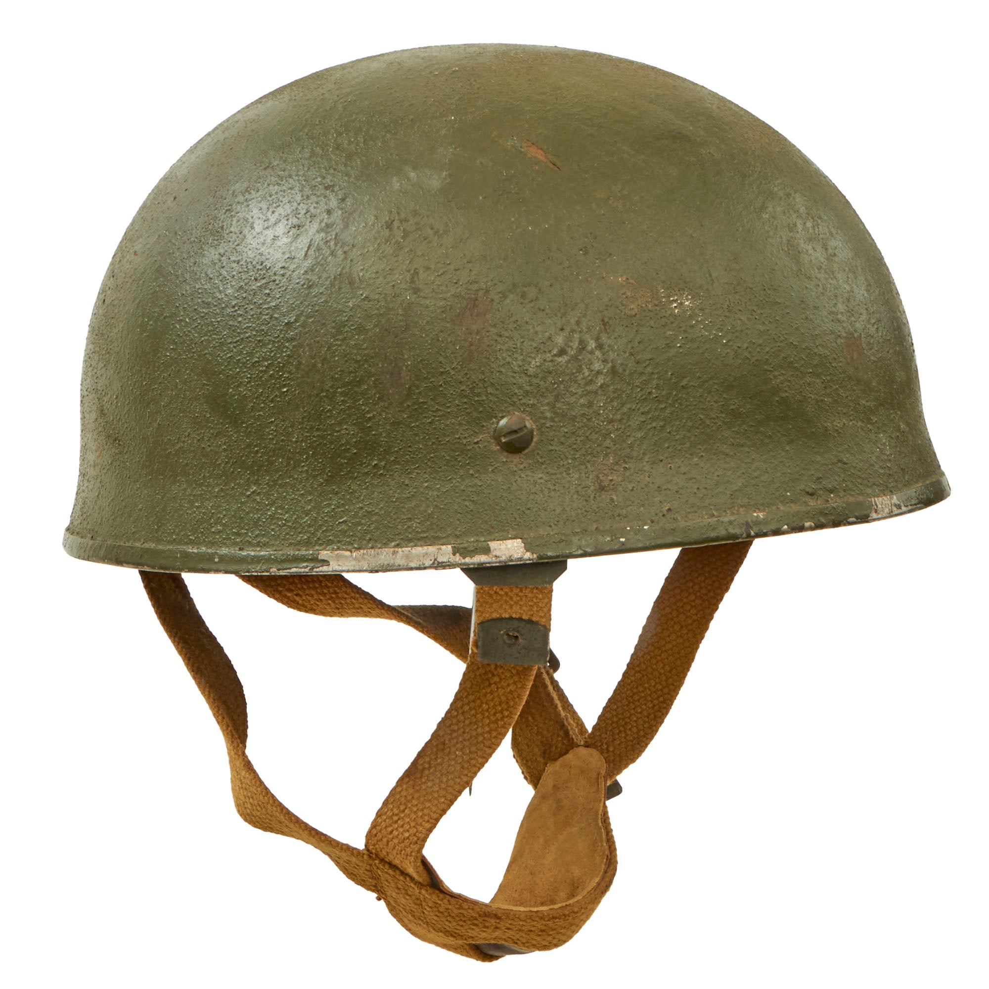 The next step in the evolution of the British helmet came in 1942. This helmet featured a similar shell design, but with a thick vulcanized fiber band rim that clearly distinguishes it from the German model, along with a four-point chinstrap system and a band of sorbo rubber for padding. These early helmets used leather chinstraps and are considered quite rare.