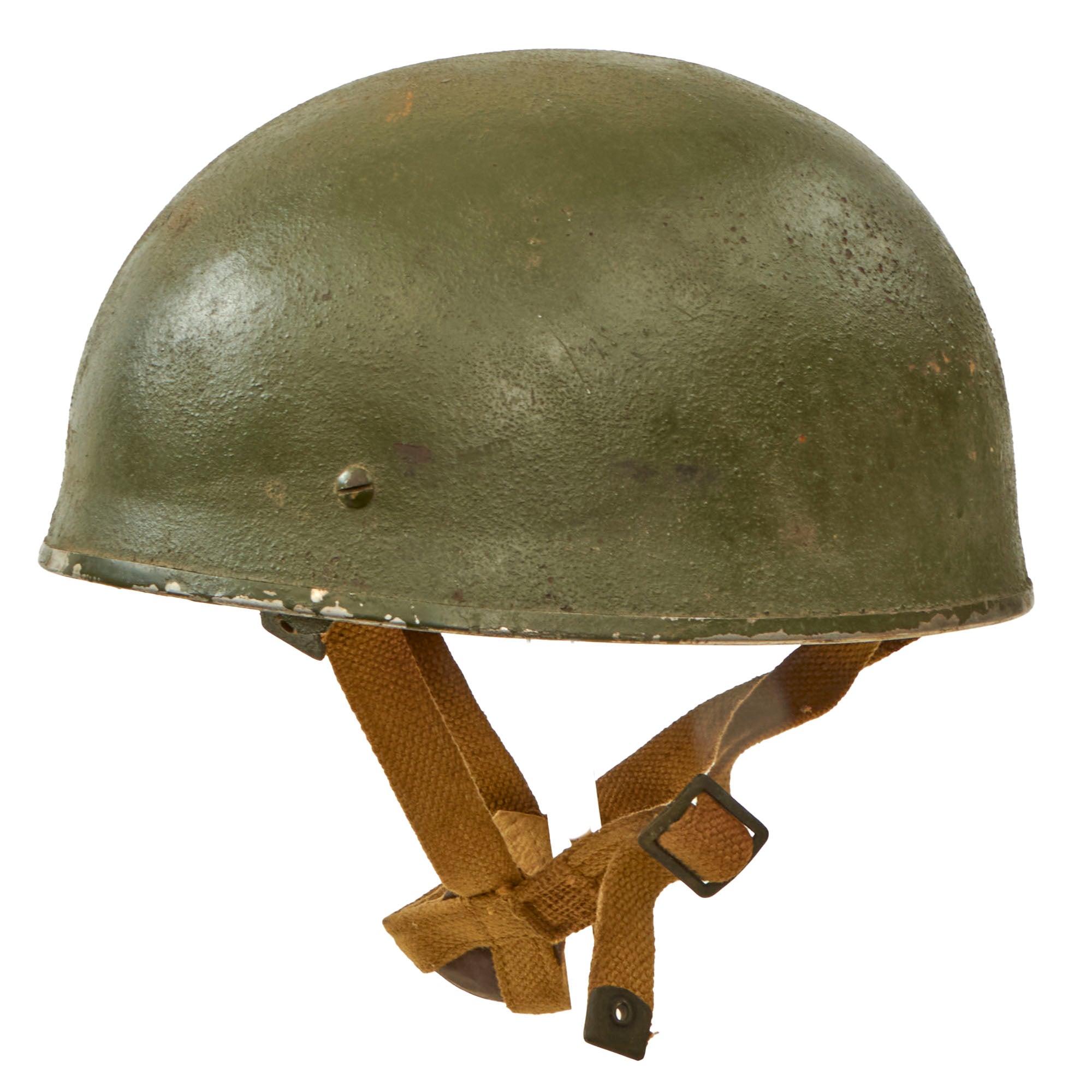The fittings of the wartime issue varied from the 1950's postwar issue. The wartime chinstrap had brass ends and rivets: these were manufactured in blackened steel in the 1950's (in line with production of the 1937 Pattern web equipment at that time). The temporal bales of the postwar helmet were of a slightly different design.