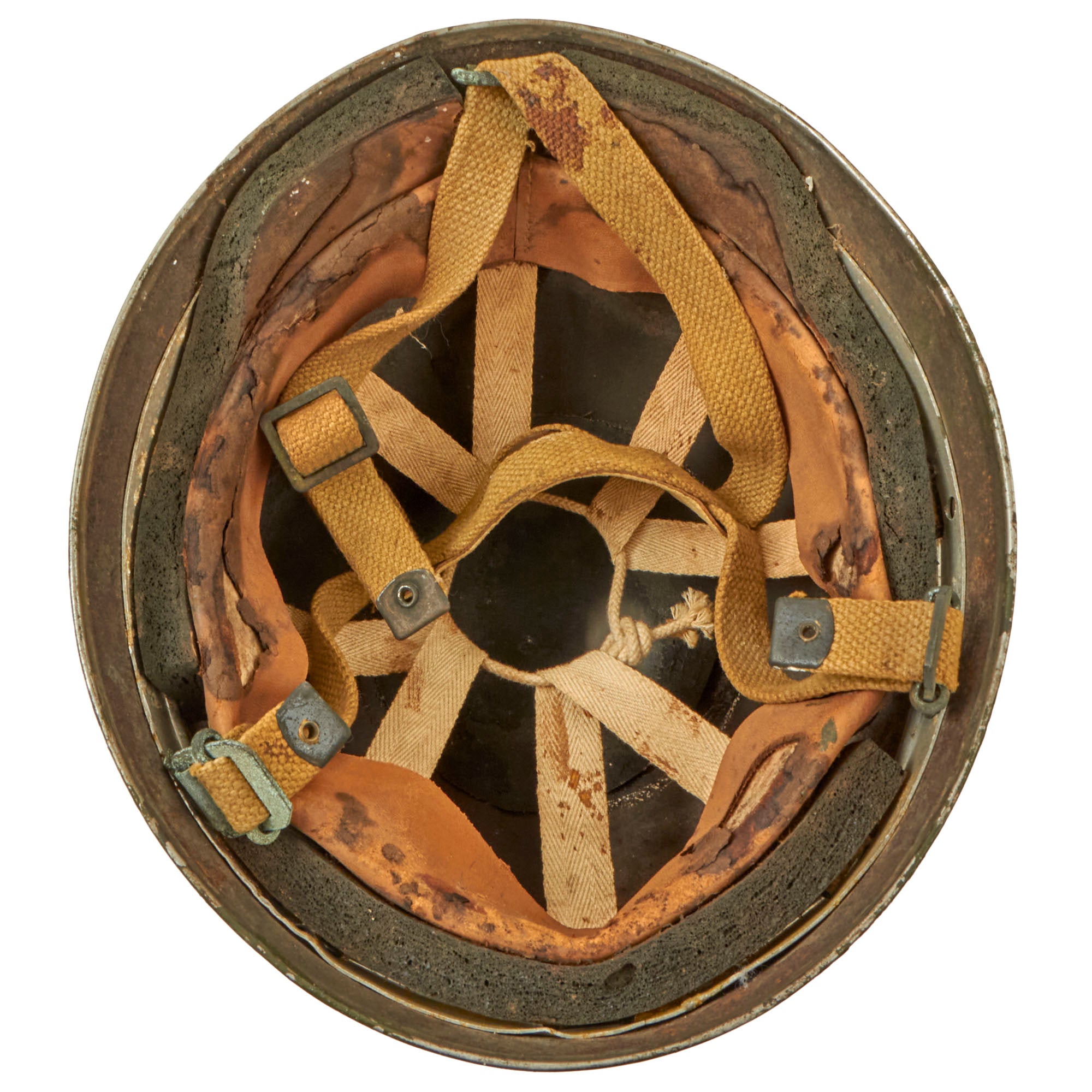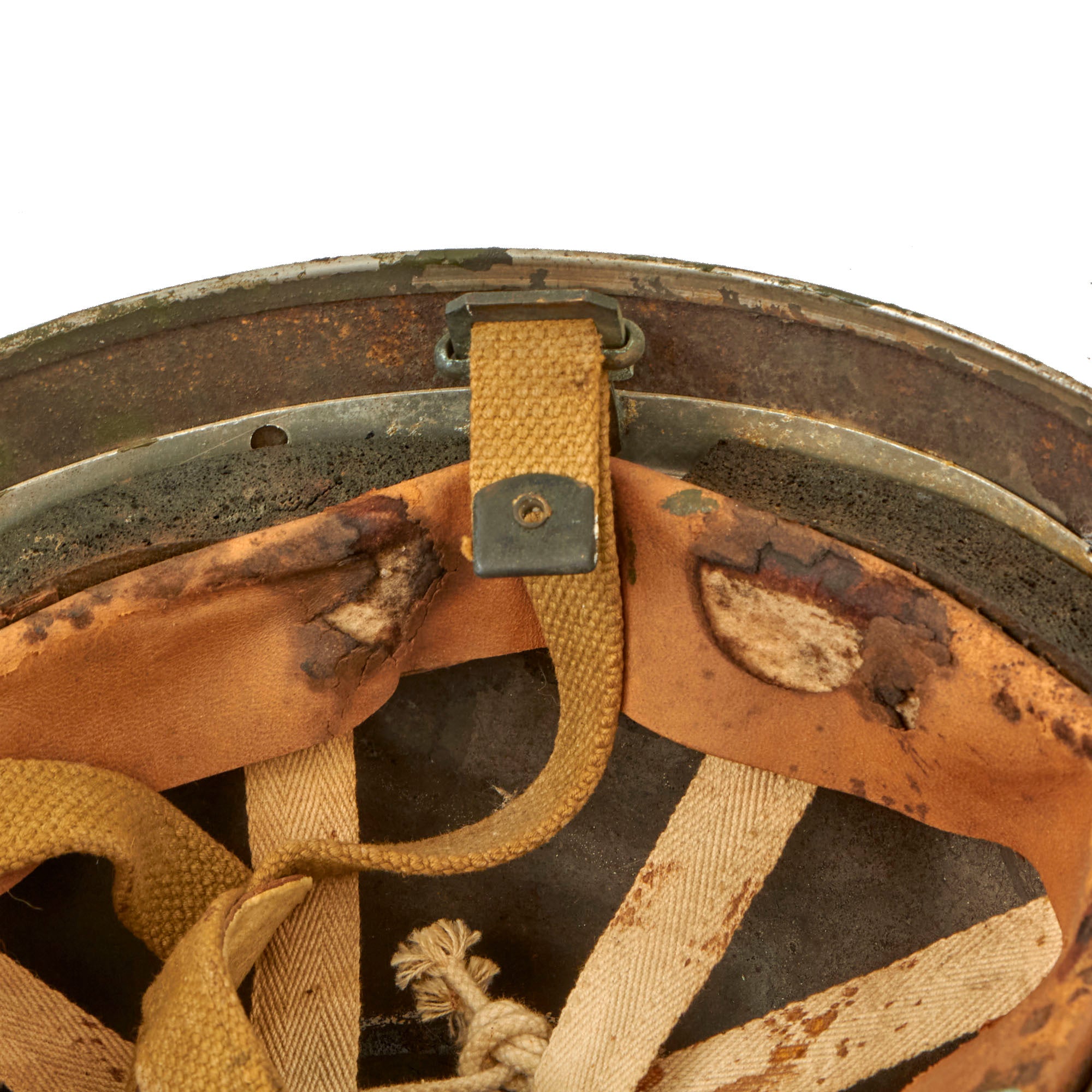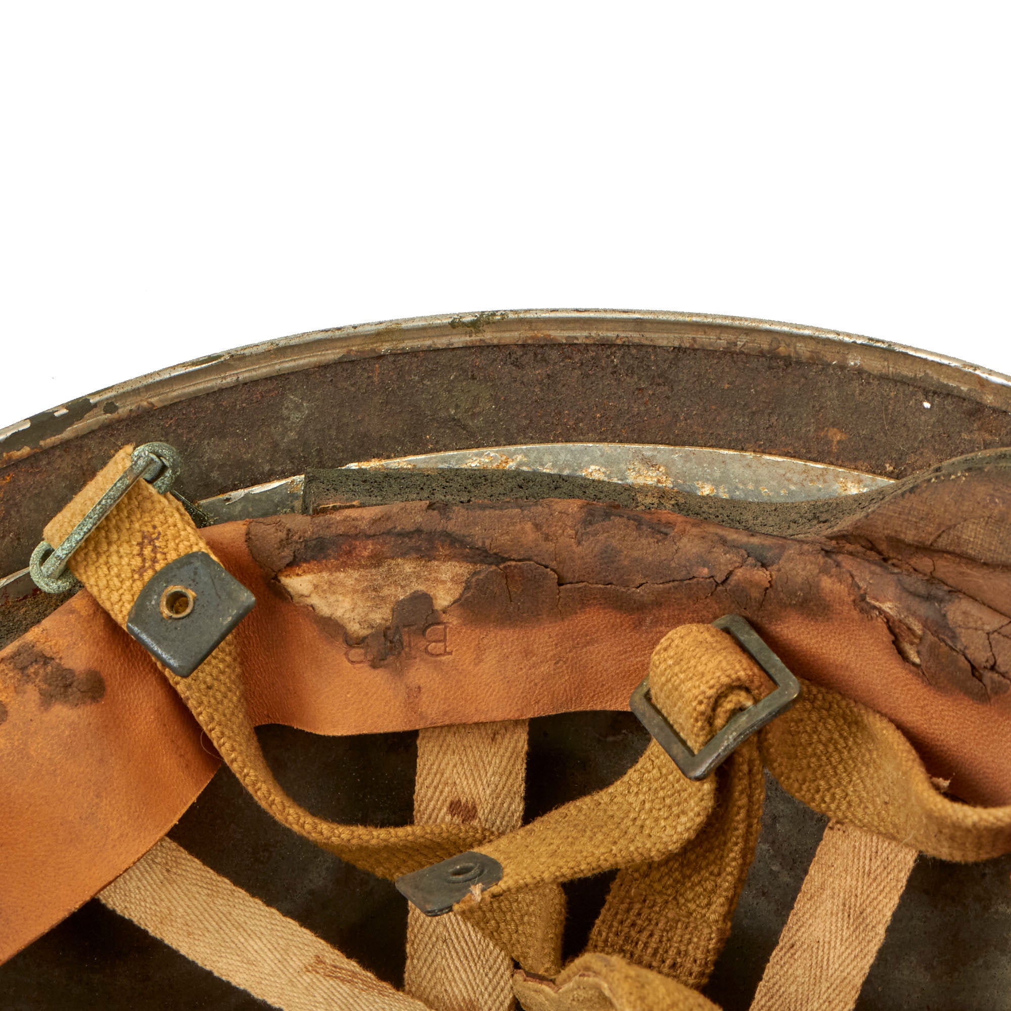 The liner is stamped BMB, with the leather below this marking missing due to dry rot, so the year of manufacture and size are lost to time. The chinstrap and leather cup are present and in worn condition with staining and verdigris. The chinstrap ends are the correct wartime brass (we checked with a magnet) and not the post-war steel. The helmet retains about 90% of its outside paint. The liner comes complete with all padding and suspension strap, but due to the heavy dry-rotting of the leather, we wouldn’t recommend wearing it.