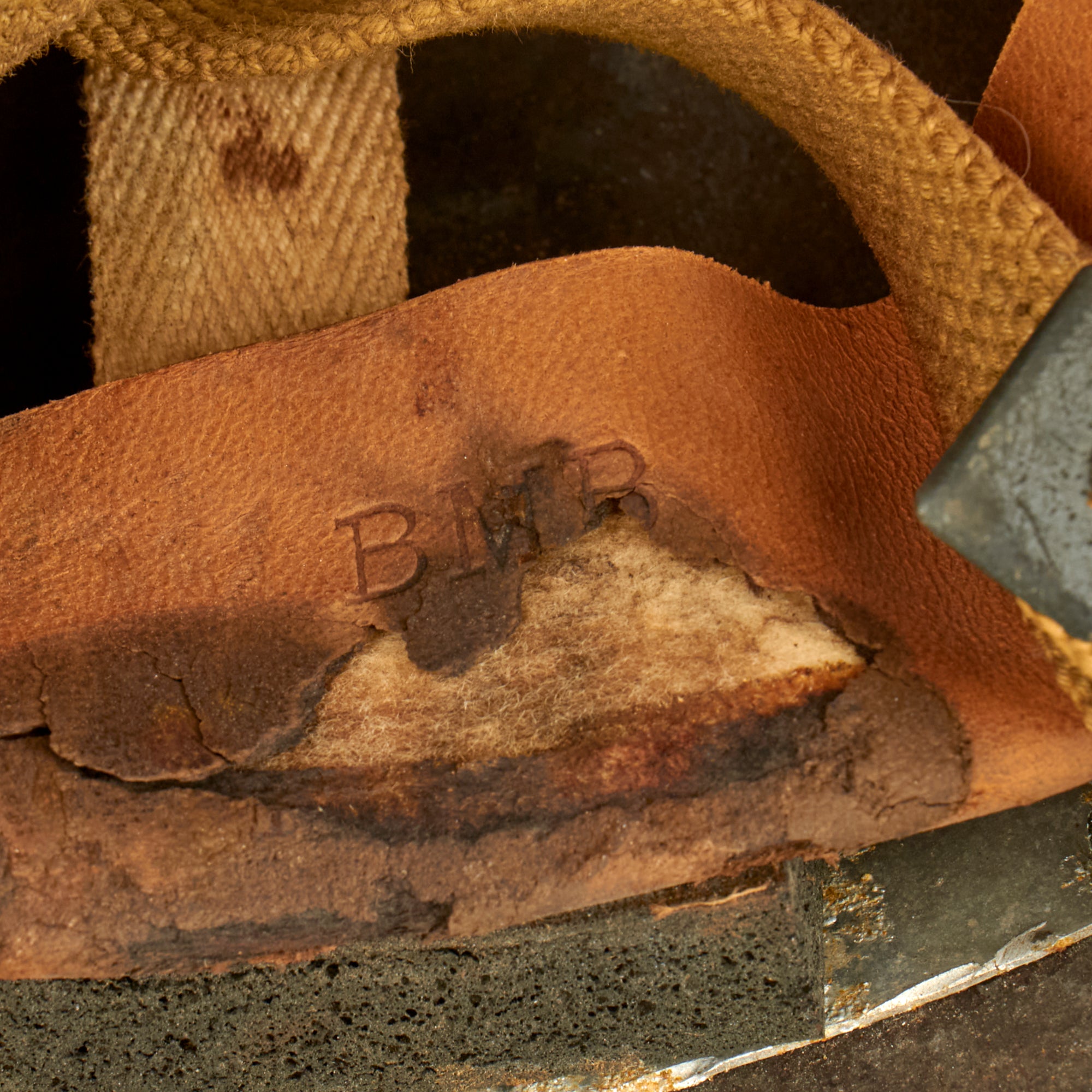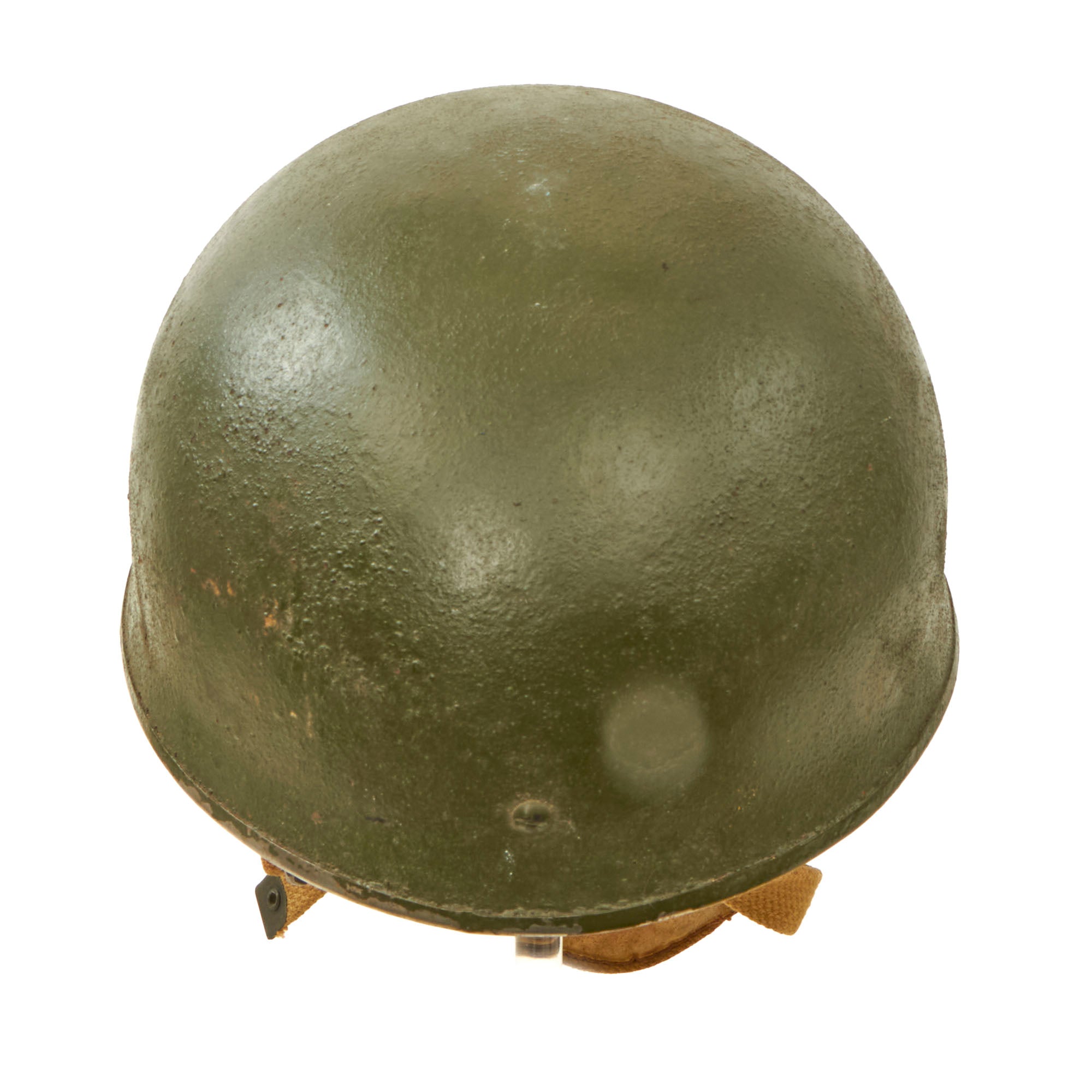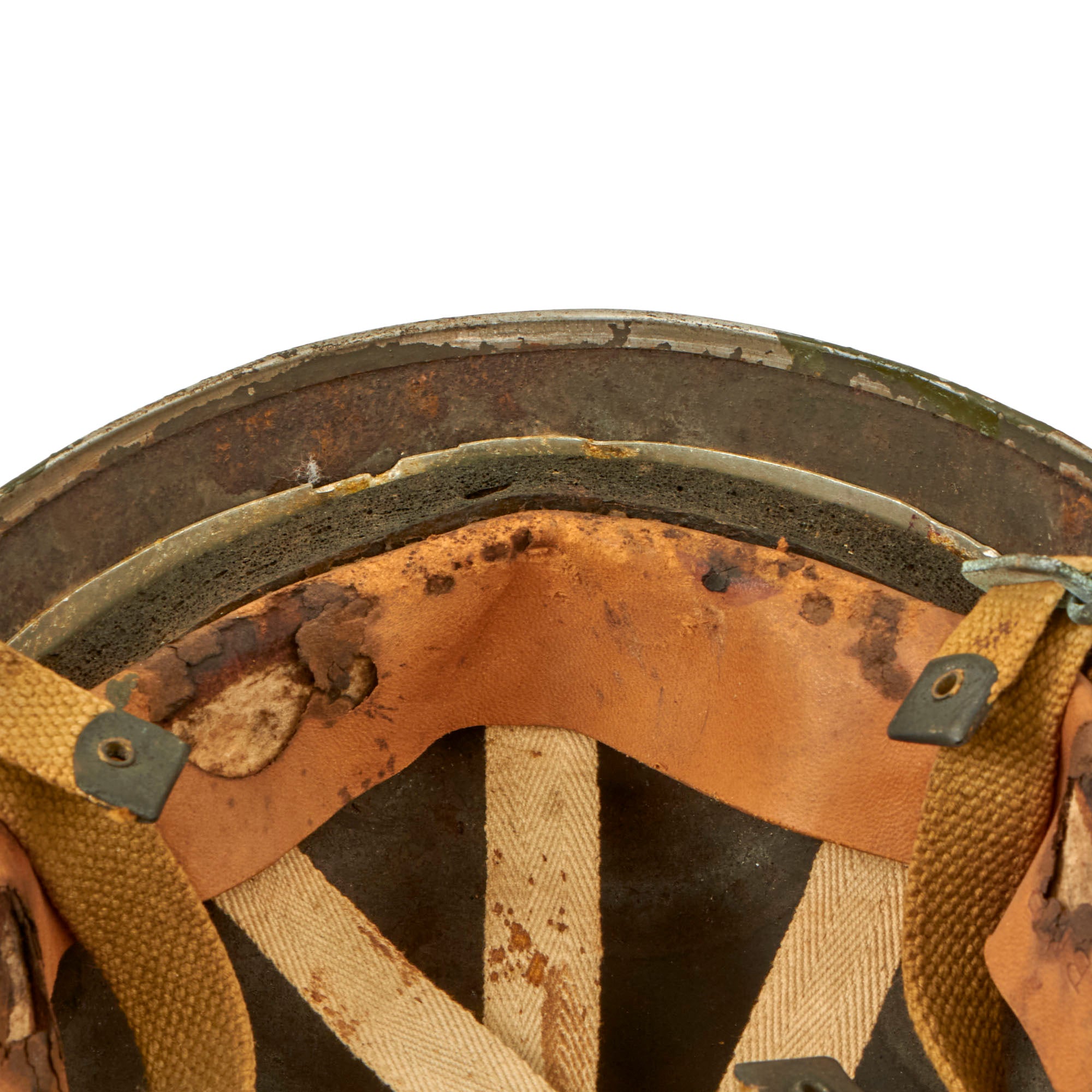 The liner is stamped BMB, with the leather below this marking missing due to dry rot, so the year of manufacture and size are lost to time. The chinstrap and leather cup are present and in worn condition with staining and verdigris. The chinstrap ends are the correct wartime brass (we checked with a magnet) and not the post-war steel. The helmet retains about 90% of its outside paint. The liner comes complete with all padding and suspension strap, but due to the heavy dry-rotting of the leather, we wouldn’t recommend wearing it.