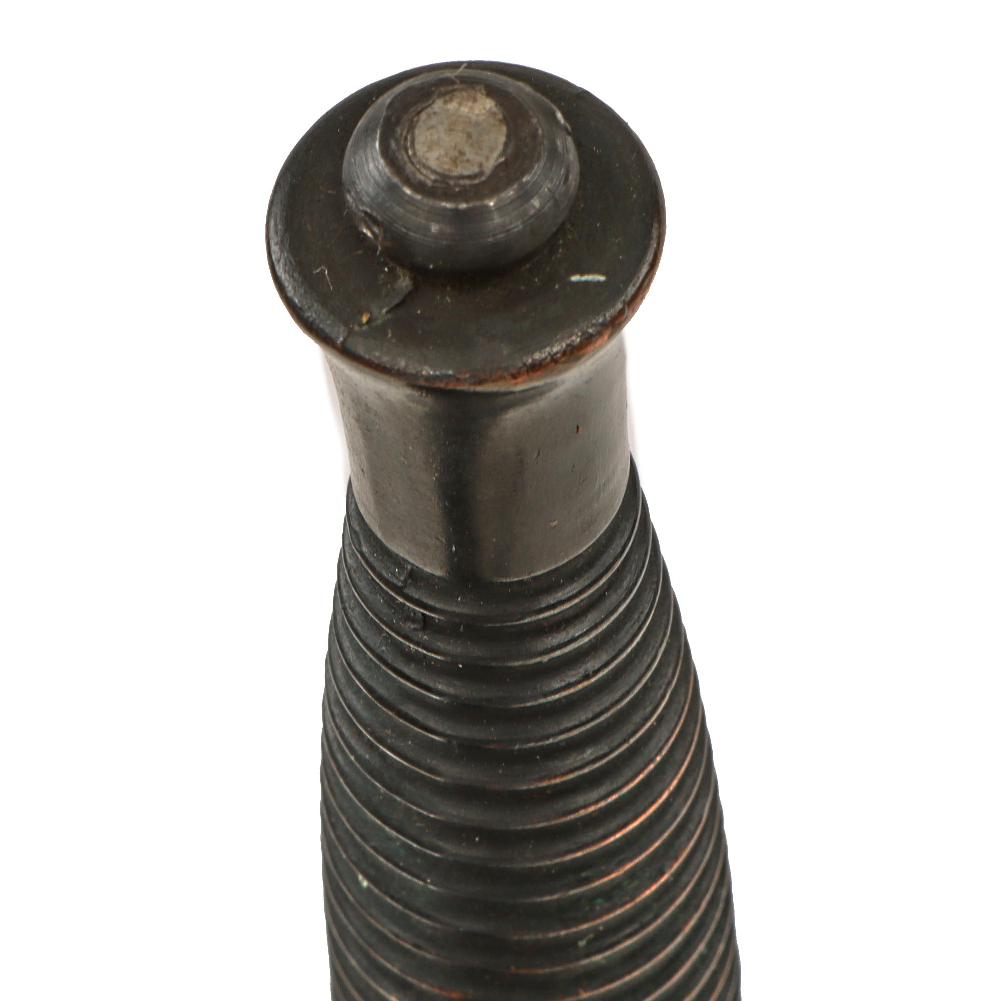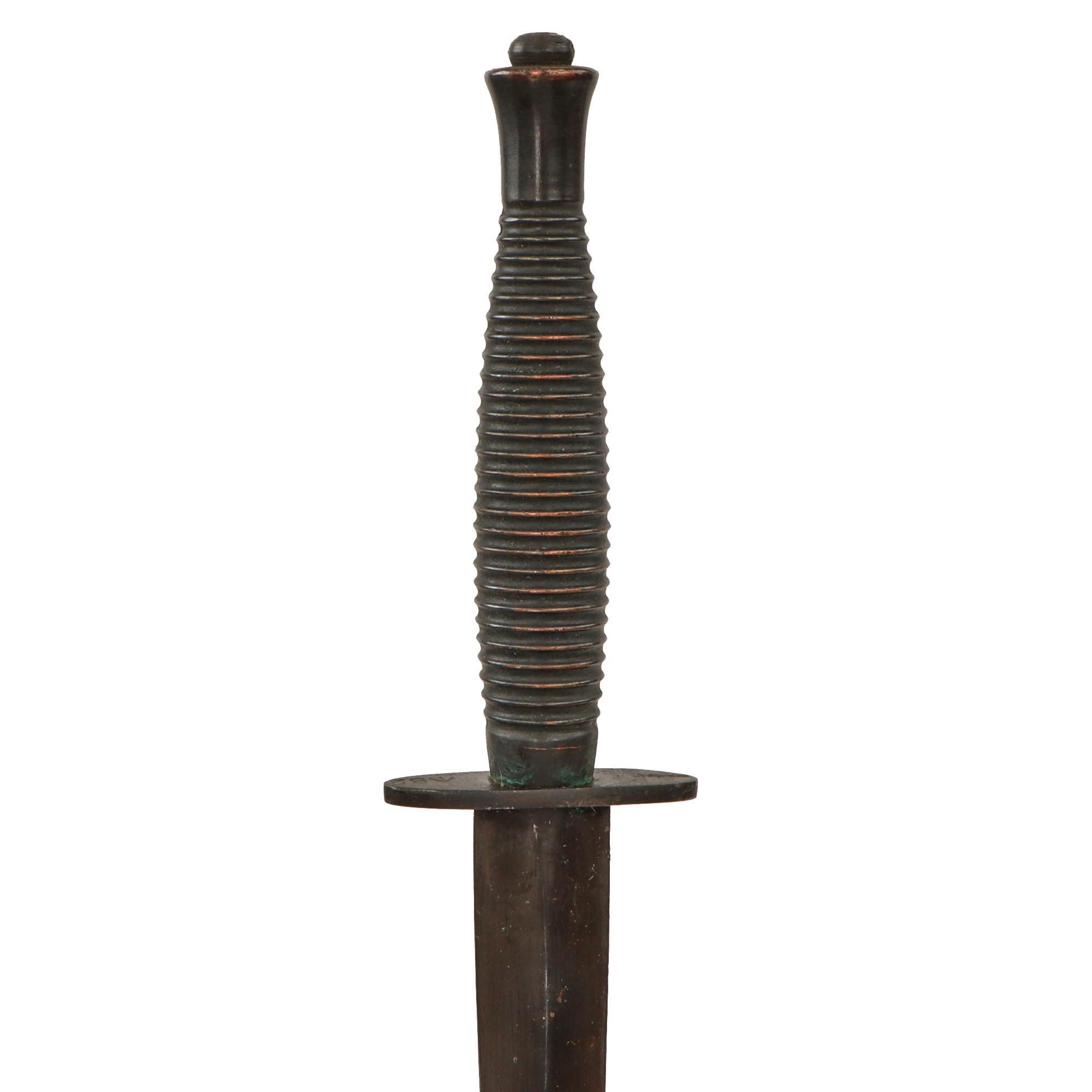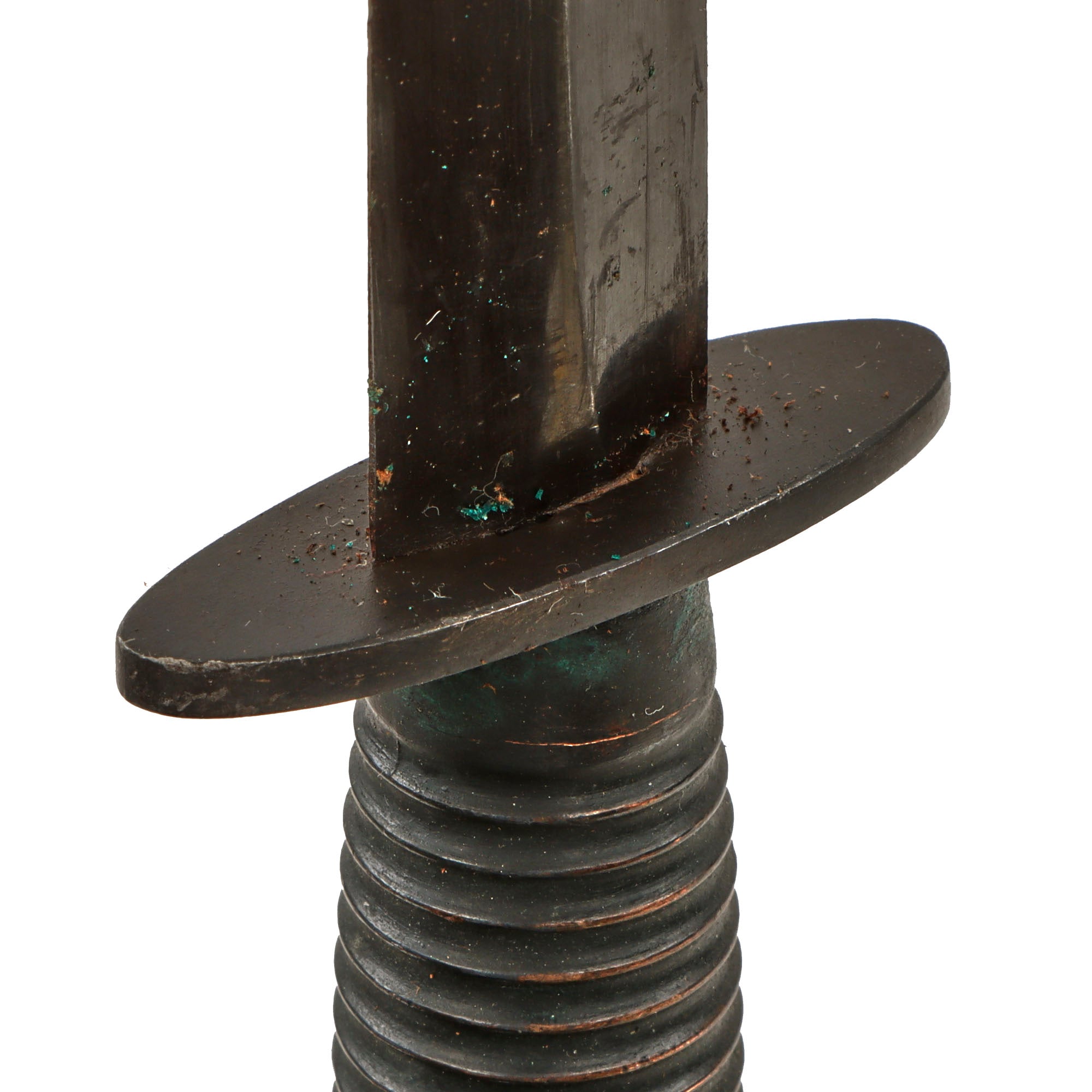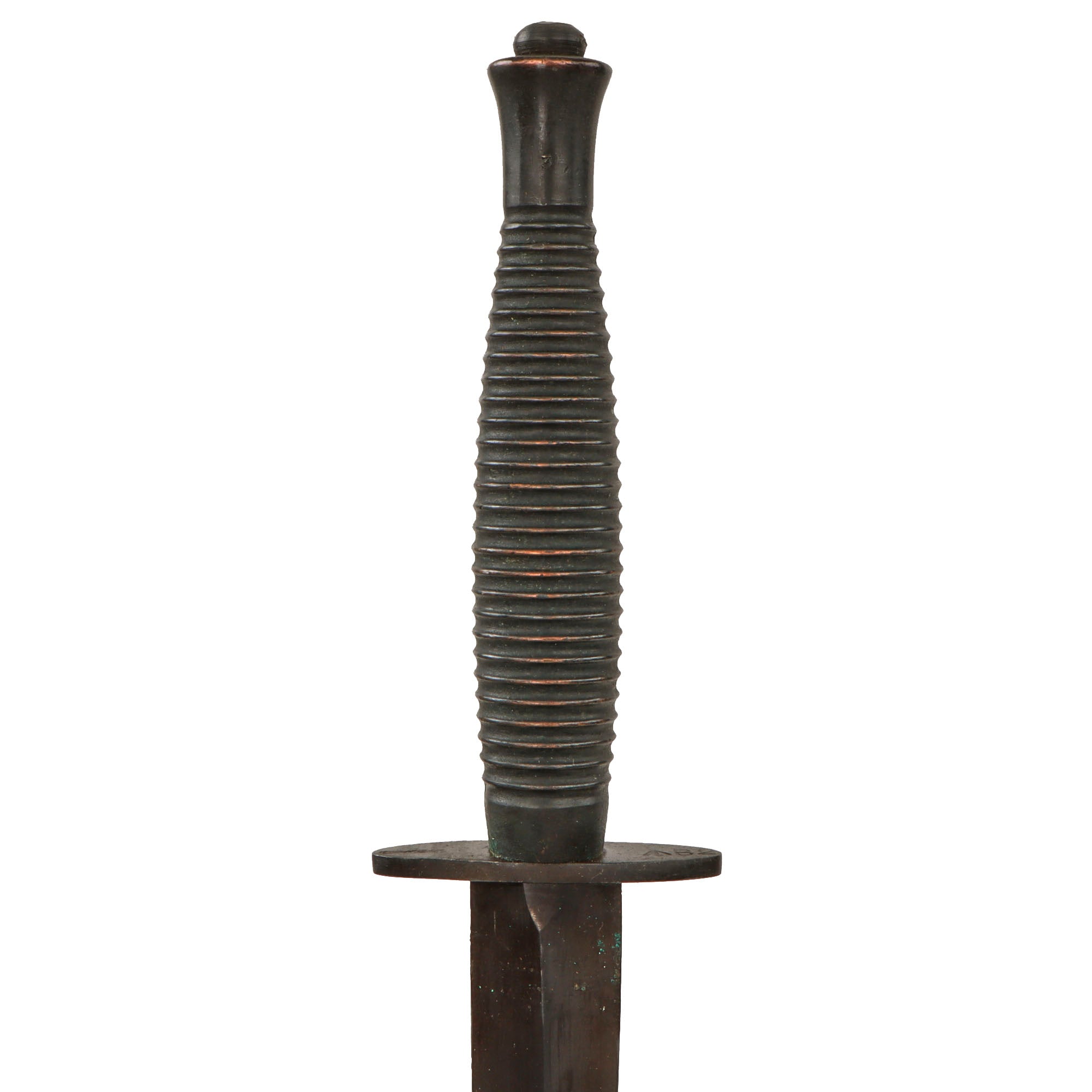 Original Item: Only One Available. This is a very good example of a late "Third Pattern" British Fairbairn-Sykes commando dagger, with a copper-plated alloy handle and original scabbard. As brass was a "strategic material," only the early examples of the third pattern have brass handles, with later war produced models having blacked alloy handles. The handle dates production to late 1944 - early 1945. The knives varied somewhat in size, and this example measures 11½", with a 6 3/4 inch blade. This example comes with the standard belt scabbard with the tongue intact, though the elastic strap is gone.