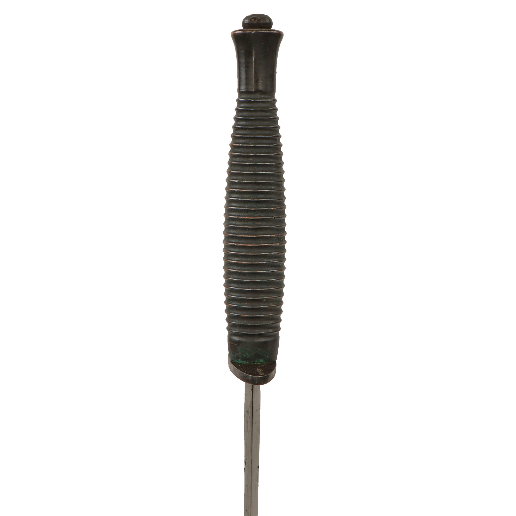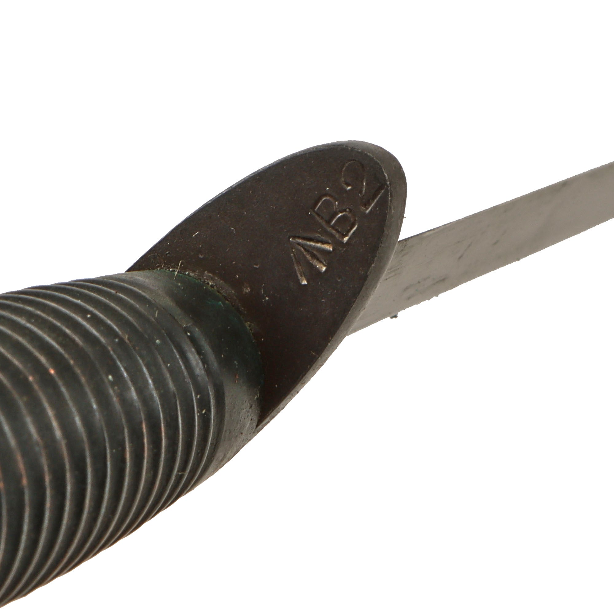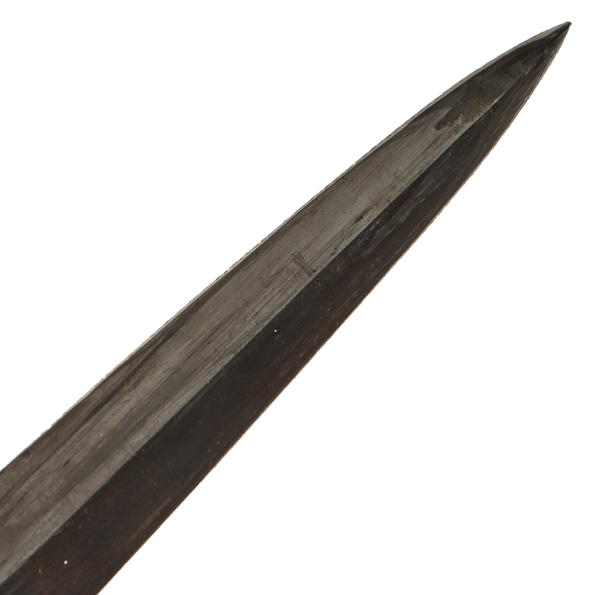 The condition of the knife is amazing, still with relatively sharp edges, and a large amount of the original black finish on the blade. The plain blued steel cross guard is tight on the blade with no wobble and some minor surface oxidation and much of the original finish. It’s marked on the underside of the crossguard with Broad Arrow B2. It is also marked on the underside of the crossguard with the standard ENGLAND stamping which was done for exportation purposes.