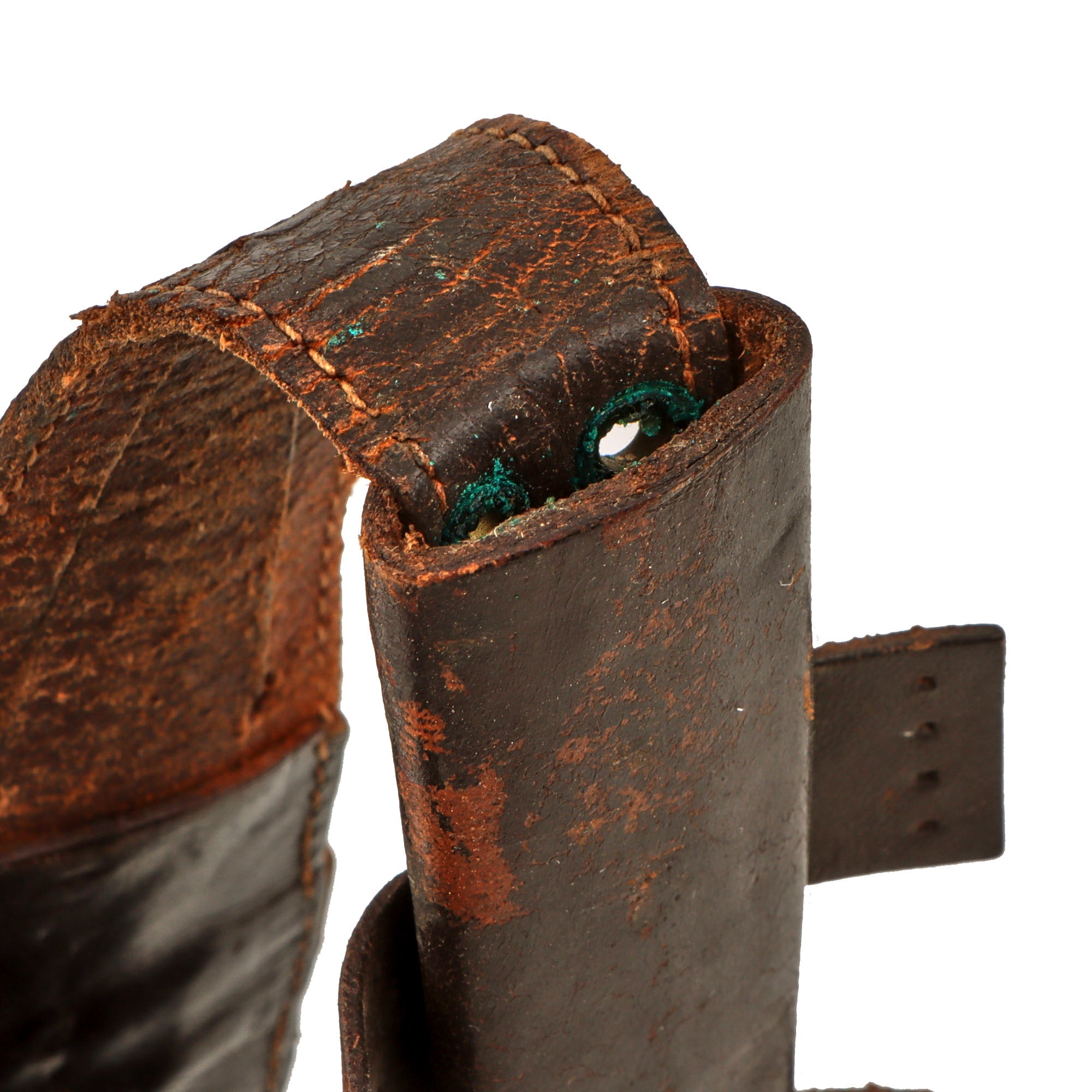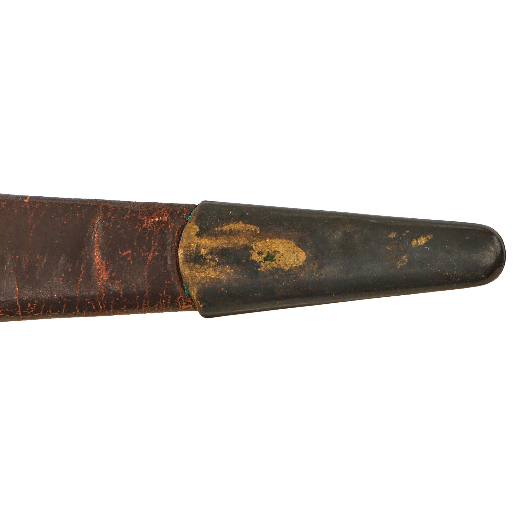 The scabbard is in good condition, with the expected wear from being used in service. The leather is well broken in and soft, with some creasing and a few small tears. The brass chape is still present. The tongue is still intact but it is very weak and floppy. The elastic band is broken and gone. The scabbard is also marked ENGLAND on the tongue.