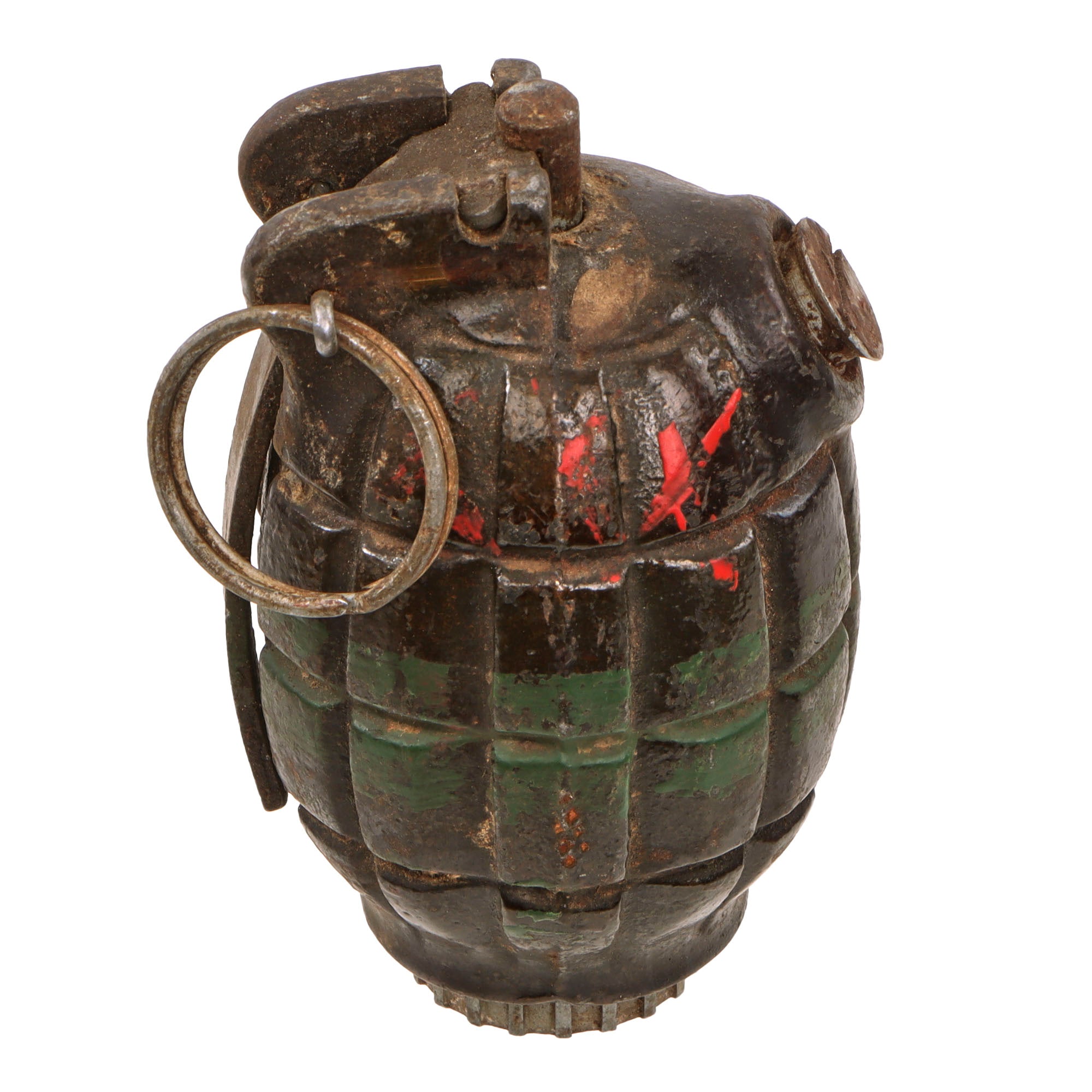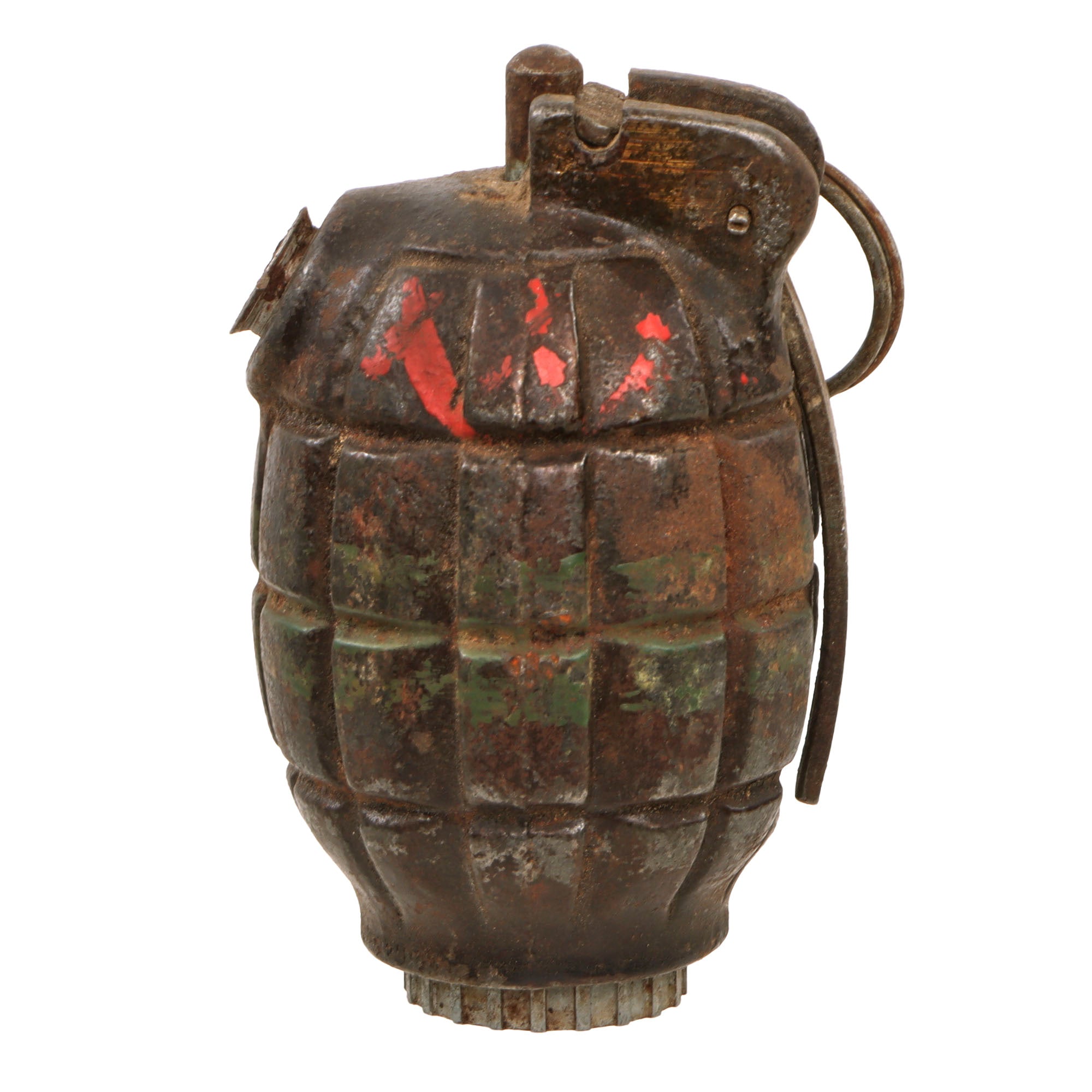 Original Item: Only One Available. This is a very good totally inert example of a 1943-dated No. 36M MkI Grenade known as the "Mesopotamian" variant due to its shellac-coating which was designed to keep moisture and humidity out of the detonator's fuse. The No. 36M MkI was the British army's standard hand-grenade during WWII. This wonderful example is complete with internal parts (no explosives!) and original paint, including remnants of the three red Xs along the side which indicate that it is the waterproofed No.36M model. The cap on the bottom reads: