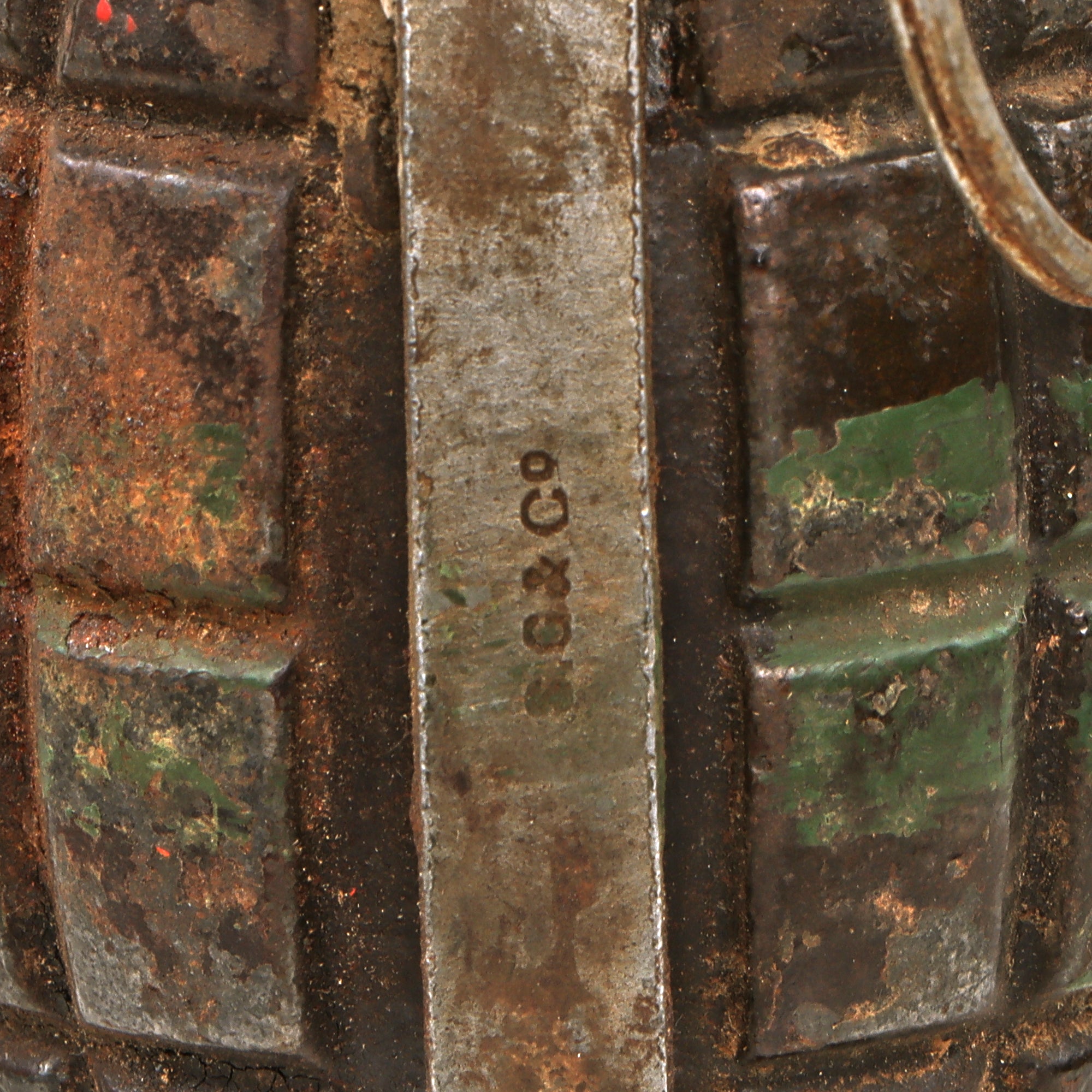 The No. 5 Mk. 1 was the first version. The explosive was filled through a small circular plug on the upper half, the detonator assembly was inserted into the centertube of the mills through the bottom of the grenade body via the baseplug, the striker and spring is held in tension through the middle by the lever that was held down on the lugs (ears) located on the top of the grenade body via a split pin and ring called the safety pin/ pullring. It was first issued in May 1915 and entered general issue when mass production caught up a year later in 1916.