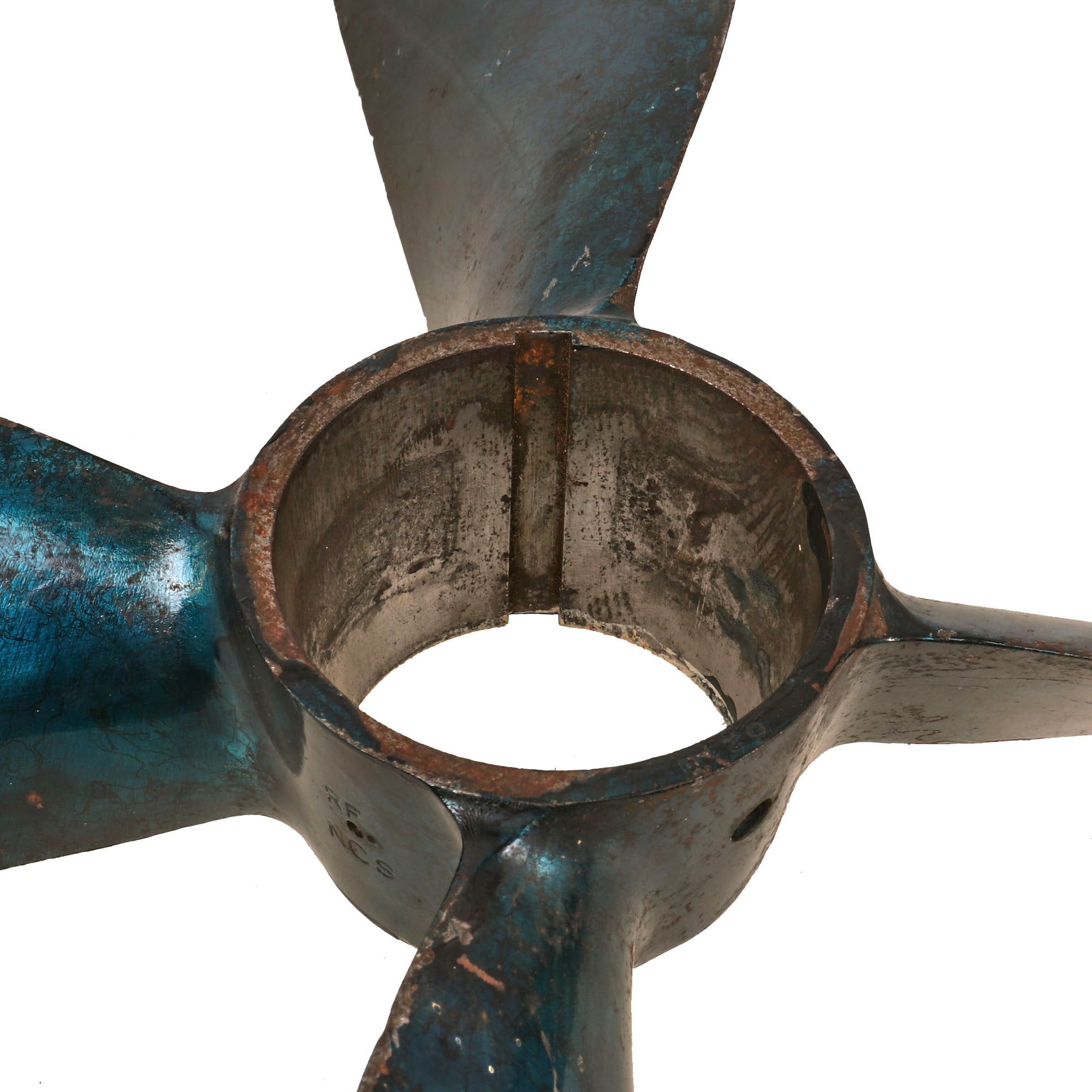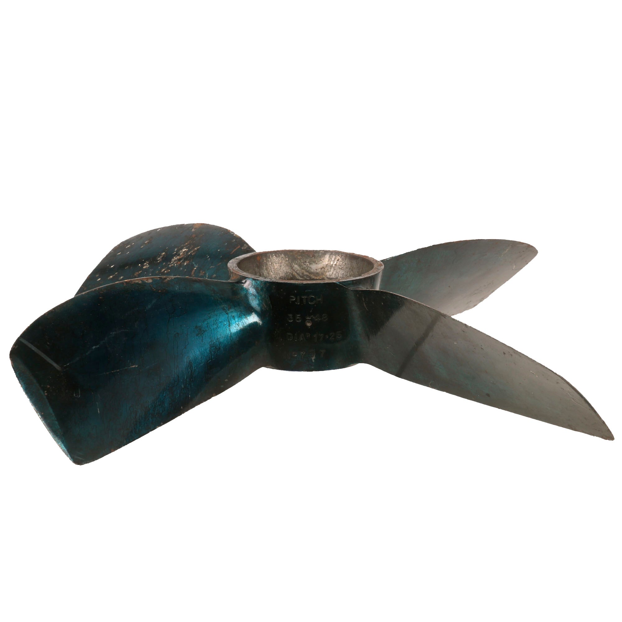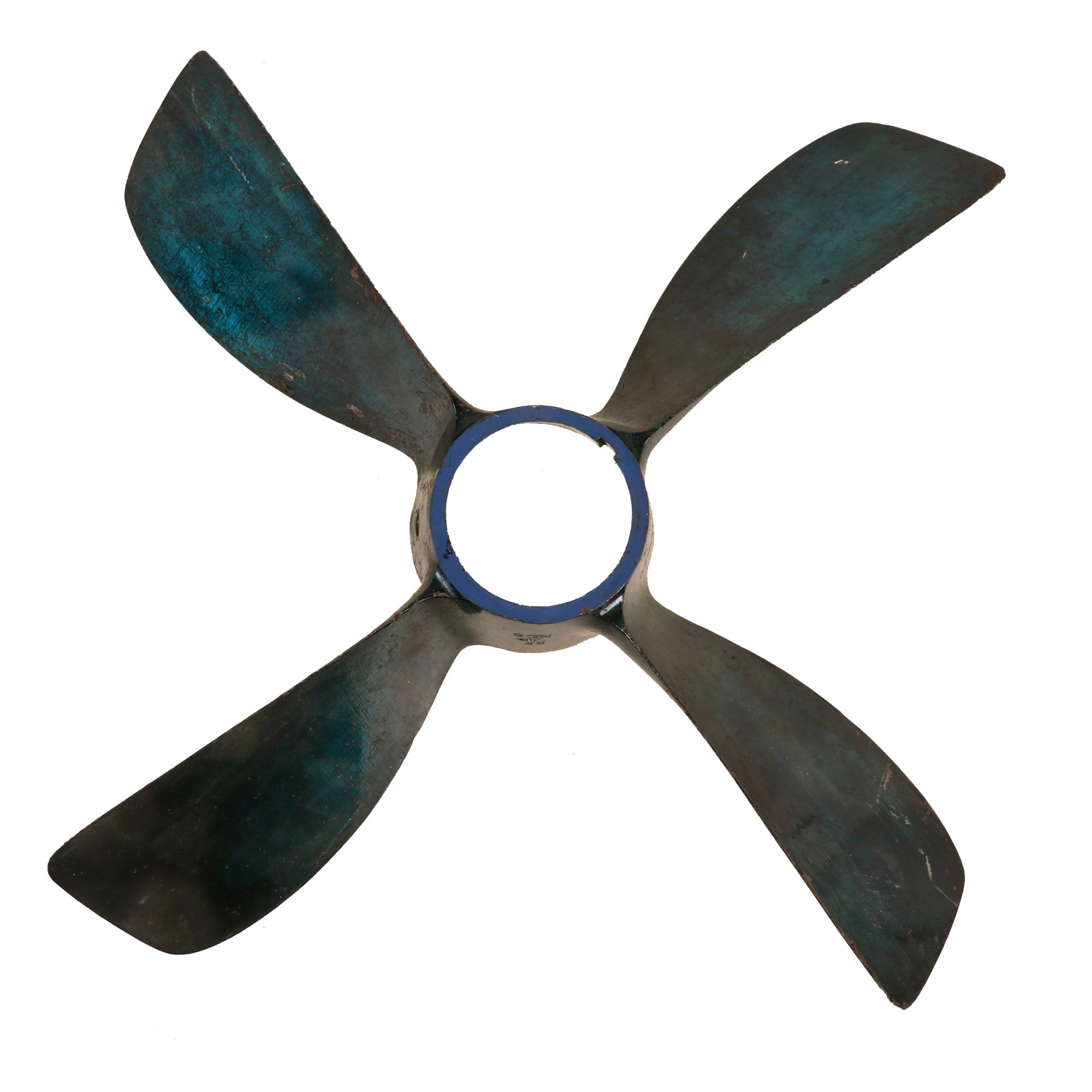 Original Item. Only One Available. The Mark VIII was designed circa 1925 and was the first British burner cycle design torpedo. It was used from 1927 on all submarines, beginning with the later versions of the L class and the Odin class, as well as motor torpedo boats. The principal World War II version was the improved Mark VIII**, used far more than any other torpedo in service, with 3,732 being expended by September 1944 (56.4% of the total number of torpedoes used by Britain during the war).This is a gorgeous example of a propeller off of a British Mark VIII torpedo. The propeller has a gorgeous bluish color and retains many of its markings:21” 1X-1X**NABAWRFNCSPITCH35-48DIAR 17-25NO. 797The propeller measures roughly 17¼ x 17¼ x 3¼”. Much of the blue finish has worn away but it still displays gorgeously. Comes ready for further research and display.In 1950-1951, the only system available for a Royal Navy submarine to attack another submerged target was the Mark VIII; active homing variants of the Mark VIII and Mark IX were being worked on in 1945, without success. Considerable self-noise and reverberation hampered the effort, and the project was halted with funding being cut off as the war ended. During trials, the Mark VIII achieved a test depth of 200 ft (61 m) without issue, but the production units were limited to a maximal depth of 44 ft (13 m) by their depth control mechanisms. At the beginning of the 1960s, the Mark VIII was the only feasible anti-surface ship weapon available to the Royal Navy submarine service. The Mark 20 Bidder, while capable of hitting surface targets, lacked the speed to chase down any warships. During the torpedo capability crisis, in 1969, Admiral Michael Pollock, Flag Officer Submarines, proposed multiple solutions. These included such as purchase of the American Mark 45 ASTOR, the Mark 40 Mod 1 nuclear-armed lightweight torpedo, or the UUM-44 SUBROC; among his proposals was also a modification of the Mark VIII to be fitted with a WE177A nuclear warhead, with a variable yield of 0.5-10 kilotons. The torpedo was still in service with the Royal Navy in a training role until recently, and was used by the Royal Norwegian Navy (Coastal Artillery: Kaholmen torpedo battery at Oscarsborg Fortress) until 1993.