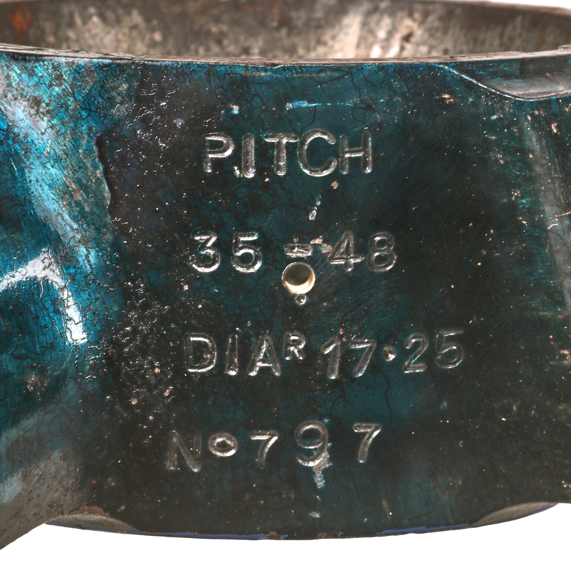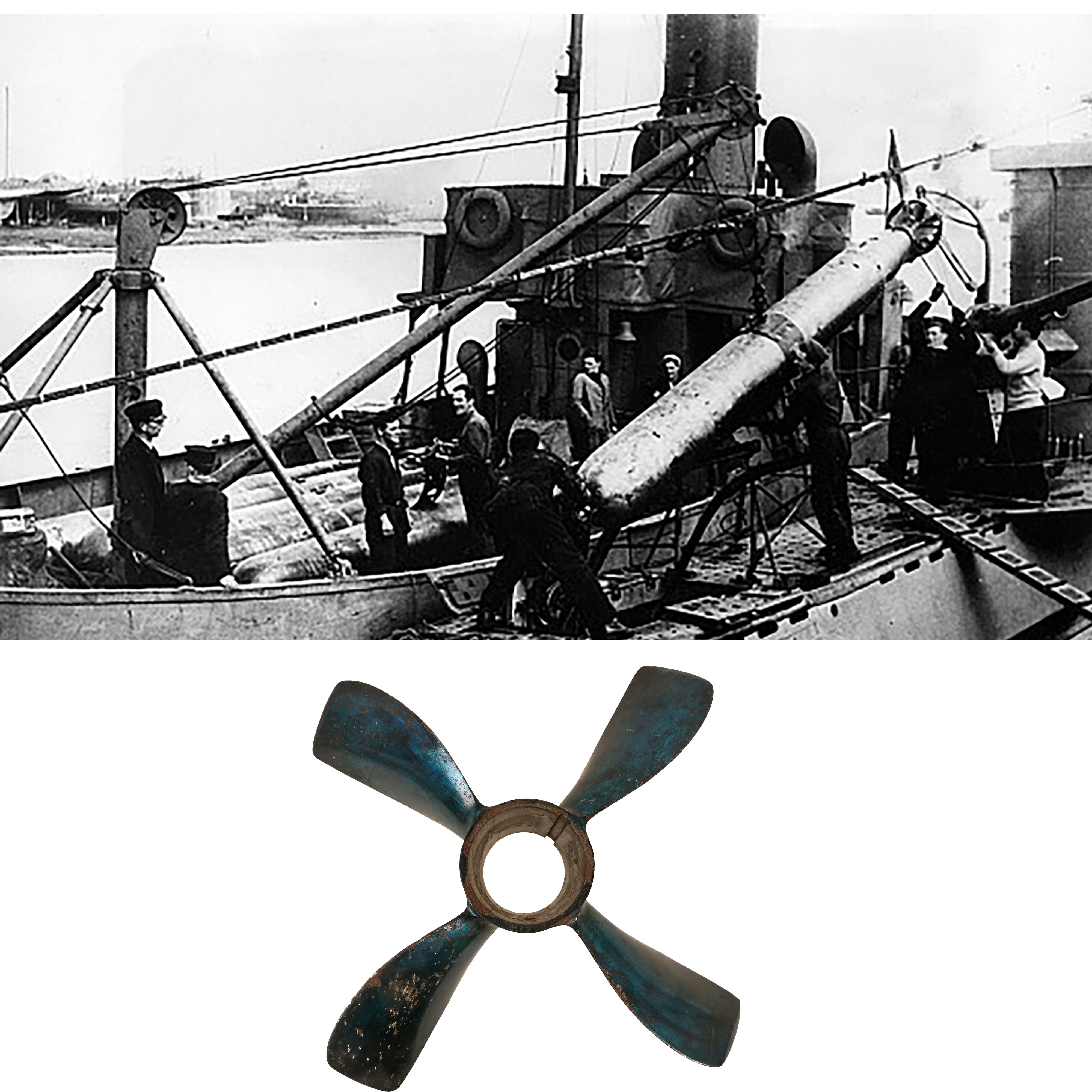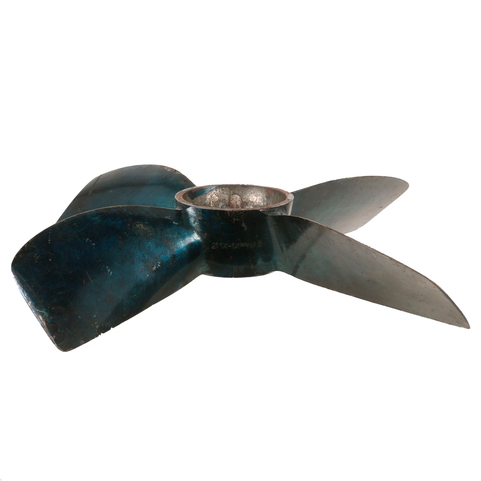 Original Item. Only One Available. The Mark VIII was designed circa 1925 and was the first British burner cycle design torpedo. It was used from 1927 on all submarines, beginning with the later versions of the L class and the Odin class, as well as motor torpedo boats. The principal World War II version was the improved Mark VIII**, used far more than any other torpedo in service, with 3,732 being expended by September 1944 (56.4% of the total number of torpedoes used by Britain during the war).This is a gorgeous example of a propeller off of a British Mark VIII torpedo. The propeller has a gorgeous bluish color and retains many of its markings:21” 1X-1X**NABAWRFNCSPITCH35-48DIAR 17-25NO. 797The propeller measures roughly 17¼ x 17¼ x 3¼”. Much of the blue finish has worn away but it still displays gorgeously. Comes ready for further research and display.In 1950-1951, the only system available for a Royal Navy submarine to attack another submerged target was the Mark VIII; active homing variants of the Mark VIII and Mark IX were being worked on in 1945, without success. Considerable self-noise and reverberation hampered the effort, and the project was halted with funding being cut off as the war ended. During trials, the Mark VIII achieved a test depth of 200 ft (61 m) without issue, but the production units were limited to a maximal depth of 44 ft (13 m) by their depth control mechanisms. At the beginning of the 1960s, the Mark VIII was the only feasible anti-surface ship weapon available to the Royal Navy submarine service. The Mark 20 Bidder, while capable of hitting surface targets, lacked the speed to chase down any warships. During the torpedo capability crisis, in 1969, Admiral Michael Pollock, Flag Officer Submarines, proposed multiple solutions. These included such as purchase of the American Mark 45 ASTOR, the Mark 40 Mod 1 nuclear-armed lightweight torpedo, or the UUM-44 SUBROC; among his proposals was also a modification of the Mark VIII to be fitted with a WE177A nuclear warhead, with a variable yield of 0.5-10 kilotons. The torpedo was still in service with the Royal Navy in a training role until recently, and was used by the Royal Norwegian Navy (Coastal Artillery: Kaholmen torpedo battery at Oscarsborg Fortress) until 1993.