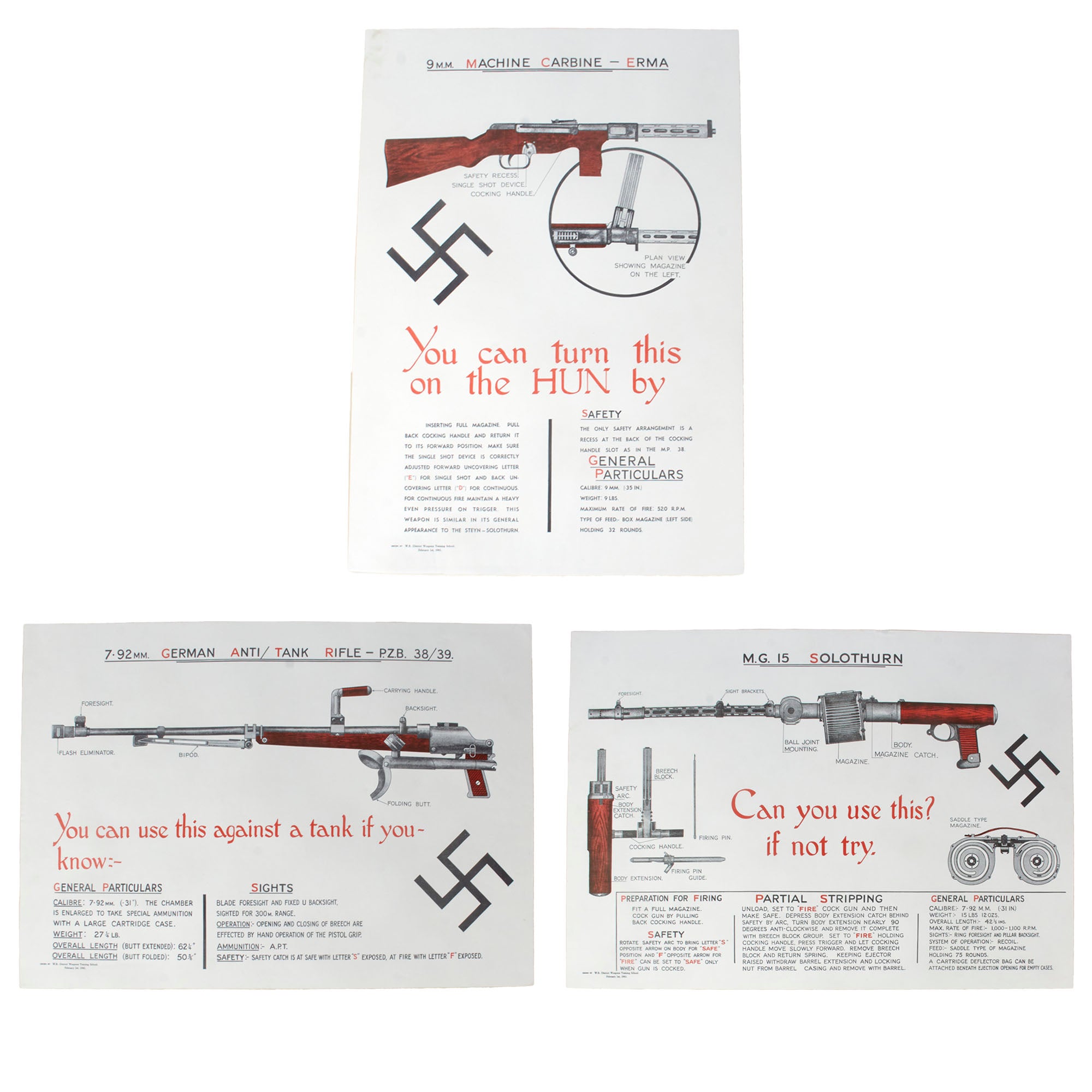 Original Items. Only One Lot Available. This is a fantastic lot of British Enemy weapon recognition training posters, depicting the use and inner workings of three famous weapons used by the Germans during World War II, in order to train soldiers in being able to turn these weapons against them.