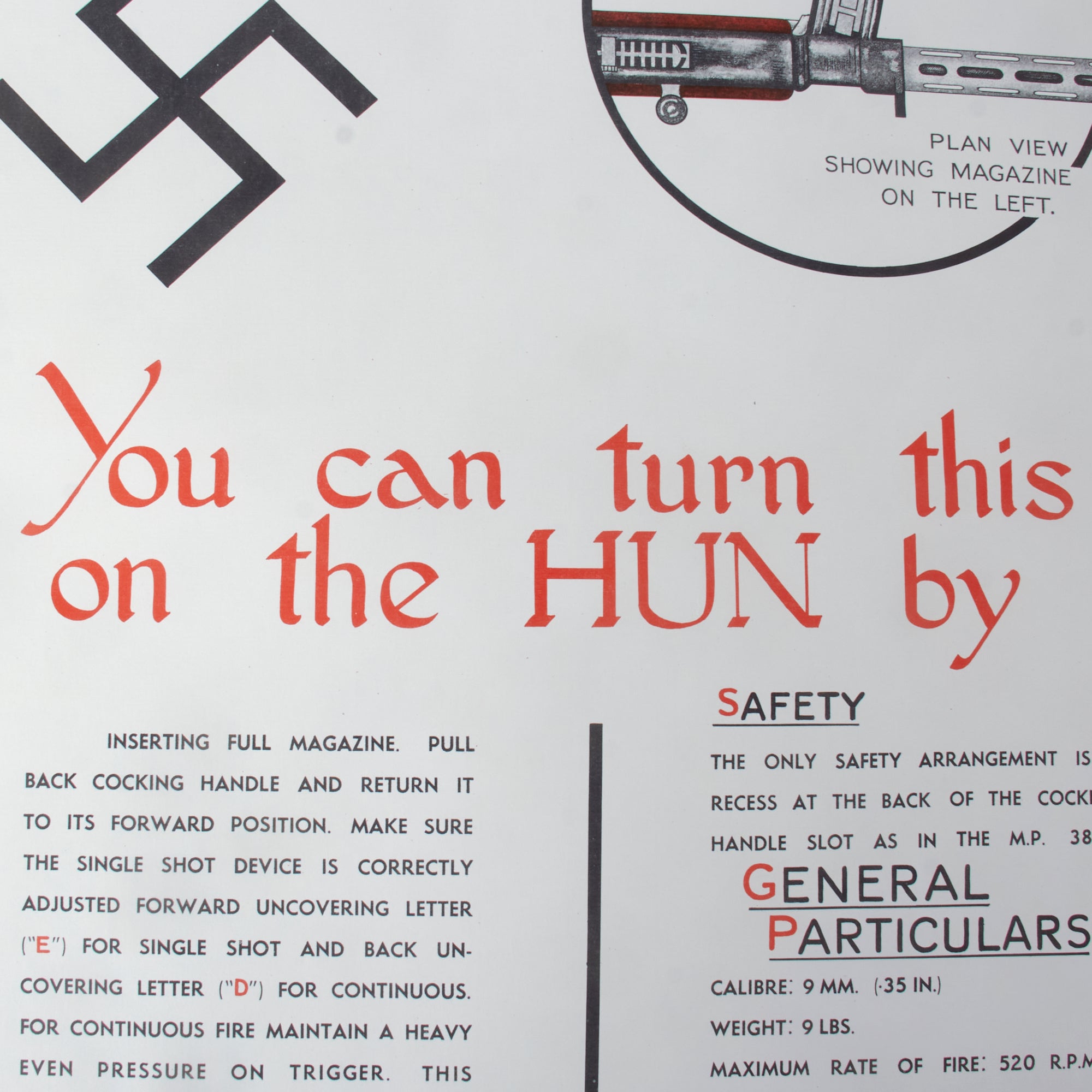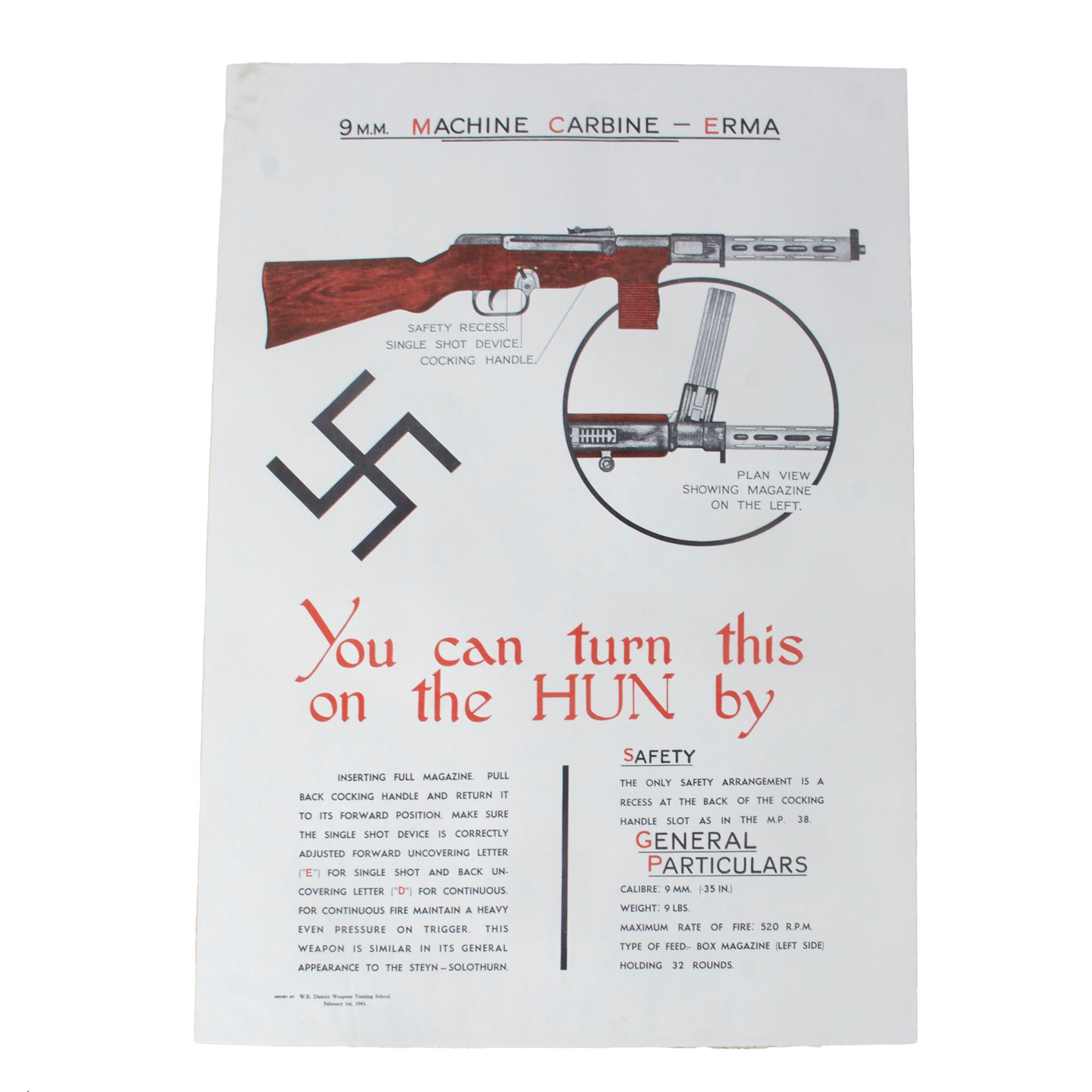 - Recognition poster for the 9MM. MACHINE CARBINE - ERMA with the caption You can turn this on the HUN by. Printed for the W.R. District Weapons Training School on February 1st, 1943. Measures 17 x 24”.