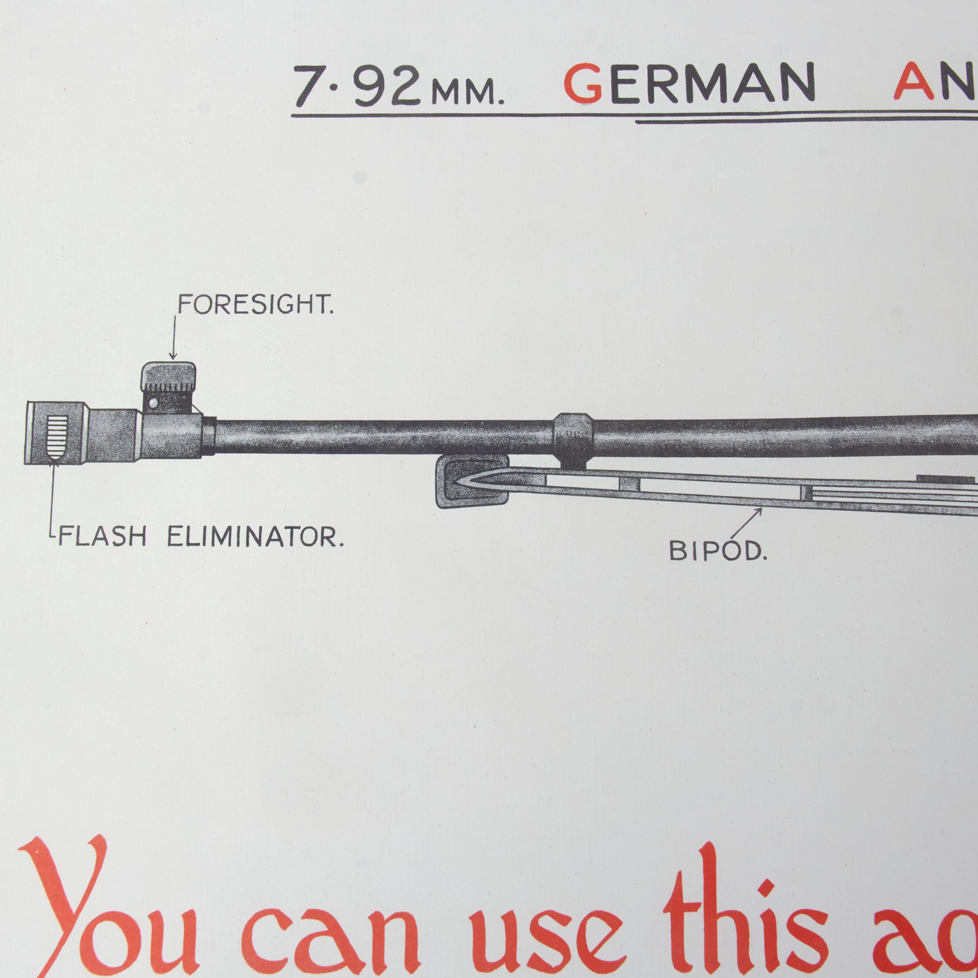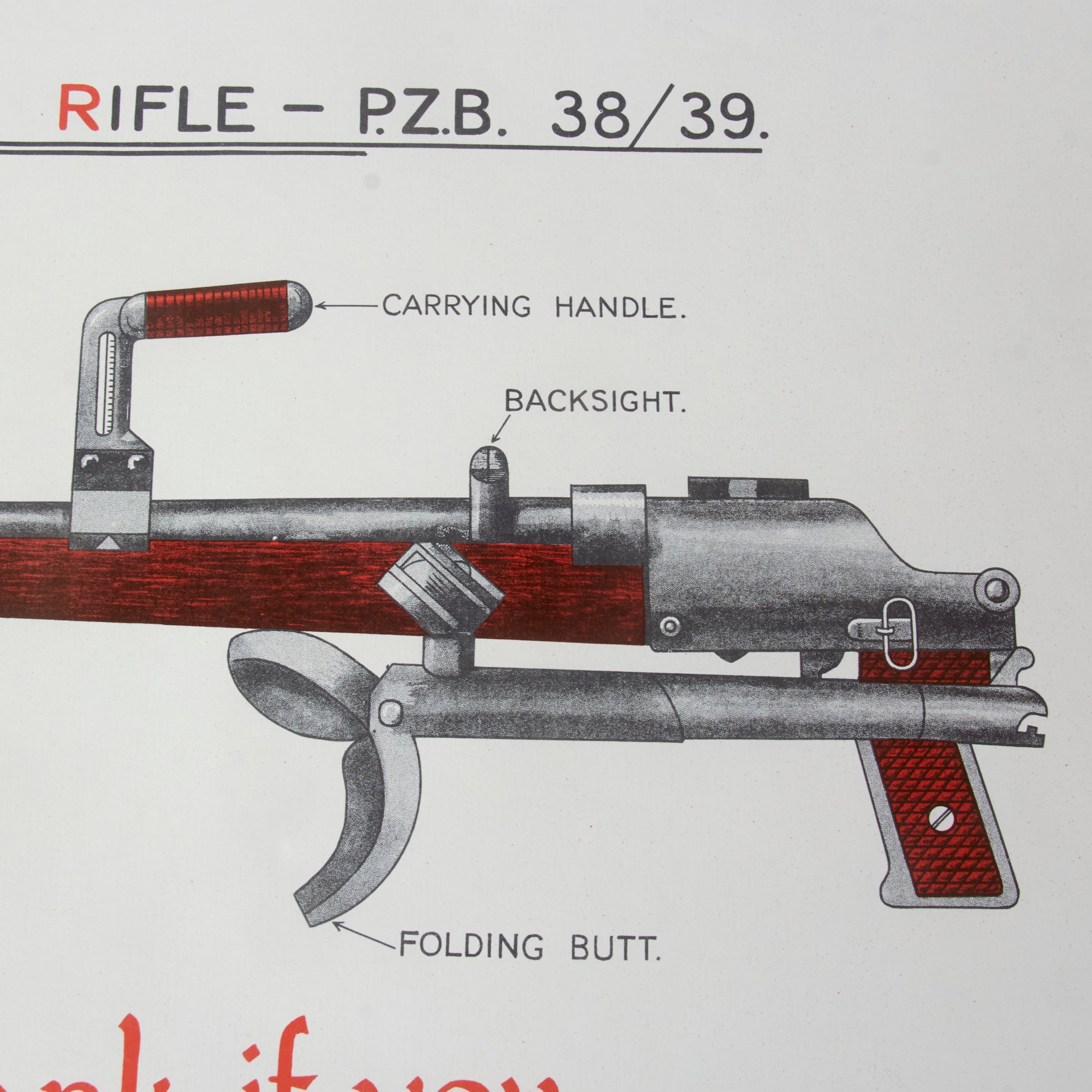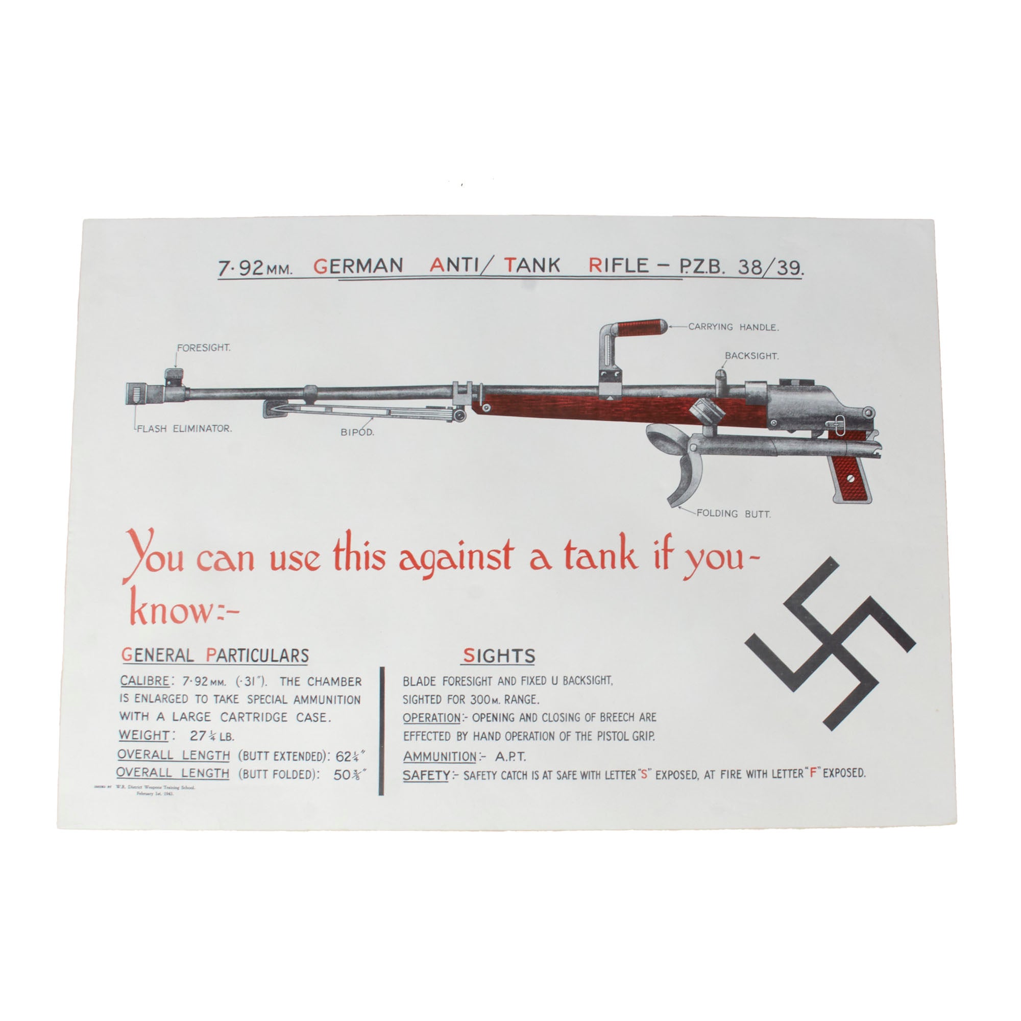 - Recognition poster for the 7.92MM. GERMAN ANTI/TANK RIFLE - PZB 38/39 with the caption You can use this against a tank if you know-. Printed for the W.R. District Weapons Training School on February 1st, 1943. Measures 17 x 24”.