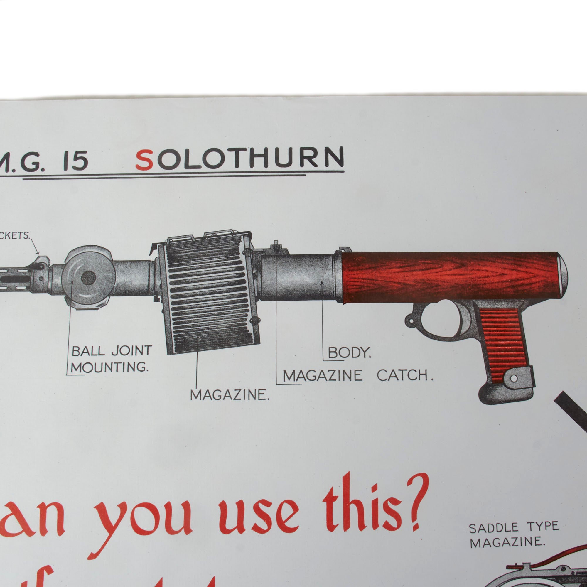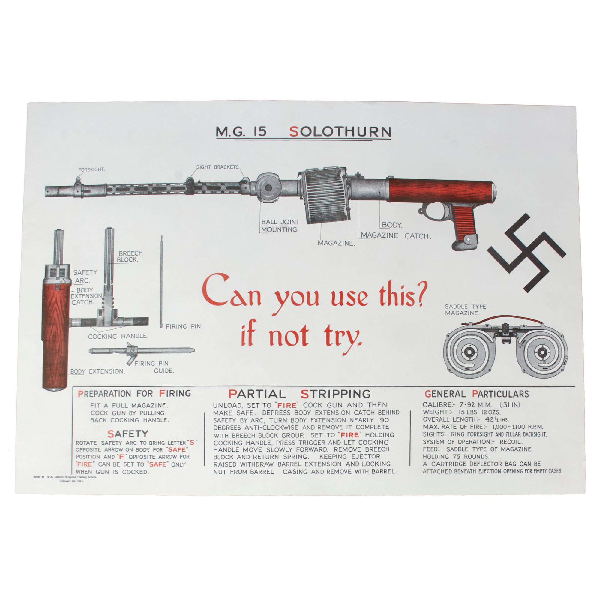 - Recognition poster for the M.G. 15 SOLOTHURN, with the caption Can you use this? If not try. Printed for the W.R. District Weapons Training School on February 1st, 1943. Measures 17 x 24”.