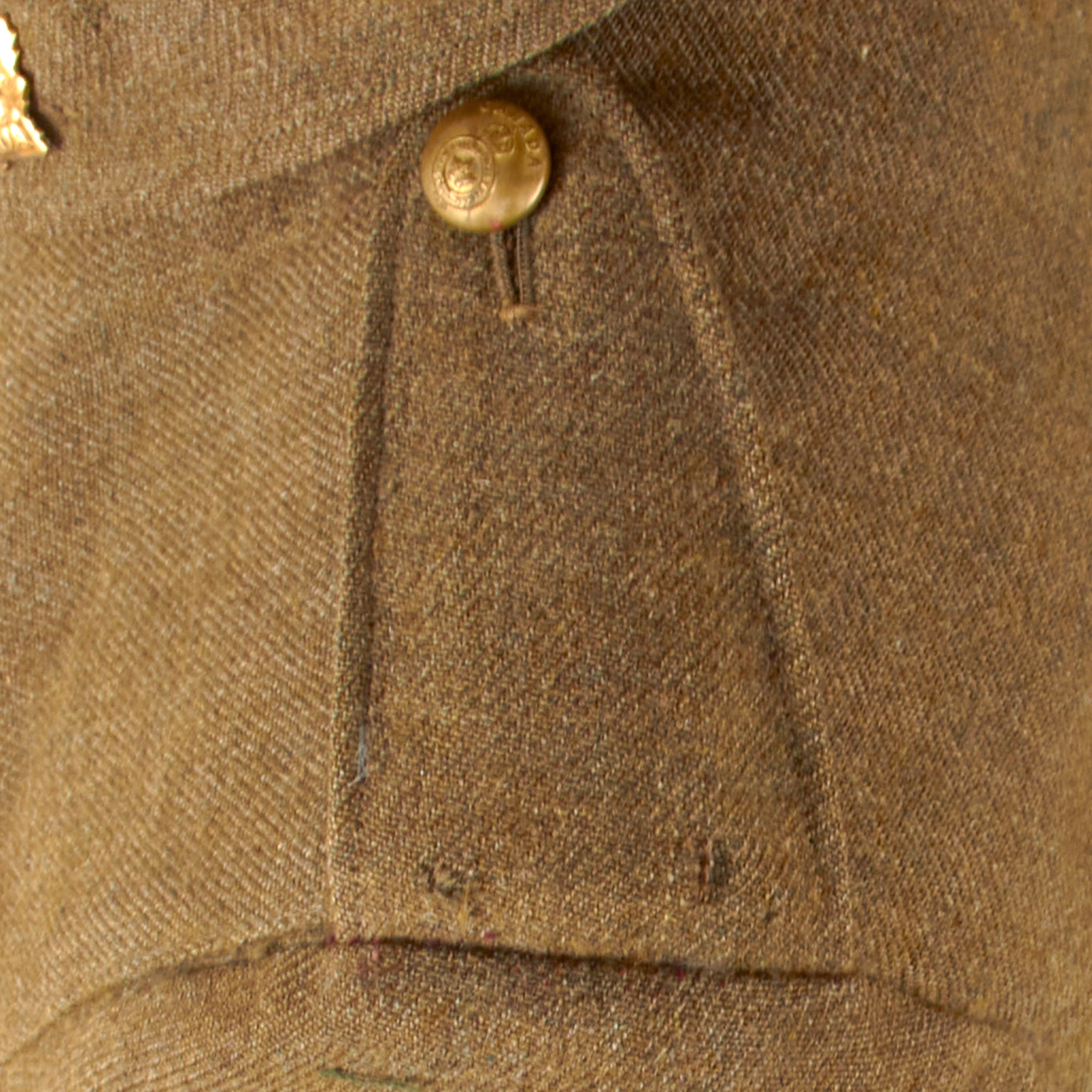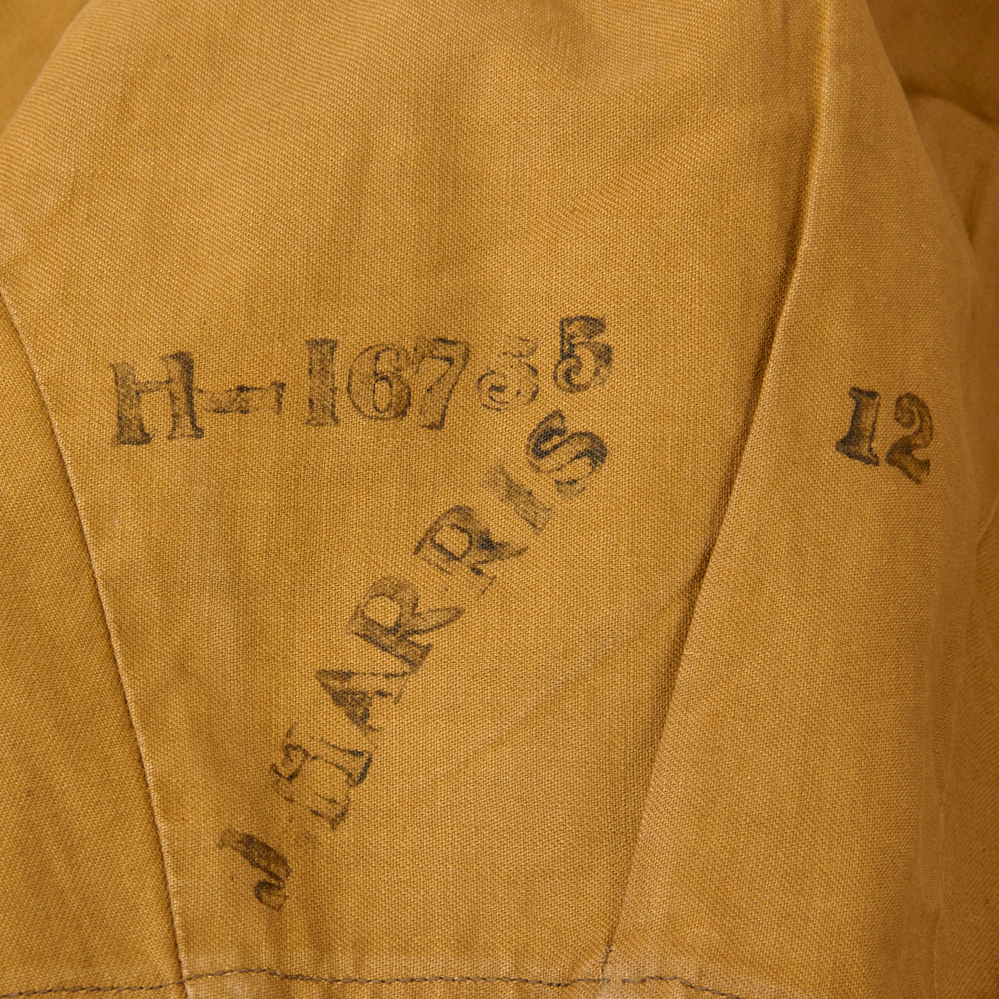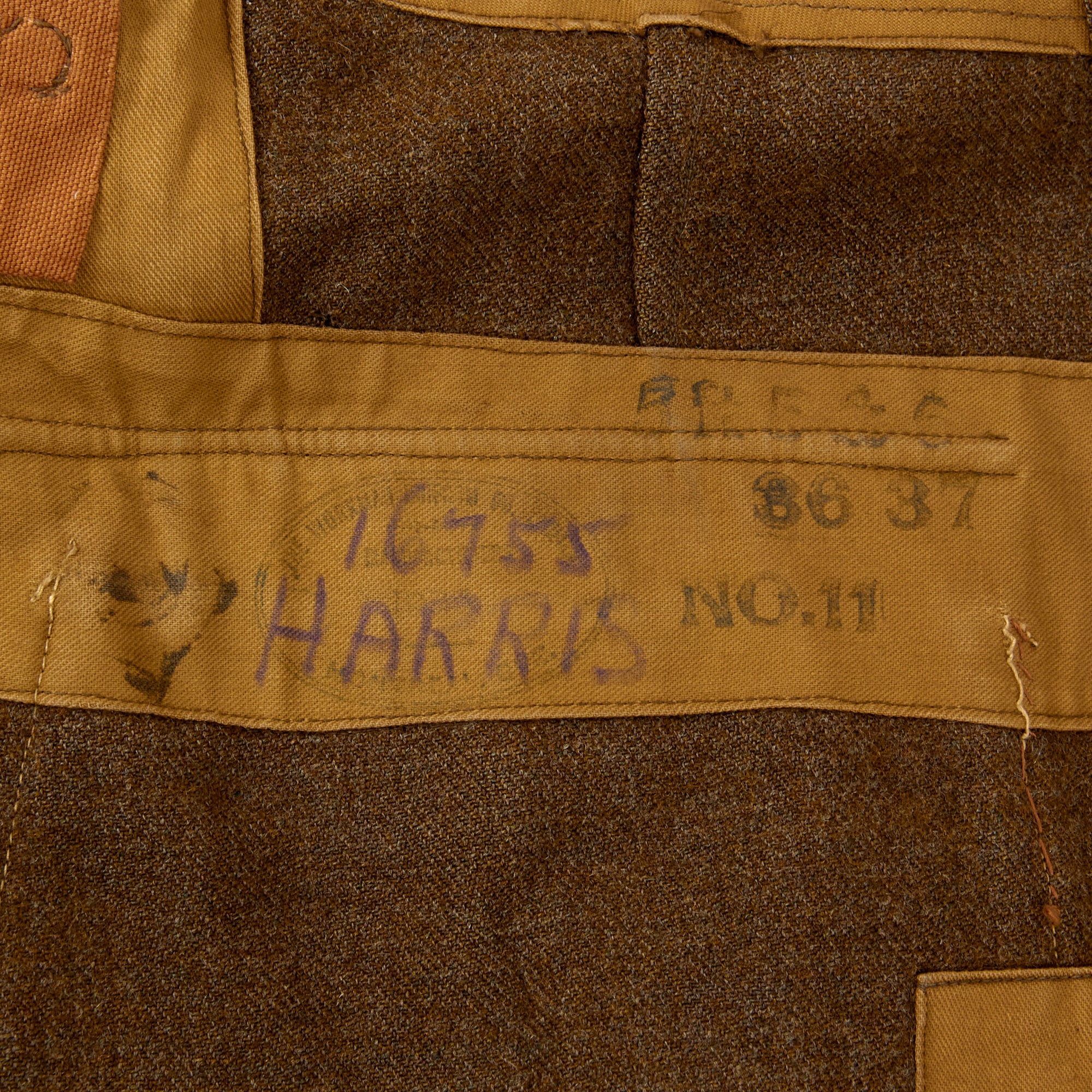 The interior of the uniform bears several stamps including the written name HARRIS over number 16755. Then the name J HARRIS is stamped next to the same number, 16755. This is supposedly the regimental number and name of the soldier, but we were not able to identify the soldier based off of this information. A possible research project for someone.