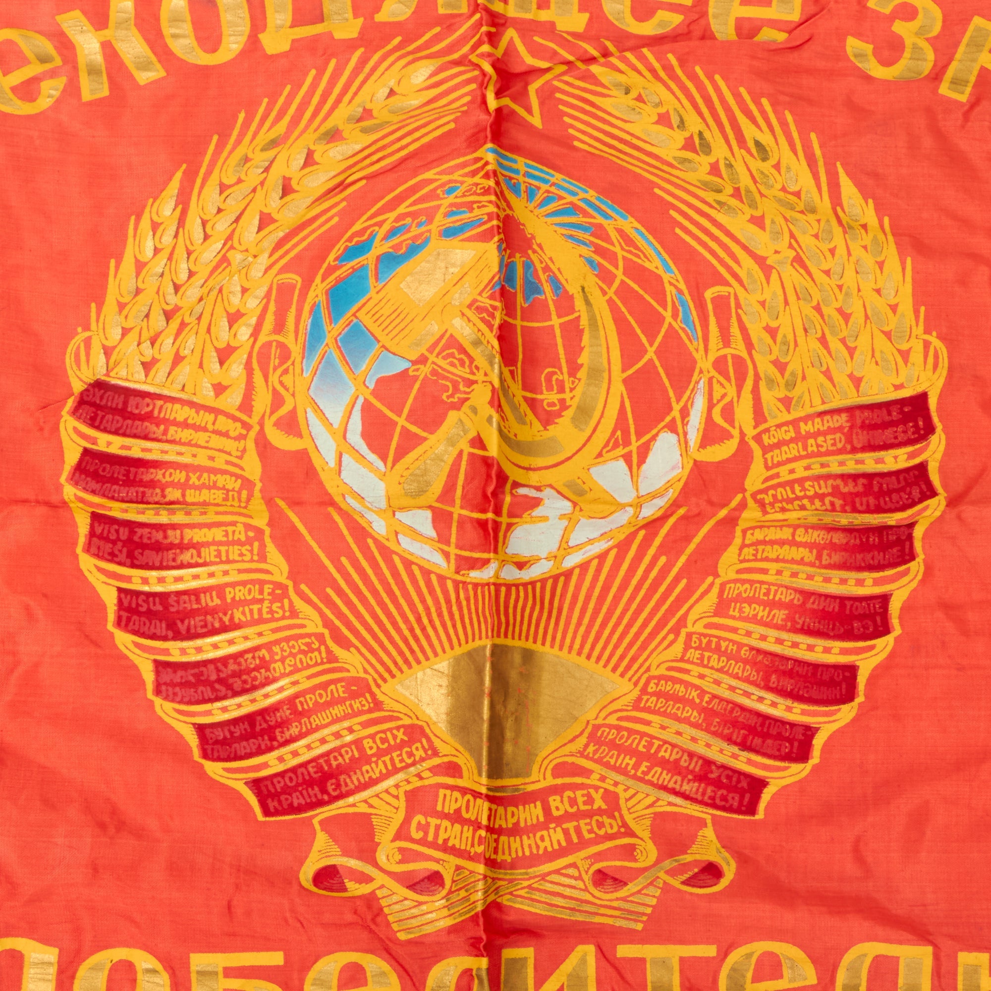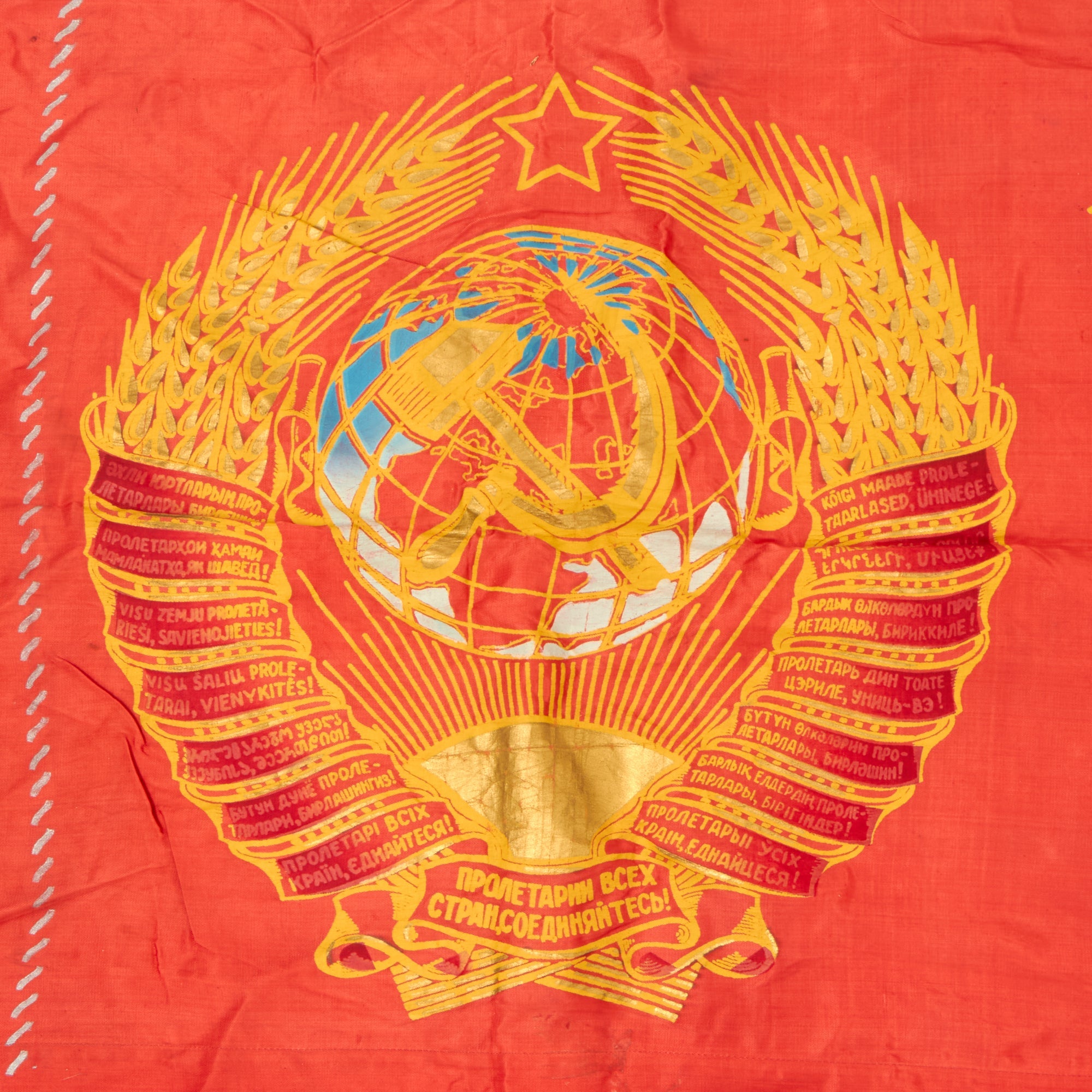 Original Item. Only One Available. Soviet Competition banners were awards given to individuals or teams for excelling in various fields, particularly in the Soviet Union's planned economy and industrial production. This is one such flag, with both sides bearing the Hammer & Sickle over the Earth with the bottom scroll reading PROLETARIANS OF ALL COUNTRIES, UNITE! With the same phrase in fourteen different languages or dialects on scrolls to the left and right.
