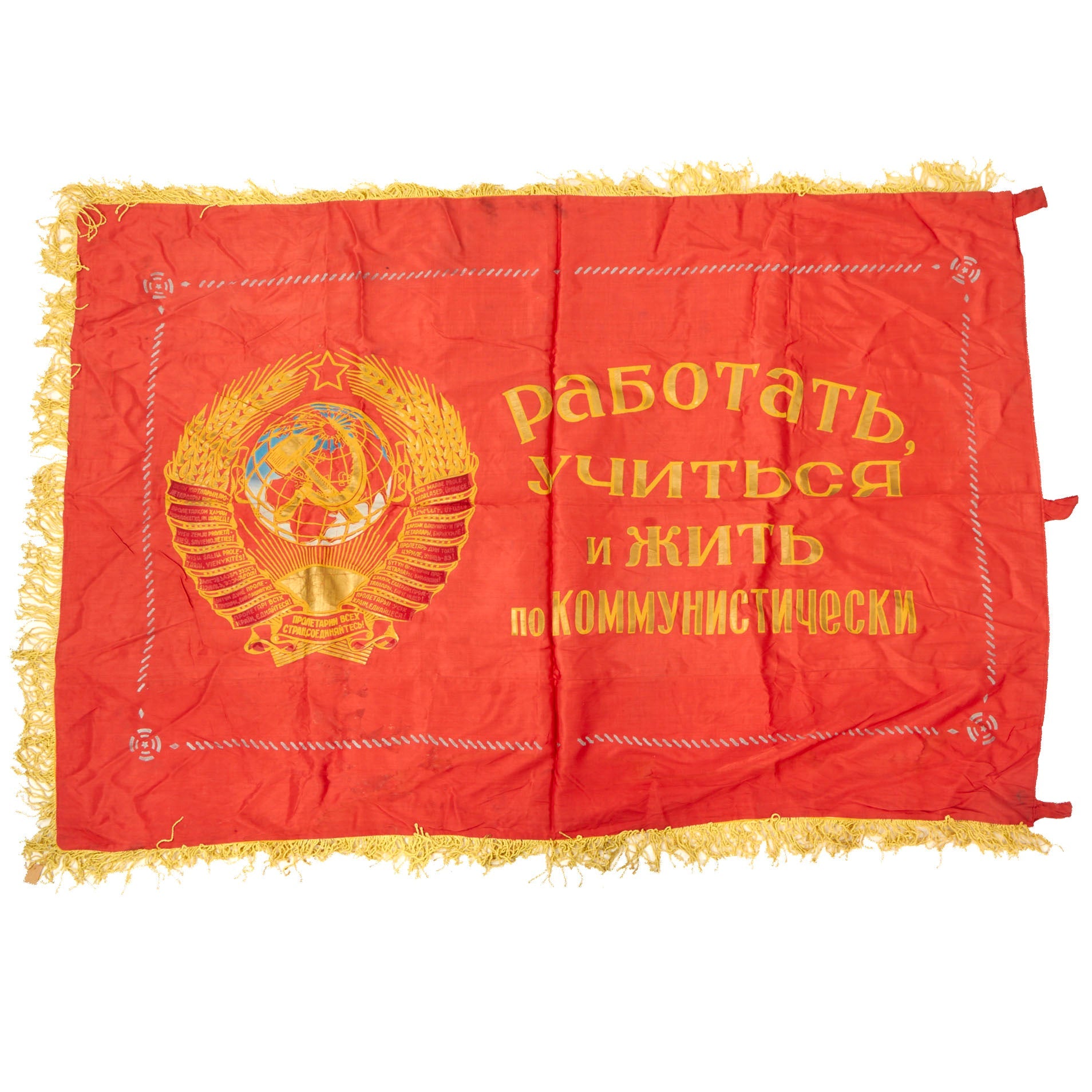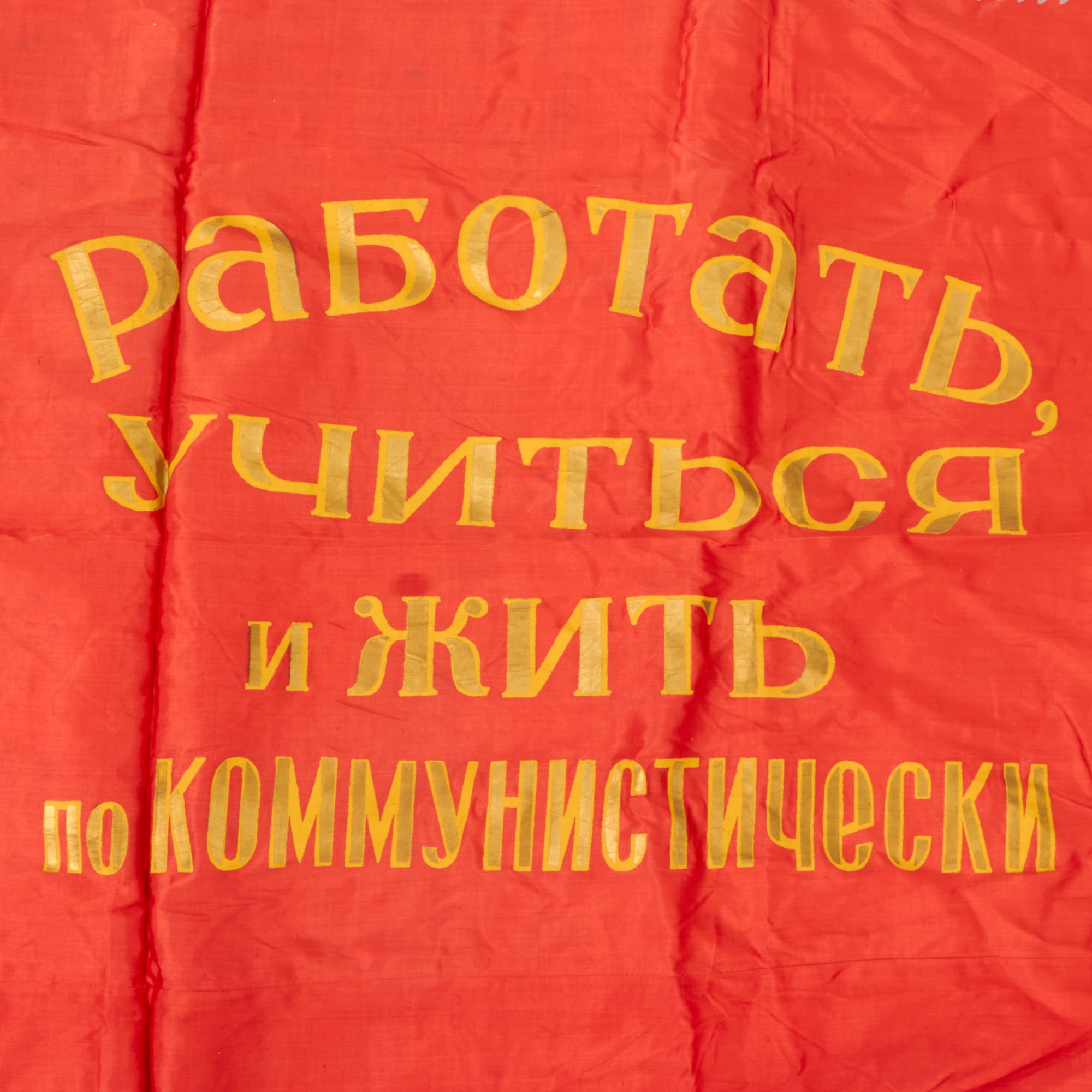 One side of the banner has text over the emblem reading COMPETITION BANNER with the text below reading THE WINNER OF THE SOCIALIST COMPETITION. The other side of the banner has text roughly translating to WORK, LIVE, STUDY COMMUNISTICALLY, words to live by if you live in a Communist country!
