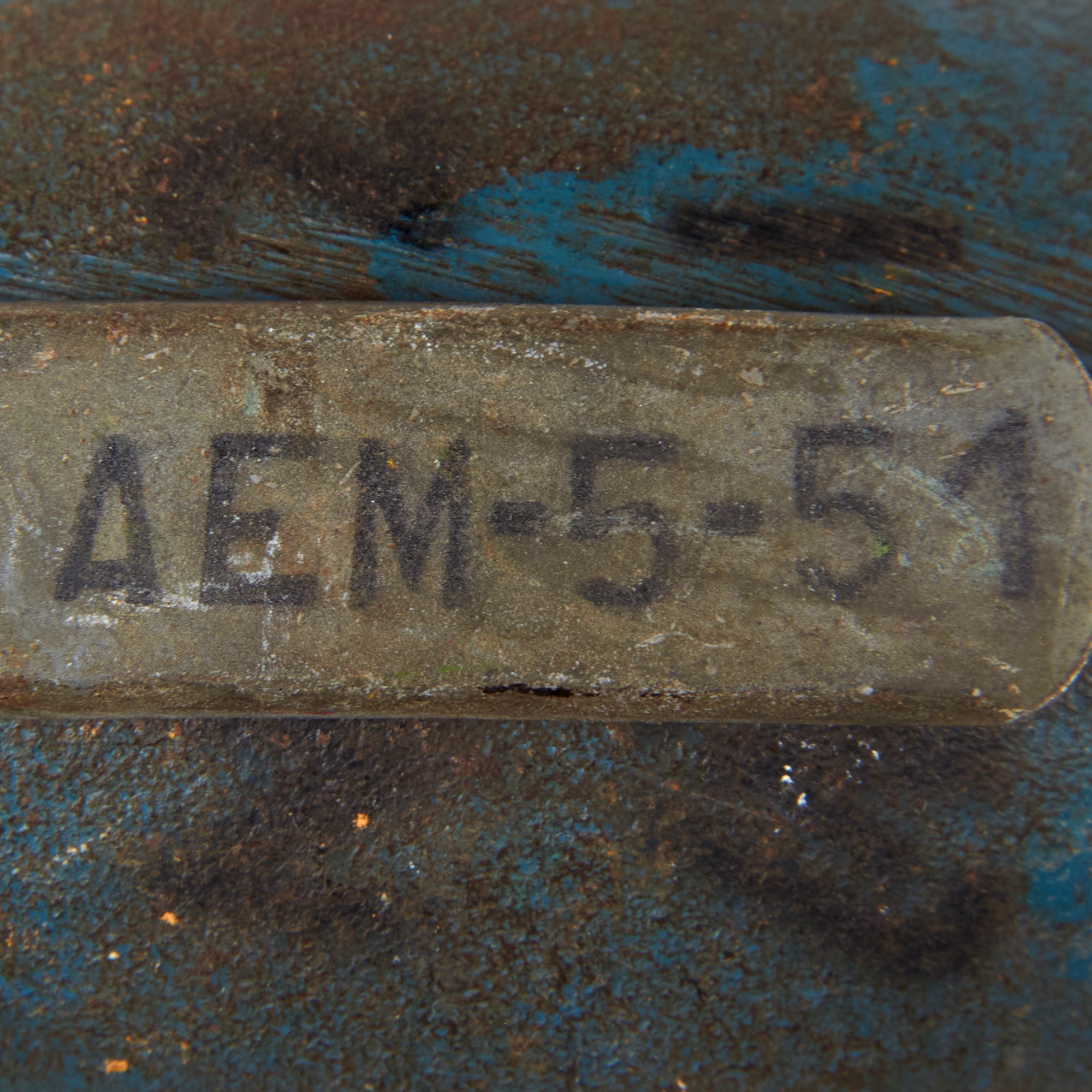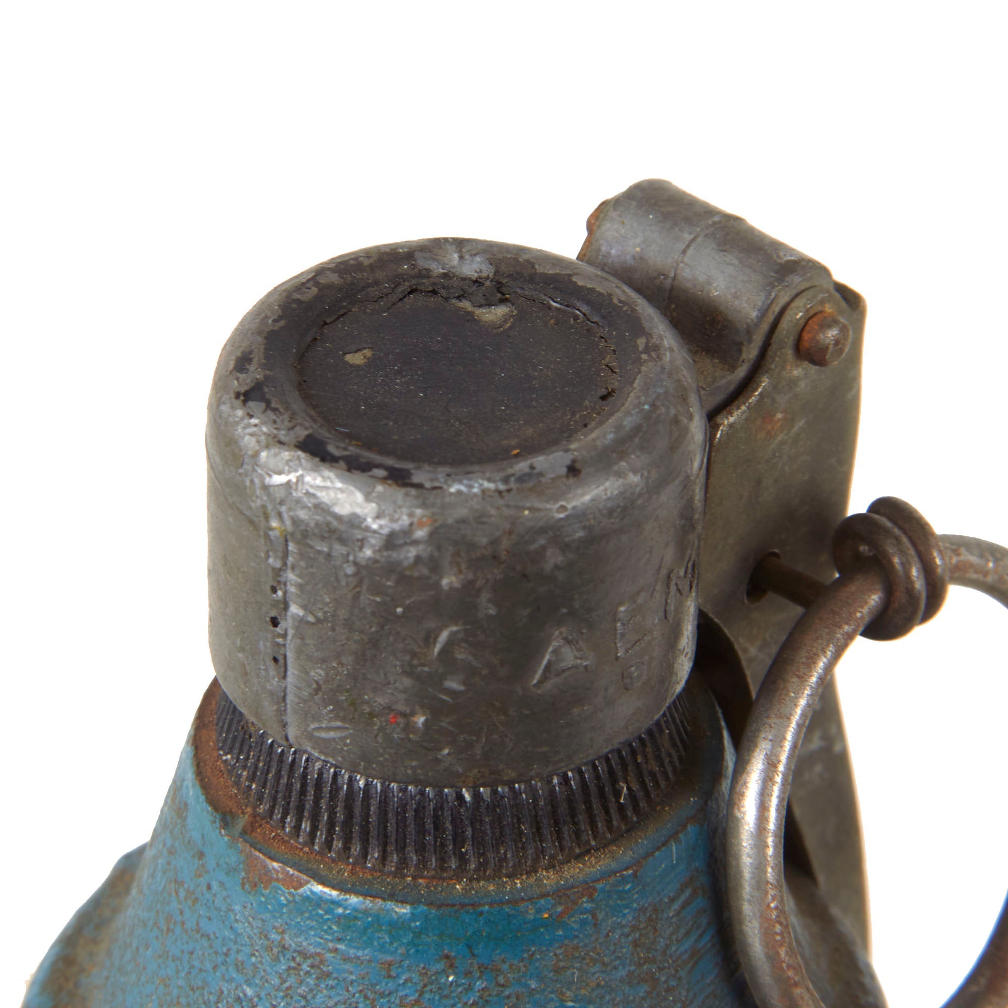 This is a scarce Post-WWII Dutch No. 2 practice grenade in good shape with a French Mle 1935 Fuze. It’s painted blue with A51 stamped on the side. The spoon of the fuze is stamped AEM-5-51.