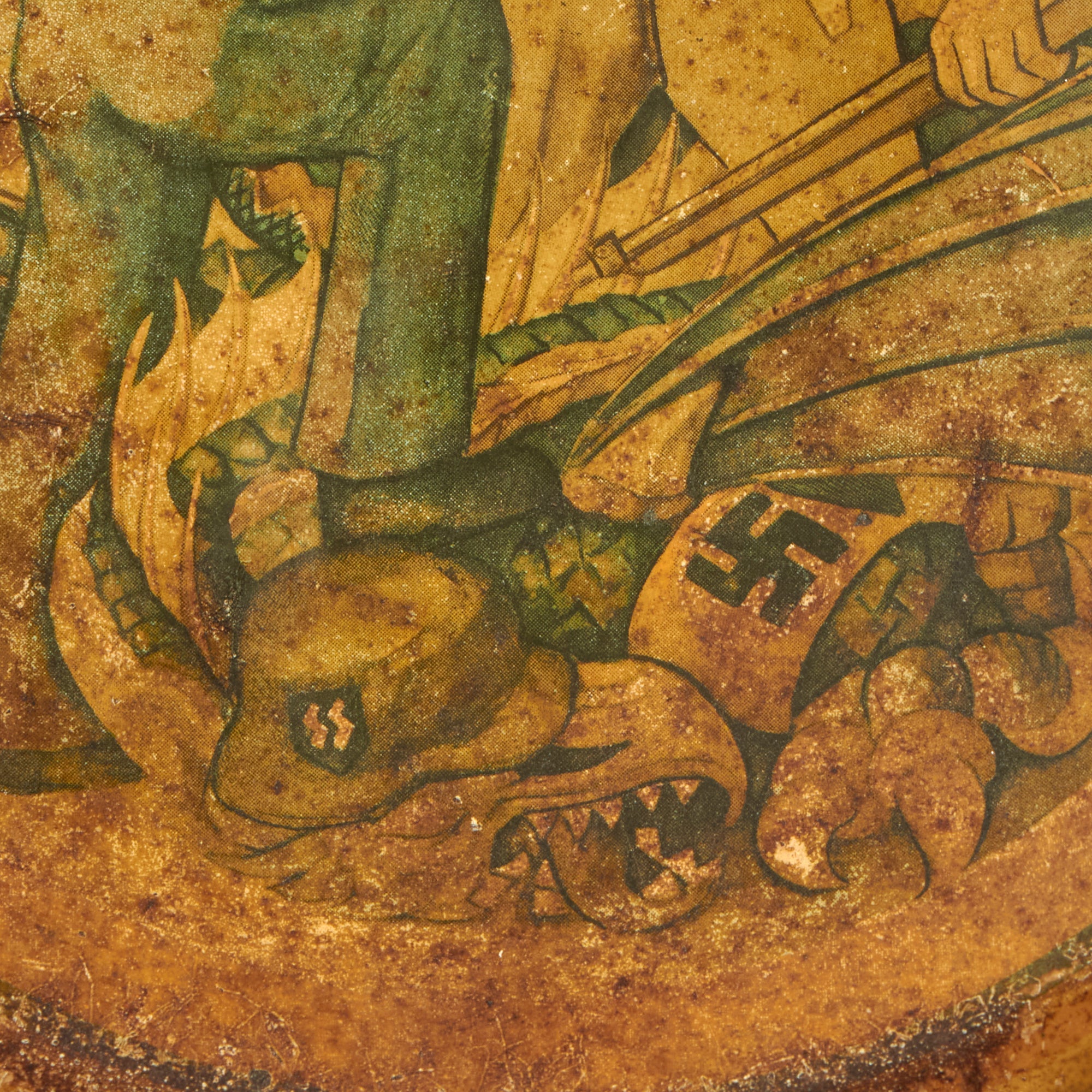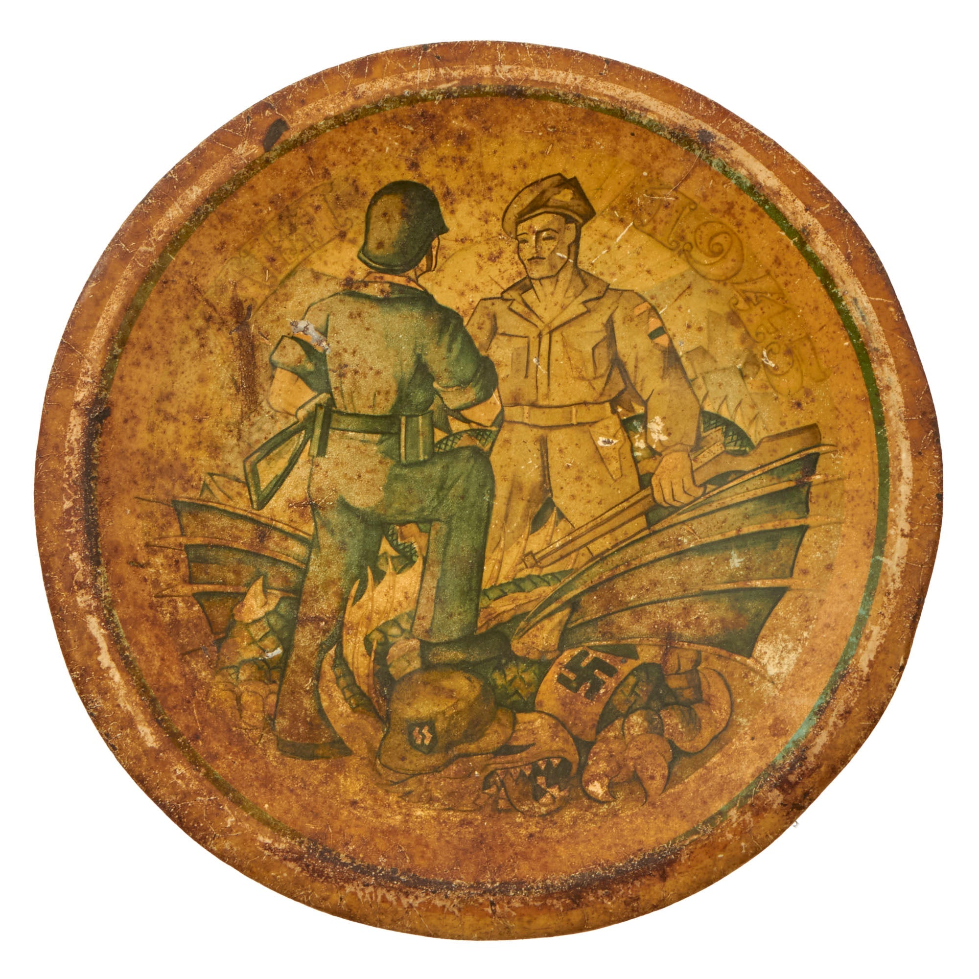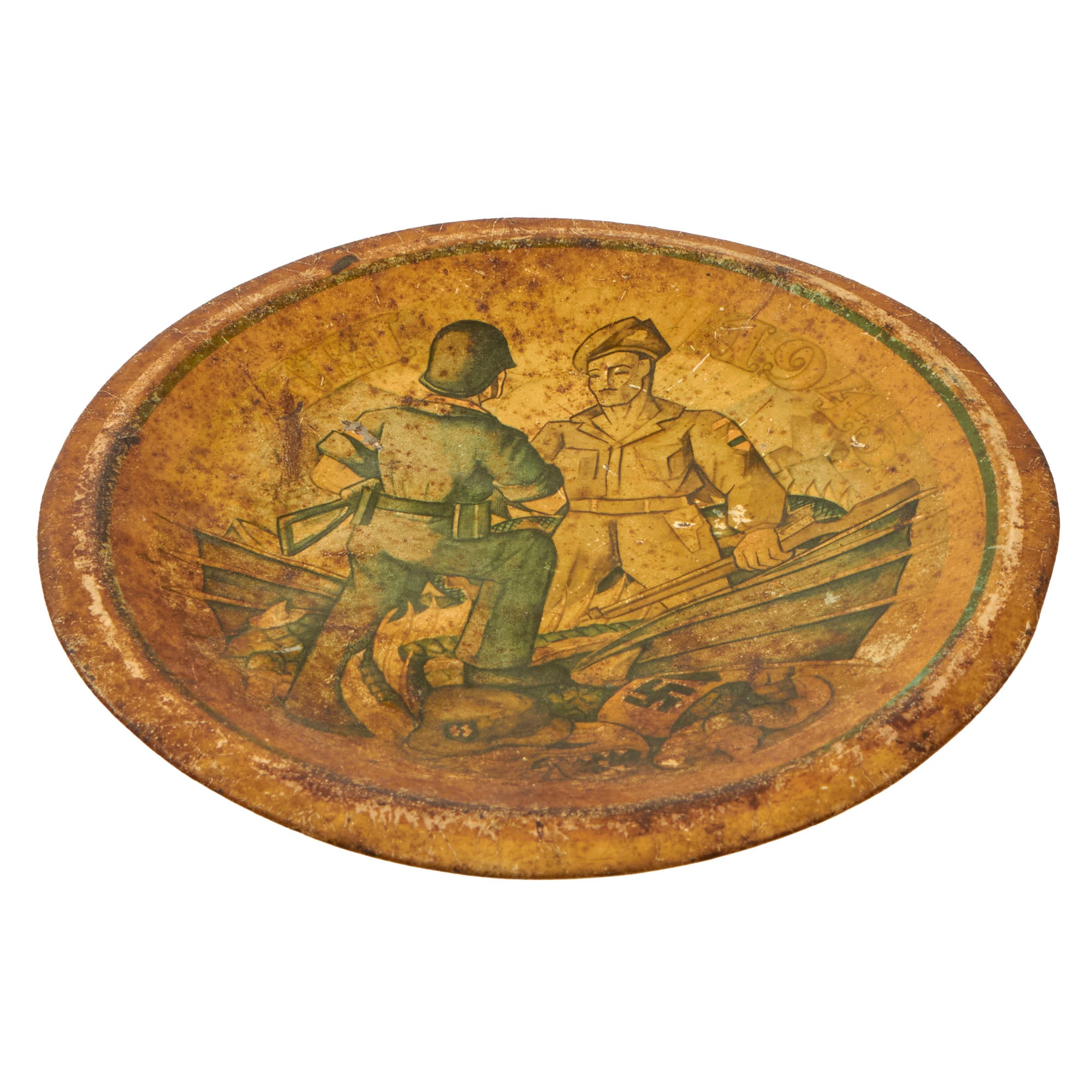 Original Item. Only One Available. This is a lovely plate produced by the Netherlands at the end of World War II, depicting Dutch soldiers commemorating the defeat of the German dragon, who sits dead at their feet.