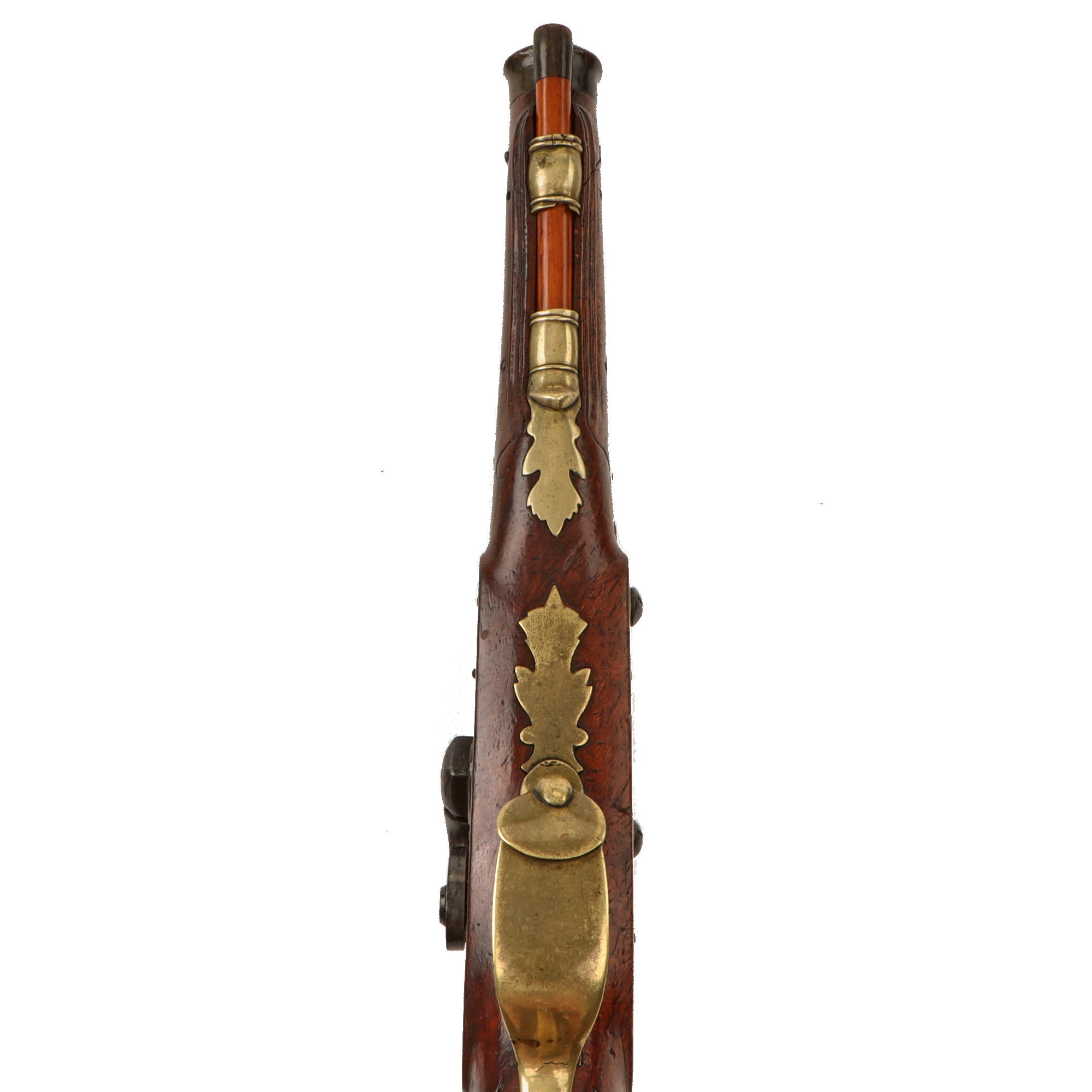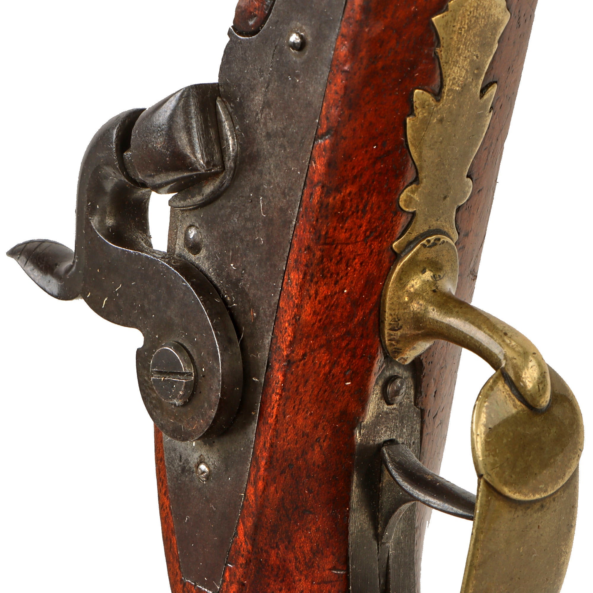 Original Item. Only One Available. This is a lovely European Officer's Pistol, made very much in the high end French style of the day, known as the "Versailles" style. Designed by famed gunsmith Nicolas-Noël Boutet, this pattern pistols were very popular and extensively made for French Officers. This example was almost certainly made in Liège, Belgium, a gunmaking center even today, which had been under French and then Dutch control until the early 1830s. It has a 7 inch barrel which is partly angular near the breech end, and also features a lovely embossed decorative plate on top of the barrel that is continuous with the front sight. There is another brass fitting at the rear that also comprises the rear sight.