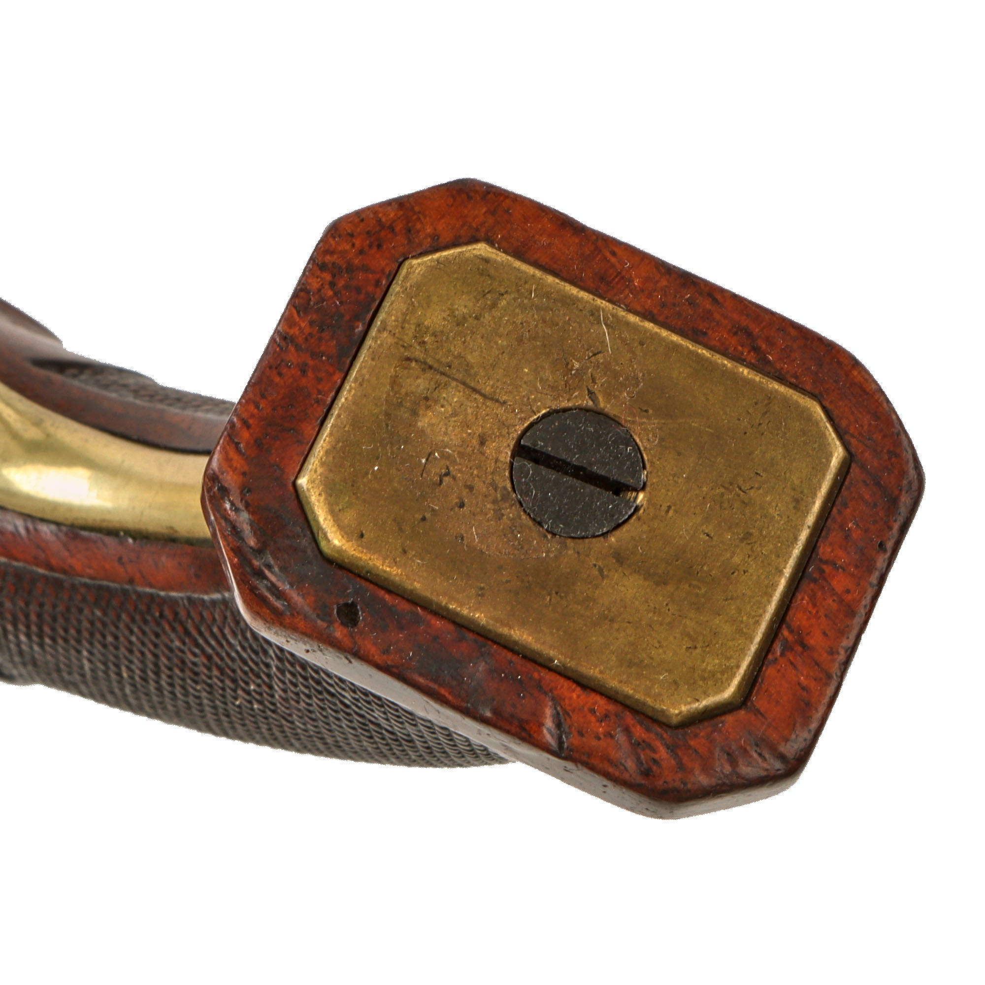 The walnut stock is checkered around the wrist and terminates in a lovely wide ring of the Versailles style, which in this case is octagonal, with the "corner" sides quite short, just as on the butt plate. We can also see some lovely figuring to the wood, which shows some lovely chatoyancy in the light. We did not notice any structural damage or major repairs to the pistol, though there is a crack on the left side near the muzzle running through one of the barrel securing pin locations.