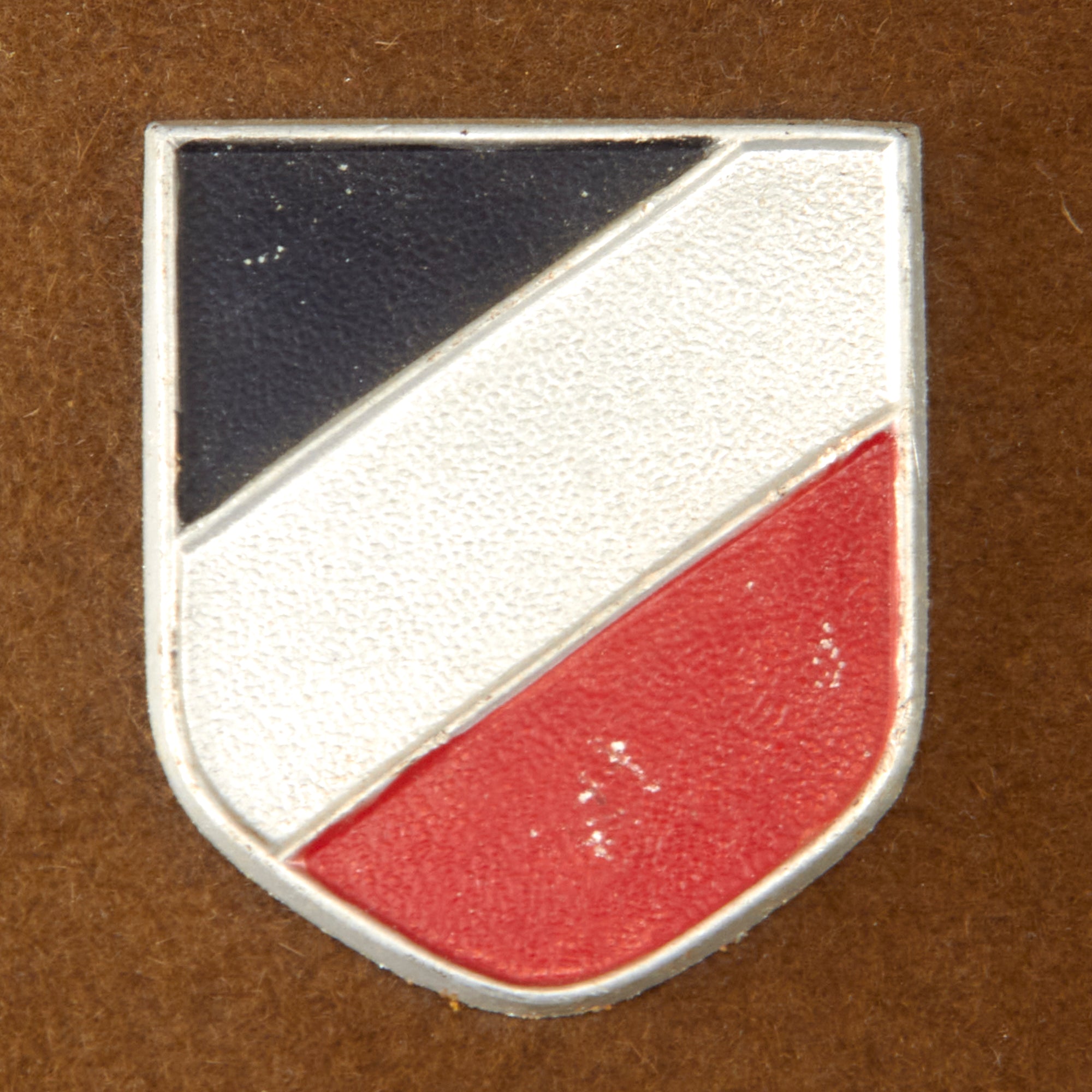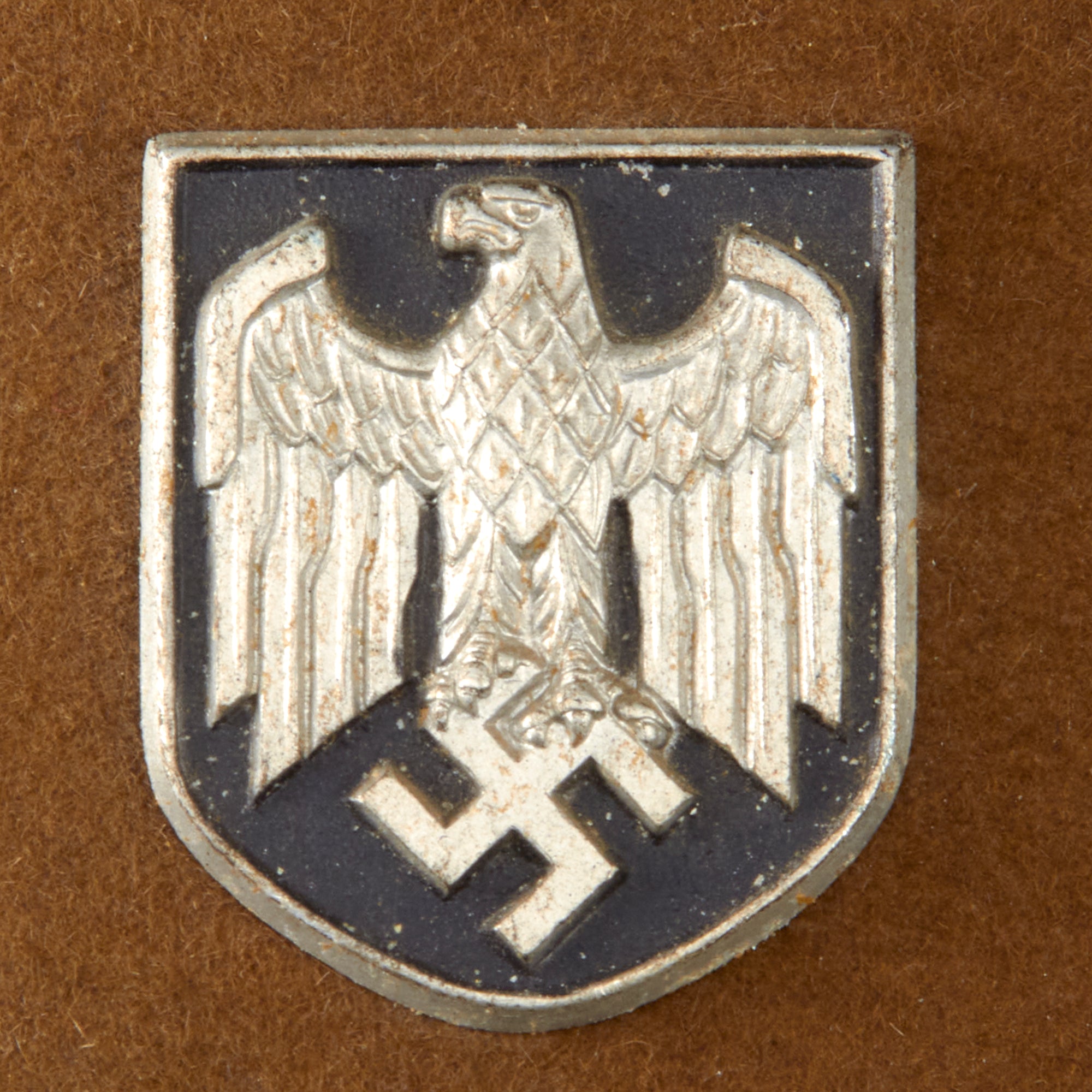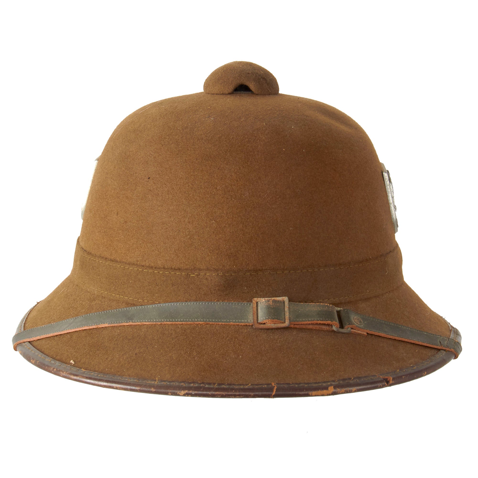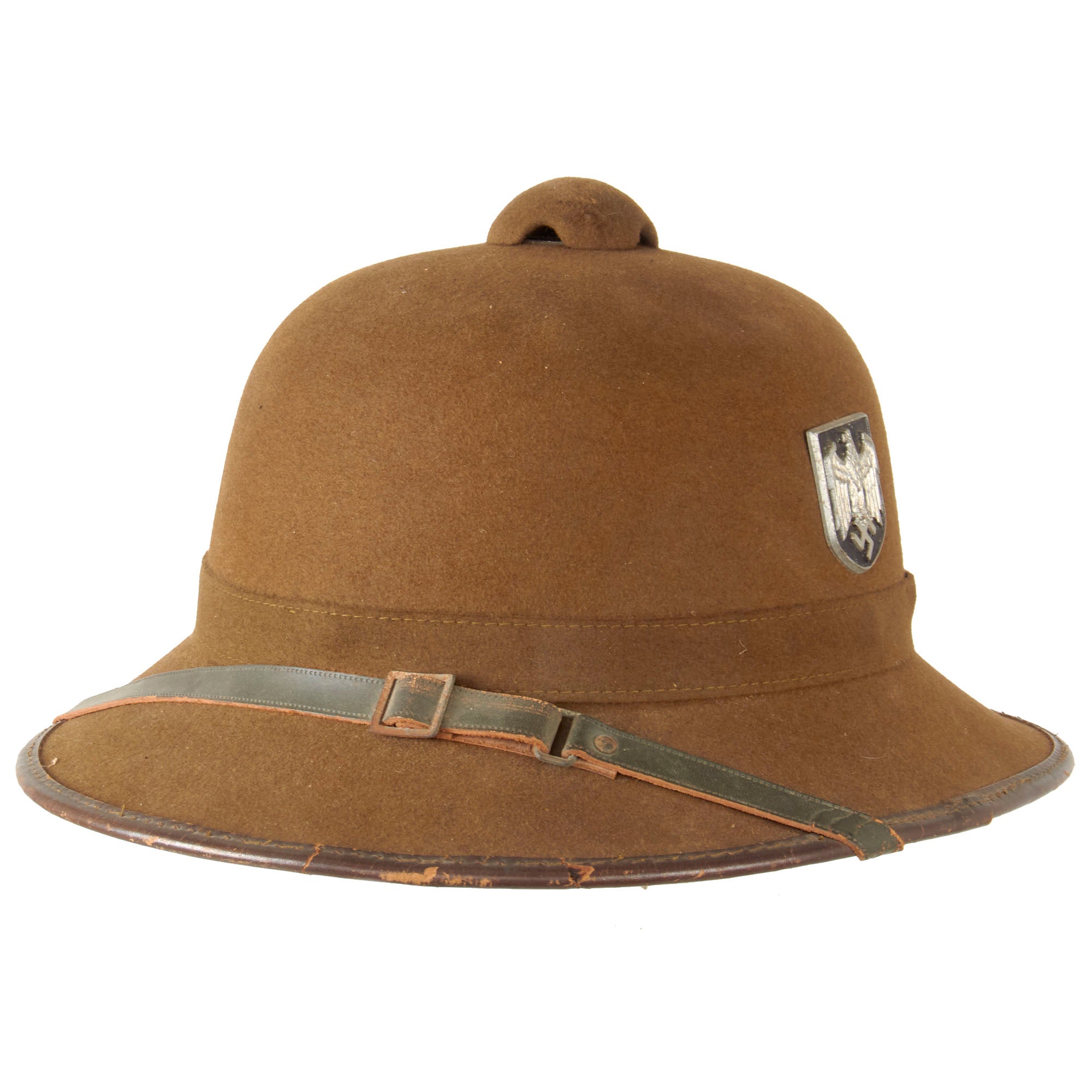 Original Item: On first deployment to North Africa in 1941, Afrikakorps infantry were issued with the traditional European sun helmet known as Tropische Kopfbedeckung (Tropical headgear), of the type known to the British forces as the solar topi (or topee). In the German case, these were made of pith, had prominent ventilation holes in the crown, were khaki in color and bore two metal shields; on the right the national colors and on the left the German eagle. There were several models made, with the first having cotton outer covering made of fabric sewn together. This is the second model, with a felt covering.