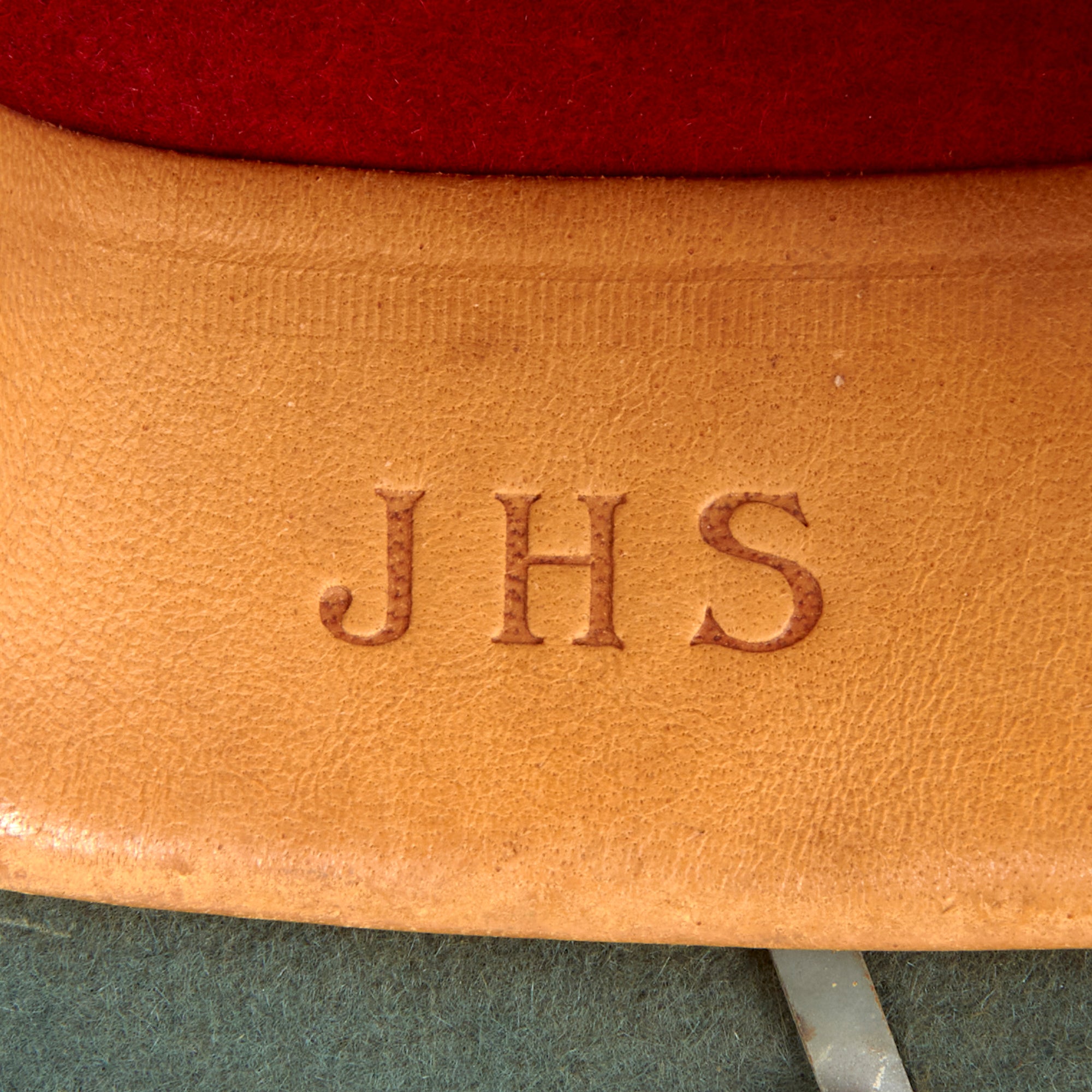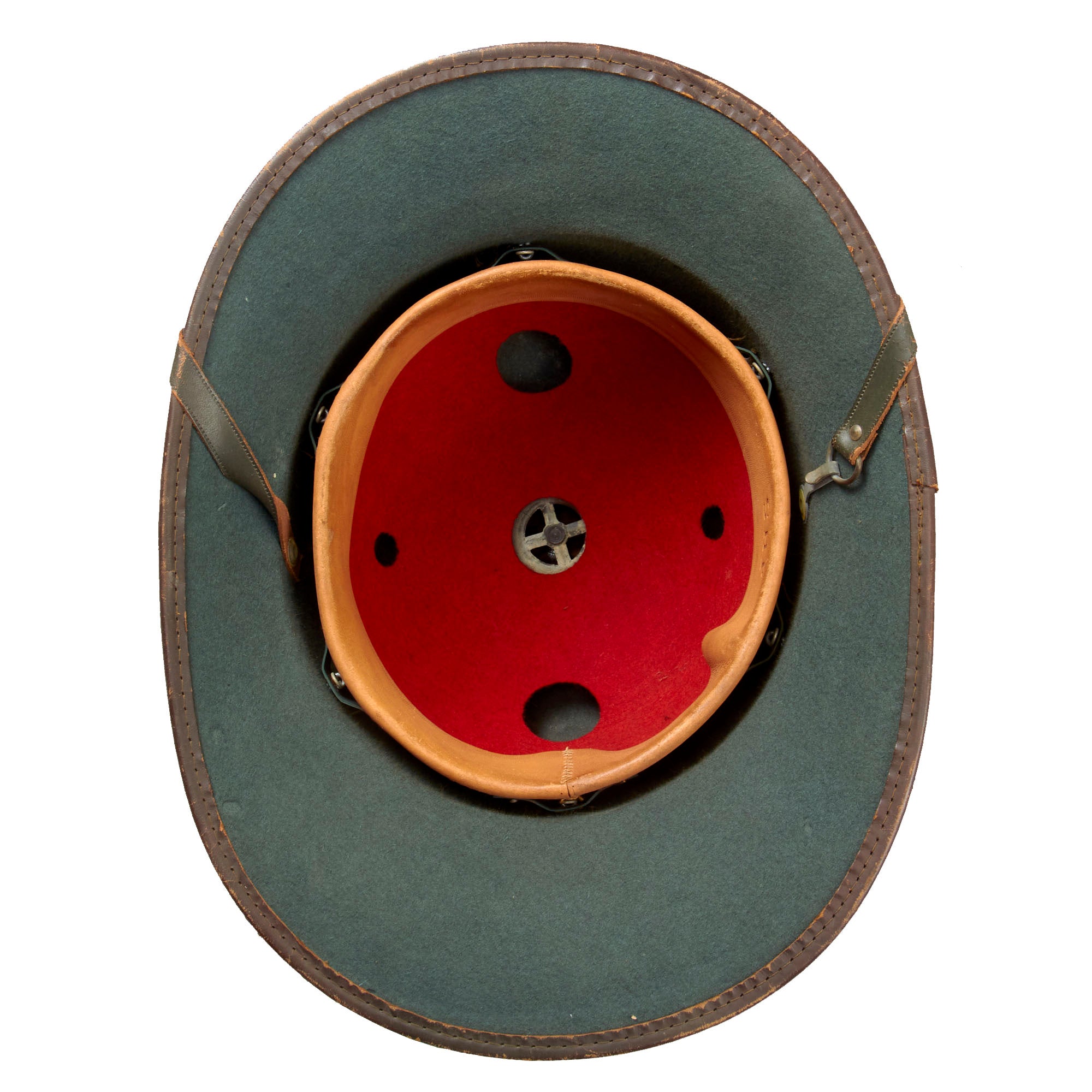 The interior of the helmet still has the original green felt covering intact, with a few spots of light mothing. The leather liner itself is in very good condition and supple, showing a lovely light chestnut brown color. It is embossed with JHS on the left side, and the underside of the sweatband is marked with size 57 and a 1942 date. "JHS" indicates manufacture by the maker J.H. Soffel. There are no post war export stamps that we can see. The rigid red felt inner lining is fully intact, and the fitting for the top vent looks great.
