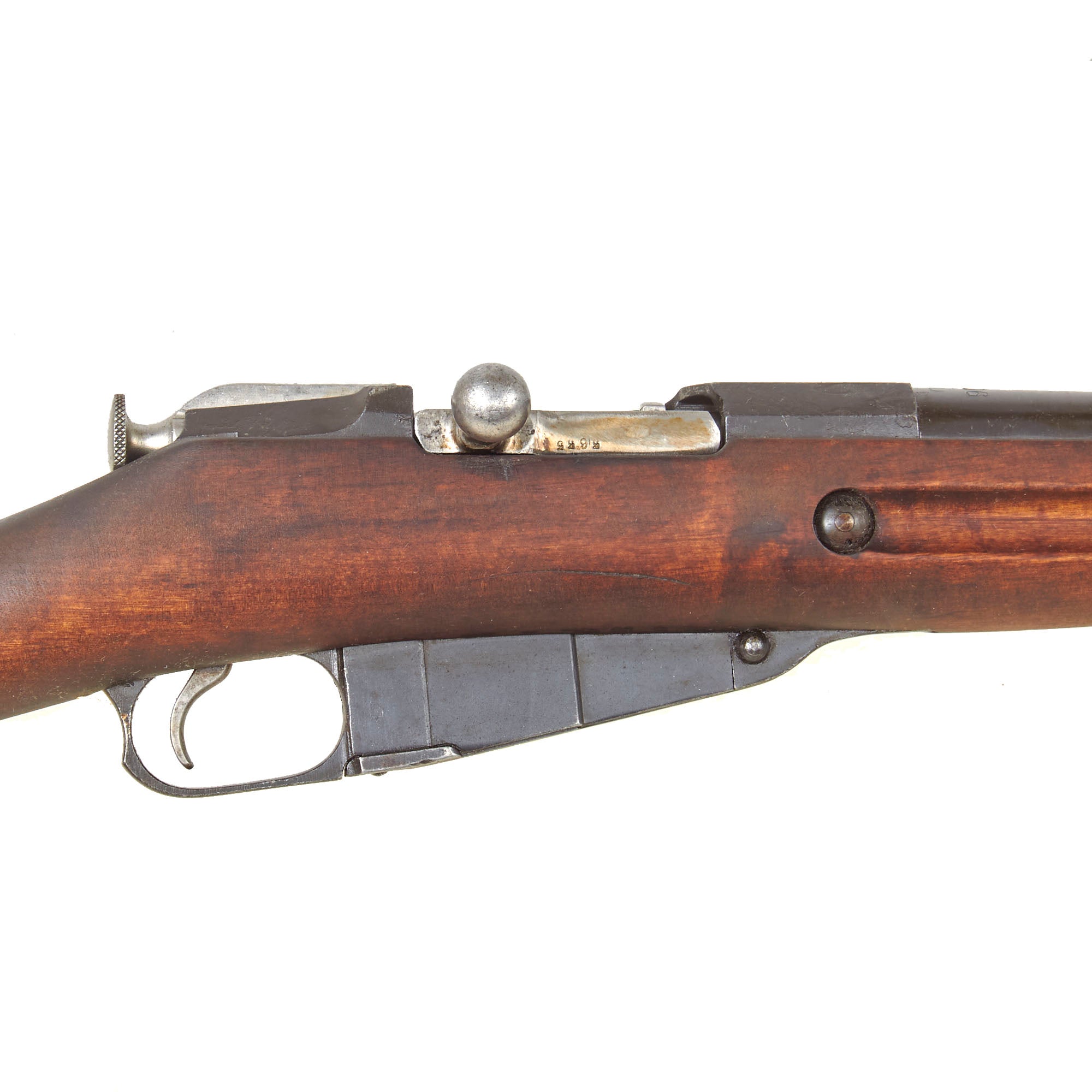 As with most, this example has the cross bolt to reinforce the stock against recoil, and the rear sight correctly goes up to 3200 арши́ны (arshíny), an archaic measurement used by Russia through the first world war. Roughly equal to 71.12 cm, the ranges on the left side of the sight base (originally numbered) were remarked 2 to 6 but then crossed out, and new measurements in meters (2 to 8 1/2) added in hundreds of meters (12 x 100 arshíny = 8 1/2 x 100m) on the right side. We do not know what type of ranges the left side was first renumbered for, and this is the first time we have seen 2 to 6 marked. The M/91 was the most widely issued Finnish rifle in both the Winter War and the Continuation War.