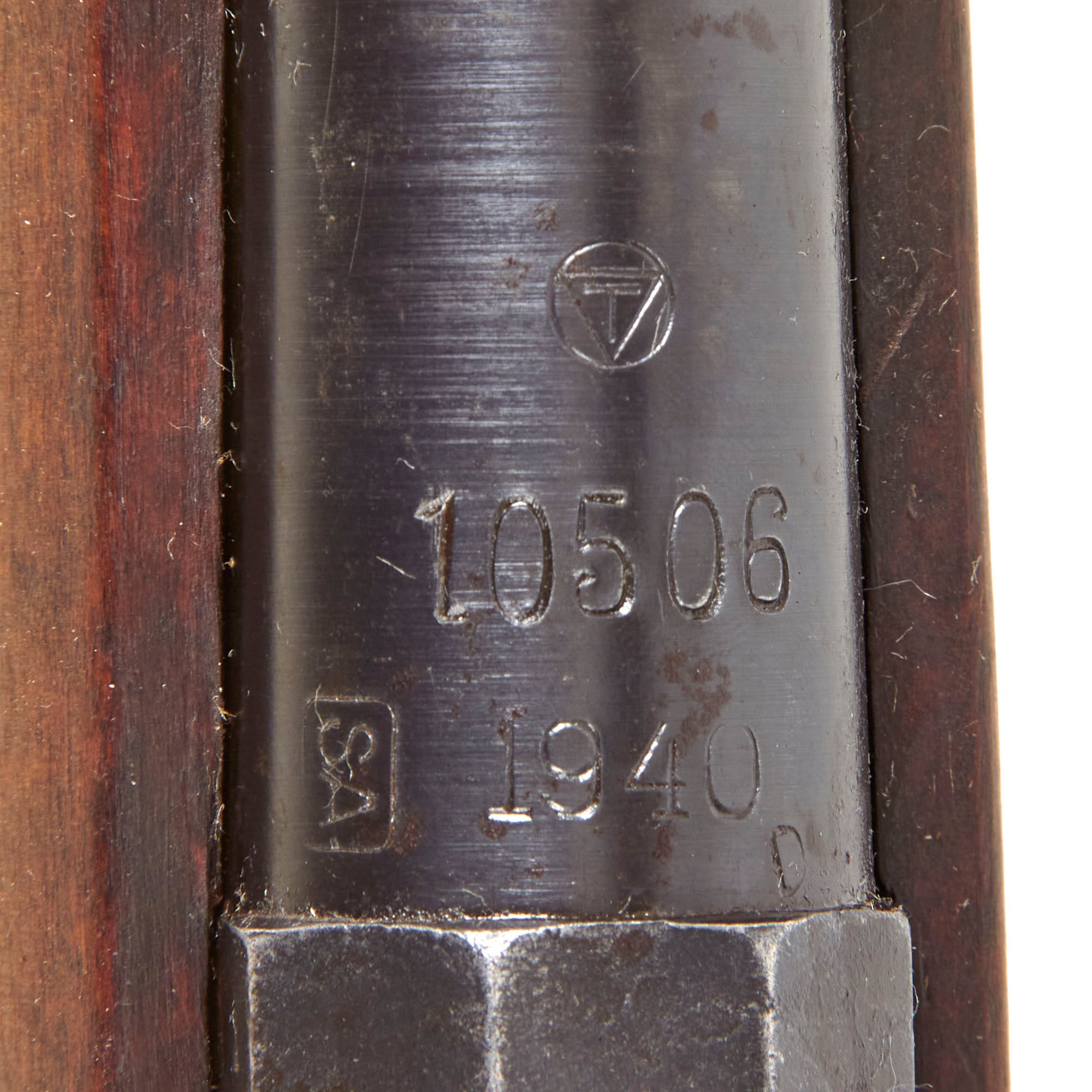 This example looks to have either been converted very late into a Finnish M/91 Mosin-Nagant, or possibly was re-barreled during the years between the Winter War and the Continuation war, and still was kept in the original M/91 configuration. It is fitted with a Finnish barrel dated 1940 on the top just above to the receiver. Next to the sight, is is marked with the "T" in a Triangle inside a Circle over serial number 10506. This is the marking of Oy Tikkakoski Ab, or "Tika", a manufacturer of sewing machines that was purchased by a German arms dealer Willi Daugs in 1930. It then began manufacturing arms, and this is the marking seem on M91 rifle barrels produced during 1930s and 40s. The right side of the barrel by the front sight has import and caliber markings from Century Arms International of St. Albans, VT. This was imported with a large number of other Mosin-Nagant rifles from Finland, and all were marked, regardless of antique status.